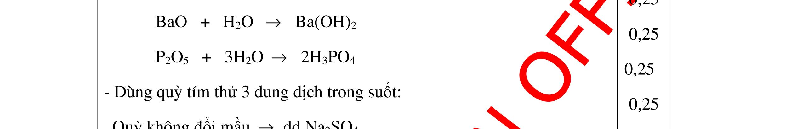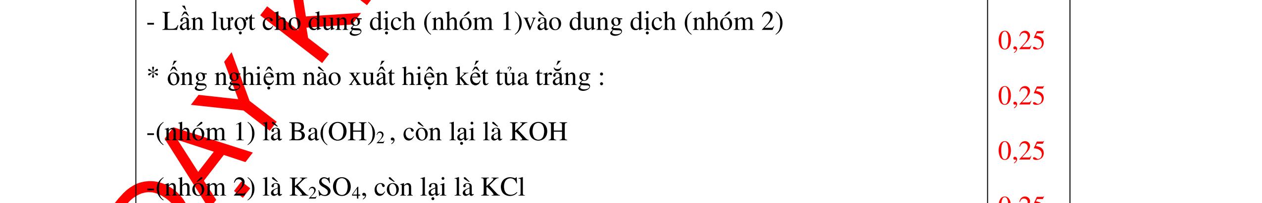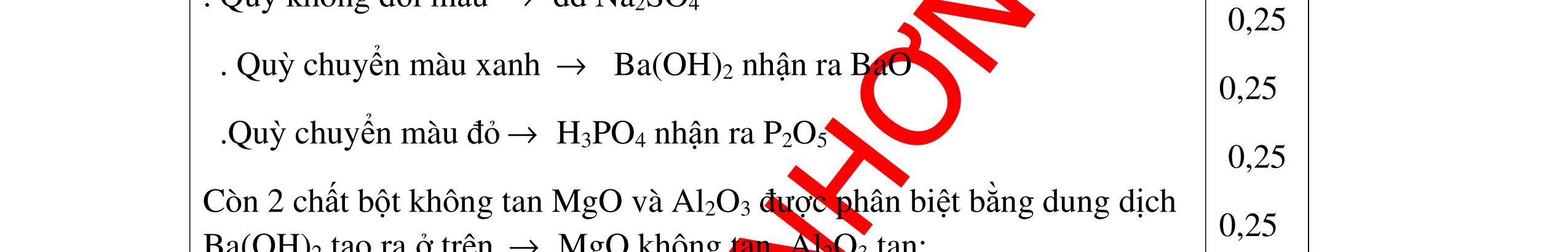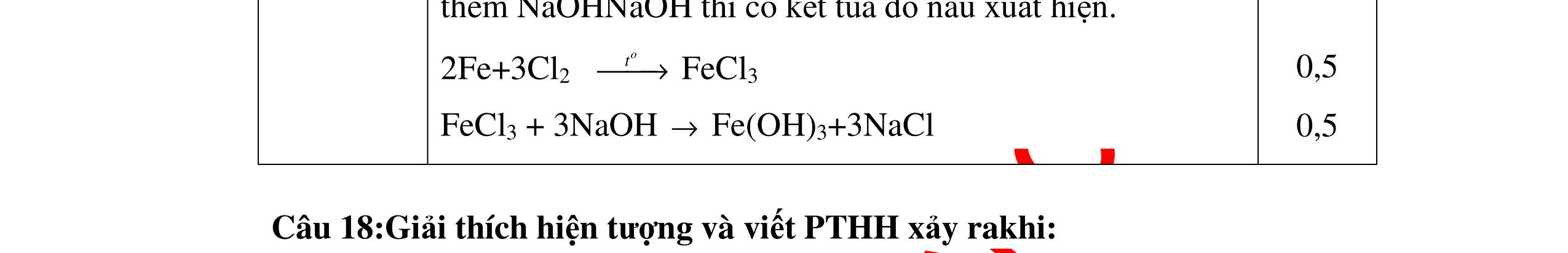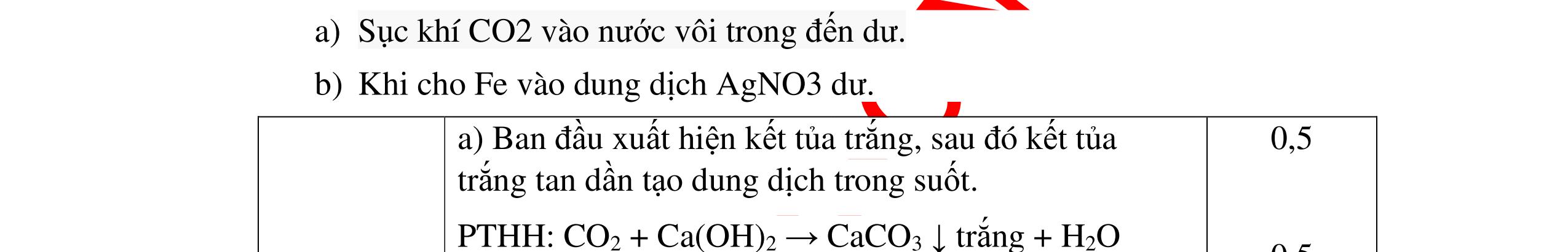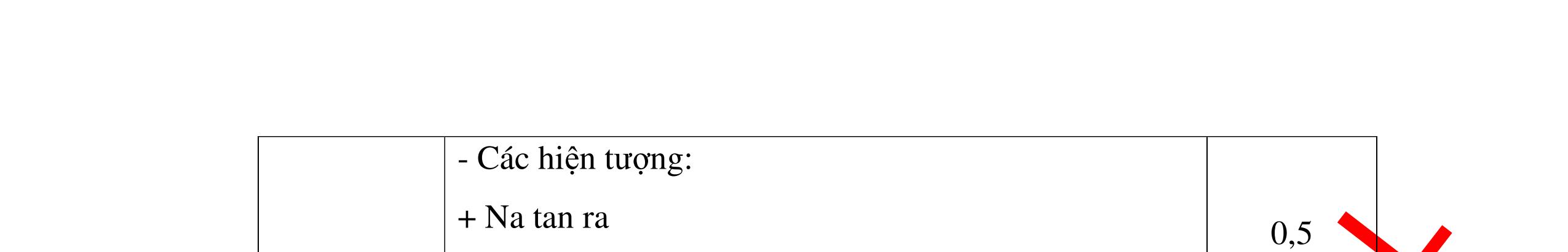 ch BaCl2. b) Cho một lá nhôm vào dung dịch HCl, sau đó dẫn khí thoát ra vào ống nghiệm đựng bột CuO nung nóng. 5. 2 điểm a) Xuất hiện kết tủa màu trắng Na2SO4 + BaCl2 → BaSO4 + 2NaCl b) Có khí không màu thoát ra, Al tan dần. Bột CuO màu đen chuyển dần thành màu đỏ (Cu), xuất hiện những giọt nước trên thành ống nghiệm. 2Al + 6HCl → 2AlCl3 + 3H2 H2 + CuO(đen) ot → Cu(đỏ)+ H2O 0,5 0,5 0,5 0,25 0,25 Câu 6: Nêu hiện tượng xảy ra của các thí nghiệm : a) Hòa tan một mẩu nhỏ vôi sống CaO vào nước b) Đốt cháy dây sắt có quấn quanh mẩu than trong lọ đựng khí oxi c) Đốt cháy photpho đỏ trong lọ đựng khí oxi sau đó hòa tan vào nước 6. 2 điểm a) CaO tan dần, phản ứng tỏa nhiều nhiệt CaO + H2O → Ca(OH)2 b) Sắt cháy sáng trong oxi, có chất rắn màu nâu đen rơi xuống đáy. 3Fe + 2O2 ot → Fe3O4 c) Photpho cháy sáng trong oxi với ngọn lửa chói, có khói trắng bám trong bình. 4P + 5O2 ot → 2P2O5 0,25 0,25 0,25 0,5 0,25 0,5