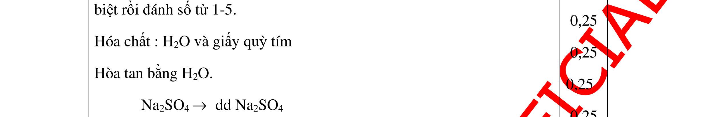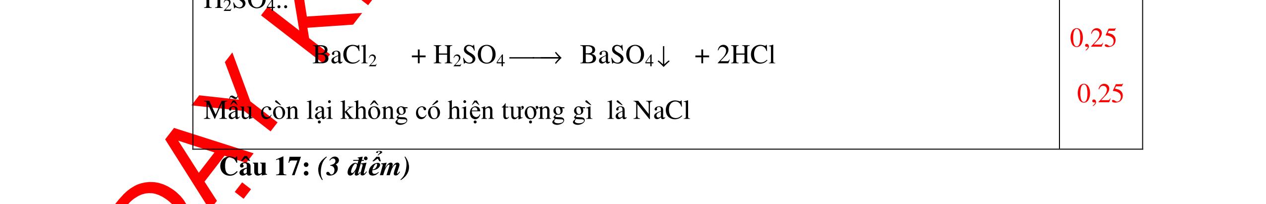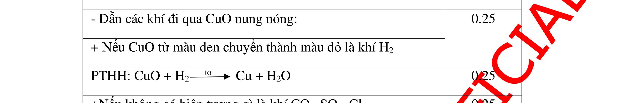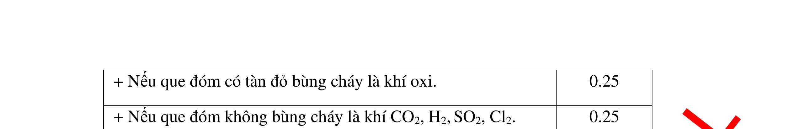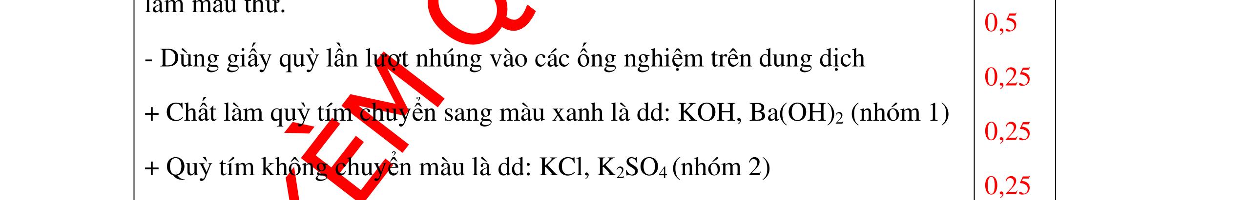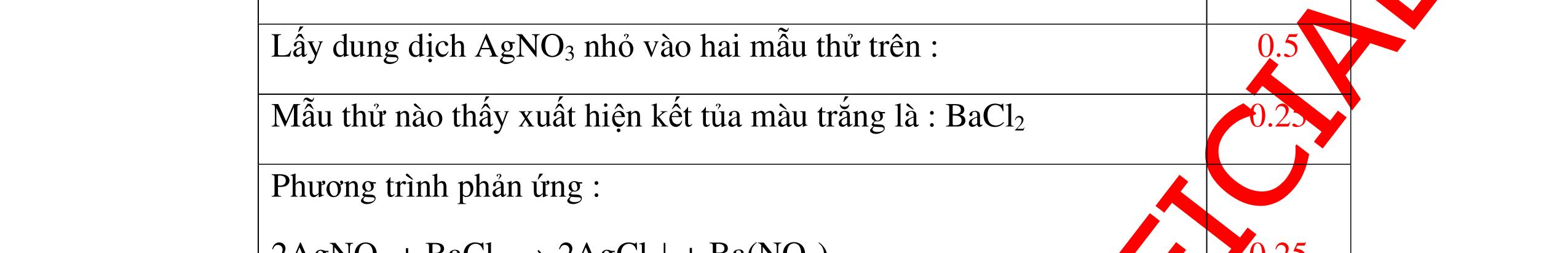 ch BaCl2. b) Cho một lá nhôm vào dung dịch HCl, sau đó dẫn khí thoát ra vào ống nghiệm đựng bột CuO nung nóng. 5. 2 điểm a) Xuất hiện kết tủa màu trắng Na2SO4 + BaCl2 → BaSO4 + 2NaCl b) Có khí không màu thoát ra, Al tan dần. Bột CuO màu đen chuyển dần thành màu đỏ (Cu), xuất hiện những giọt nước trên thành ống nghiệm. 2Al + 6HCl → 2AlCl3 + 3H2 H2 + CuO(đen) ot → Cu(đỏ)+ H2O 0,5 0,5 0,5 0,25 0,25 Câu 6: Nêu hiện tượng xảy ra của các thí nghiệm : a) Hòa tan một mẩu nhỏ vôi sống CaO vào nước b) Đốt cháy dây sắt có quấn quanh mẩu than trong lọ đựng khí oxi c) Đốt cháy photpho đỏ trong lọ đựng khí oxi sau đó hòa tan vào nước 6. 2 điểm a) CaO tan dần, phản ứng tỏa nhiều nhiệt CaO + H2O → Ca(OH)2 b) Sắt cháy sáng trong oxi, có chất rắn màu nâu đen rơi xuống đáy. 3Fe + 2O2 ot → Fe3O4 c) Photpho cháy sáng trong oxi với ngọn lửa chói, có khói trắng bám trong bình. 4P + 5O2 ot → 2P2O5 0,25 0,25 0,25 0,5 0,25 0,5