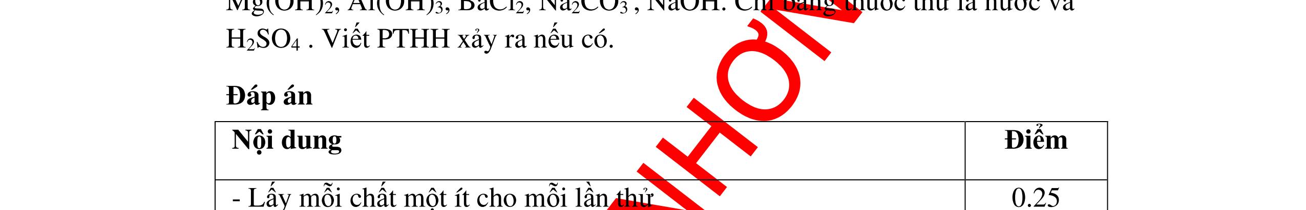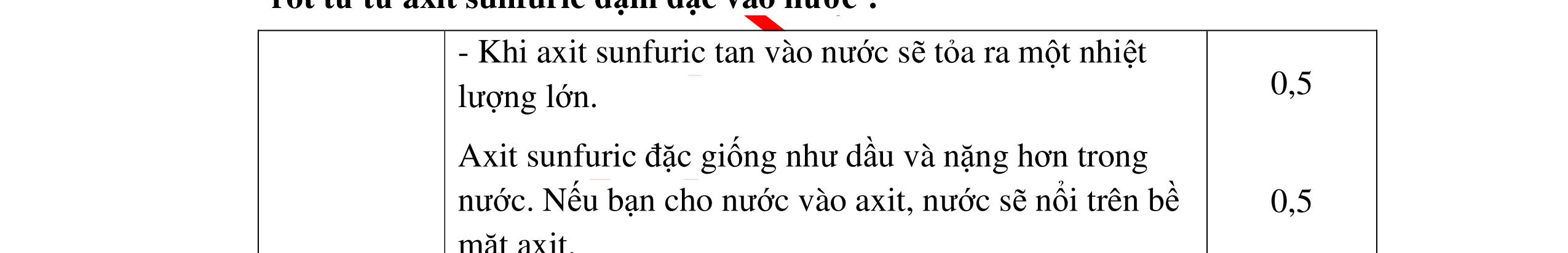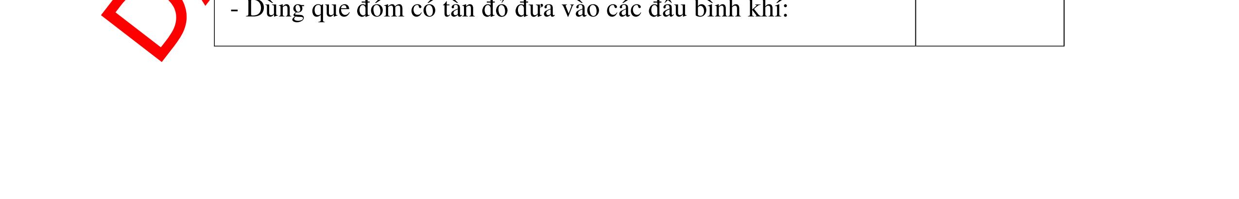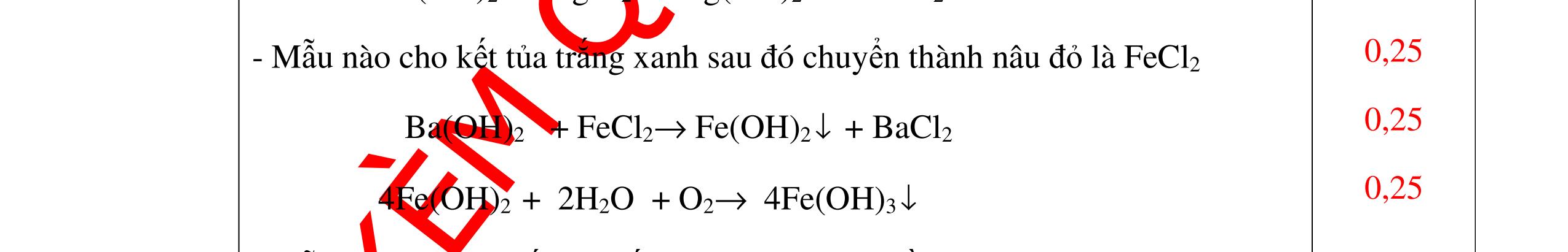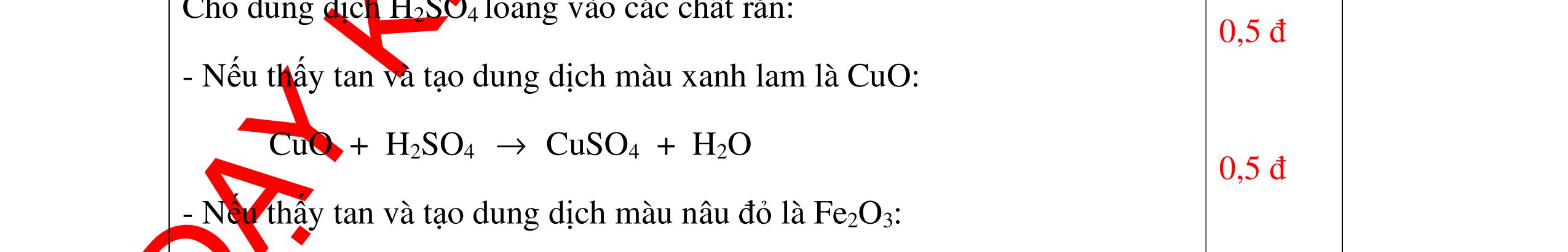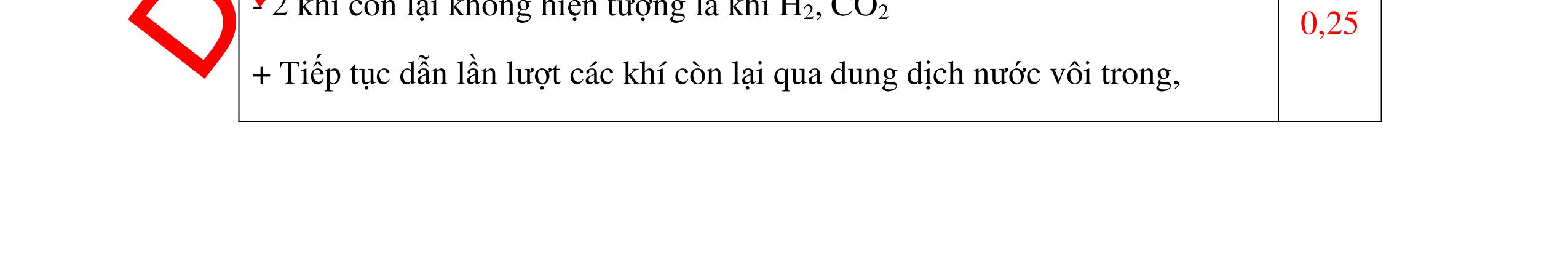 ch BaCl2. b) Cho một lá nhôm vào dung dịch HCl, sau đó dẫn khí thoát ra vào ống nghiệm đựng bột CuO nung nóng. 5. 2 điểm a) Xuất hiện kết tủa màu trắng Na2SO4 + BaCl2 → BaSO4 + 2NaCl b) Có khí không màu thoát ra, Al tan dần. Bột CuO màu đen chuyển dần thành màu đỏ (Cu), xuất hiện những giọt nước trên thành ống nghiệm. 2Al + 6HCl → 2AlCl3 + 3H2 H2 + CuO(đen) ot → Cu(đỏ)+ H2O 0,5 0,5 0,5 0,25 0,25 Câu 6: Nêu hiện tượng xảy ra của các thí nghiệm : a) Hòa tan một mẩu nhỏ vôi sống CaO vào nước b) Đốt cháy dây sắt có quấn quanh mẩu than trong lọ đựng khí oxi c) Đốt cháy photpho đỏ trong lọ đựng khí oxi sau đó hòa tan vào nước 6. 2 điểm a) CaO tan dần, phản ứng tỏa nhiều nhiệt CaO + H2O → Ca(OH)2 b) Sắt cháy sáng trong oxi, có chất rắn màu nâu đen rơi xuống đáy. 3Fe + 2O2 ot → Fe3O4 c) Photpho cháy sáng trong oxi với ngọn lửa chói, có khói trắng bám trong bình. 4P + 5O2 ot → 2P2O5 0,25 0,25 0,25 0,5 0,25 0,5