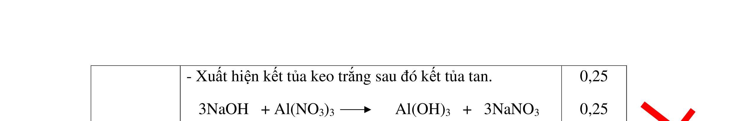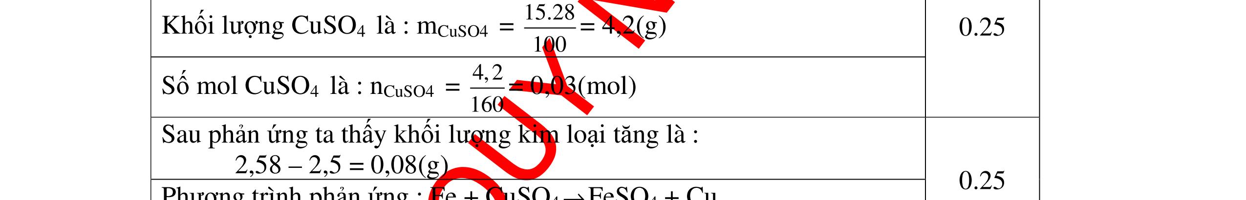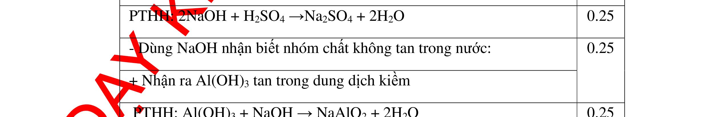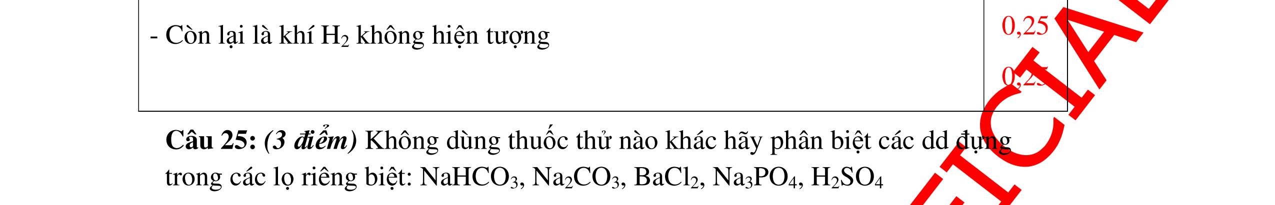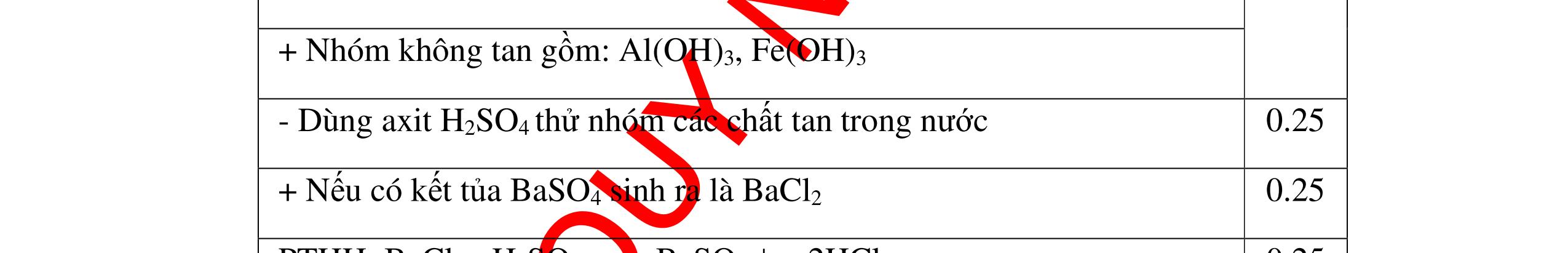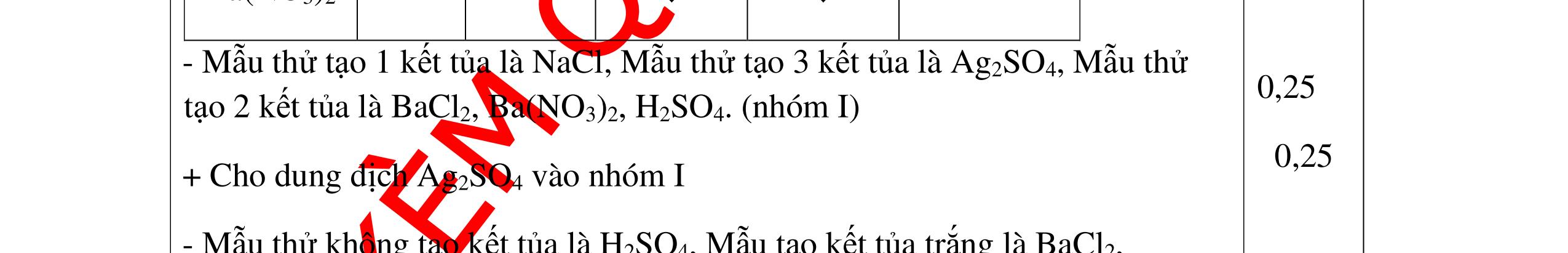 ch BaCl2. b) Cho một lá nhôm vào dung dịch HCl, sau đó dẫn khí thoát ra vào ống nghiệm đựng bột CuO nung nóng. 5. 2 điểm a) Xuất hiện kết tủa màu trắng Na2SO4 + BaCl2 → BaSO4 + 2NaCl b) Có khí không màu thoát ra, Al tan dần. Bột CuO màu đen chuyển dần thành màu đỏ (Cu), xuất hiện những giọt nước trên thành ống nghiệm. 2Al + 6HCl → 2AlCl3 + 3H2 H2 + CuO(đen) ot → Cu(đỏ)+ H2O 0,5 0,5 0,5 0,25 0,25 Câu 6: Nêu hiện tượng xảy ra của các thí nghiệm : a) Hòa tan một mẩu nhỏ vôi sống CaO vào nước b) Đốt cháy dây sắt có quấn quanh mẩu than trong lọ đựng khí oxi c) Đốt cháy photpho đỏ trong lọ đựng khí oxi sau đó hòa tan vào nước 6. 2 điểm a) CaO tan dần, phản ứng tỏa nhiều nhiệt CaO + H2O → Ca(OH)2 b) Sắt cháy sáng trong oxi, có chất rắn màu nâu đen rơi xuống đáy. 3Fe + 2O2 ot → Fe3O4 c) Photpho cháy sáng trong oxi với ngọn lửa chói, có khói trắng bám trong bình. 4P + 5O2 ot → 2P2O5 0,25 0,25 0,25 0,5 0,25 0,5