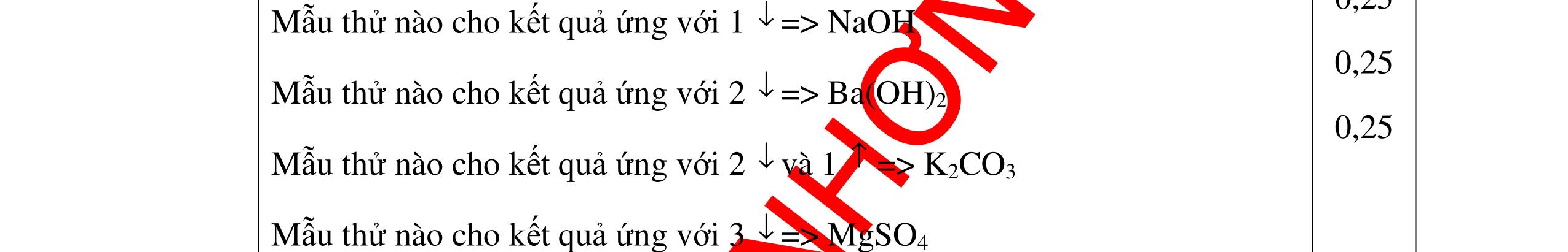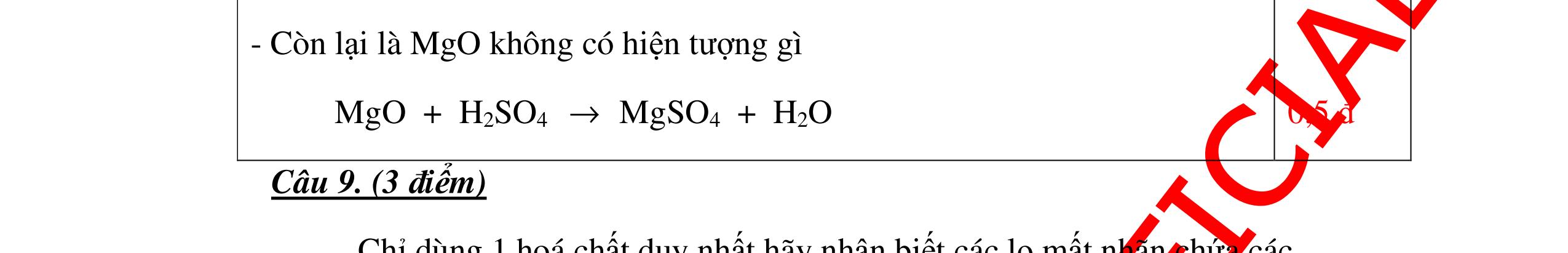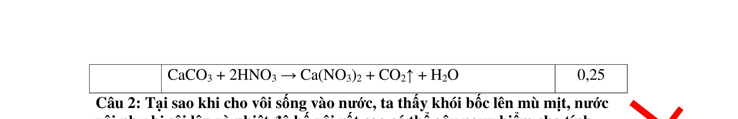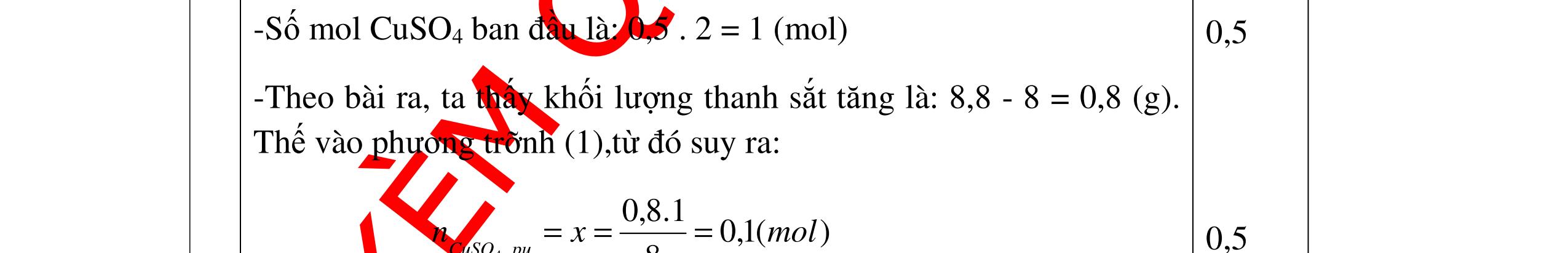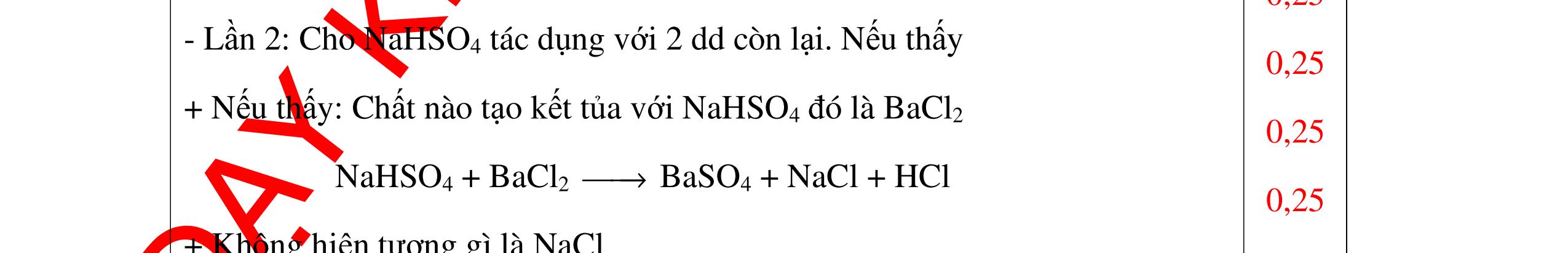 ch BaCl2. b) Cho một lá nhôm vào dung dịch HCl, sau đó dẫn khí thoát ra vào ống nghiệm đựng bột CuO nung nóng. 5. 2 điểm a) Xuất hiện kết tủa màu trắng Na2SO4 + BaCl2 → BaSO4 + 2NaCl b) Có khí không màu thoát ra, Al tan dần. Bột CuO màu đen chuyển dần thành màu đỏ (Cu), xuất hiện những giọt nước trên thành ống nghiệm. 2Al + 6HCl → 2AlCl3 + 3H2 H2 + CuO(đen) ot → Cu(đỏ)+ H2O 0,5 0,5 0,5 0,25 0,25 Câu 6: Nêu hiện tượng xảy ra của các thí nghiệm : a) Hòa tan một mẩu nhỏ vôi sống CaO vào nước b) Đốt cháy dây sắt có quấn quanh mẩu than trong lọ đựng khí oxi c) Đốt cháy photpho đỏ trong lọ đựng khí oxi sau đó hòa tan vào nước 6. 2 điểm a) CaO tan dần, phản ứng tỏa nhiều nhiệt CaO + H2O → Ca(OH)2 b) Sắt cháy sáng trong oxi, có chất rắn màu nâu đen rơi xuống đáy. 3Fe + 2O2 ot → Fe3O4 c) Photpho cháy sáng trong oxi với ngọn lửa chói, có khói trắng bám trong bình. 4P + 5O2 ot → 2P2O5 0,25 0,25 0,25 0,5 0,25 0,5
