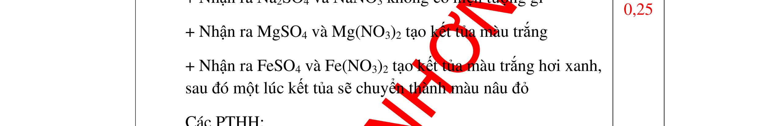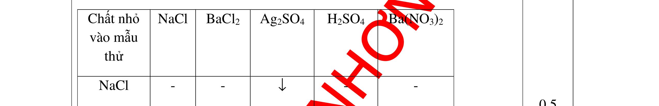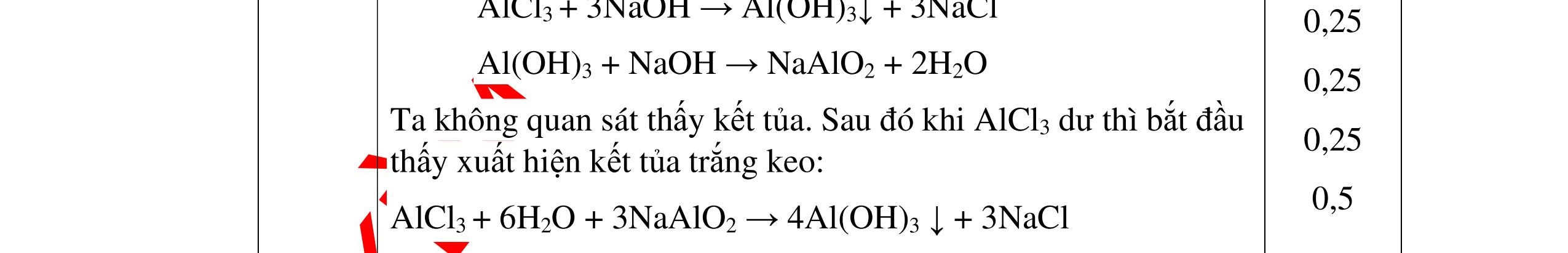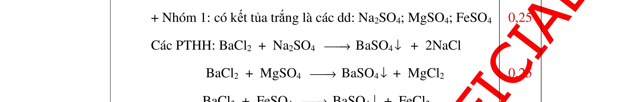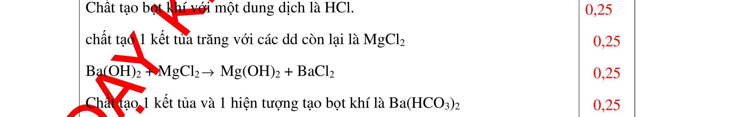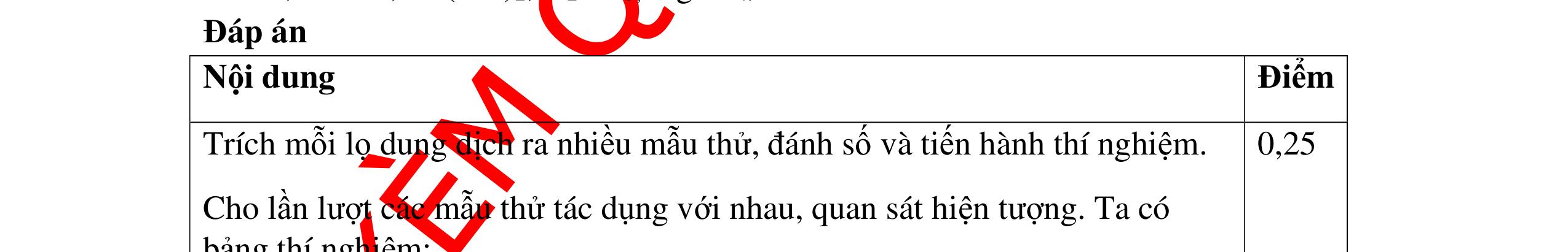 ch BaCl2. b) Cho một lá nhôm vào dung dịch HCl, sau đó dẫn khí thoát ra vào ống nghiệm đựng bột CuO nung nóng. 5. 2 điểm a) Xuất hiện kết tủa màu trắng Na2SO4 + BaCl2 → BaSO4 + 2NaCl b) Có khí không màu thoát ra, Al tan dần. Bột CuO màu đen chuyển dần thành màu đỏ (Cu), xuất hiện những giọt nước trên thành ống nghiệm. 2Al + 6HCl → 2AlCl3 + 3H2 H2 + CuO(đen) ot → Cu(đỏ)+ H2O 0,5 0,5 0,5 0,25 0,25 Câu 6: Nêu hiện tượng xảy ra của các thí nghiệm : a) Hòa tan một mẩu nhỏ vôi sống CaO vào nước b) Đốt cháy dây sắt có quấn quanh mẩu than trong lọ đựng khí oxi c) Đốt cháy photpho đỏ trong lọ đựng khí oxi sau đó hòa tan vào nước 6. 2 điểm a) CaO tan dần, phản ứng tỏa nhiều nhiệt CaO + H2O → Ca(OH)2 b) Sắt cháy sáng trong oxi, có chất rắn màu nâu đen rơi xuống đáy. 3Fe + 2O2 ot → Fe3O4 c) Photpho cháy sáng trong oxi với ngọn lửa chói, có khói trắng bám trong bình. 4P + 5O2 ot → 2P2O5 0,25 0,25 0,25 0,5 0,25 0,5