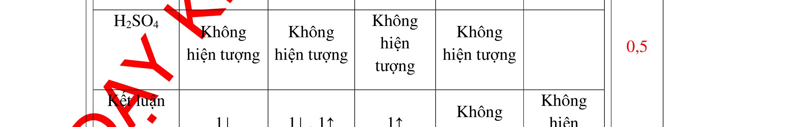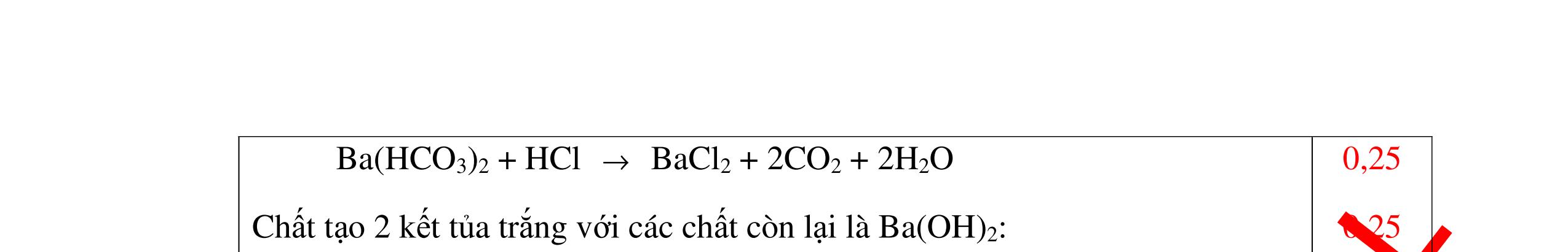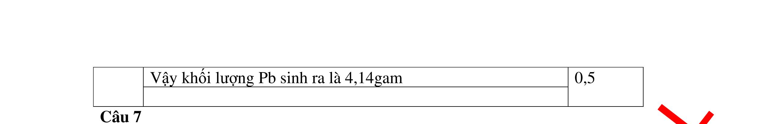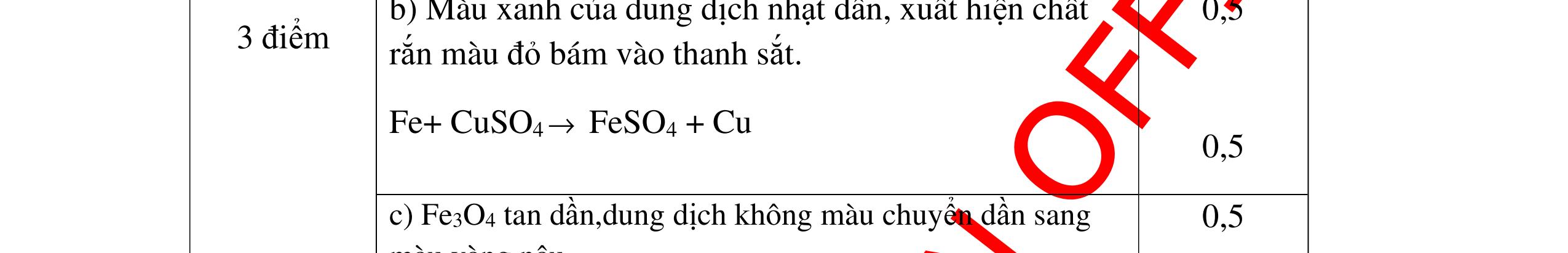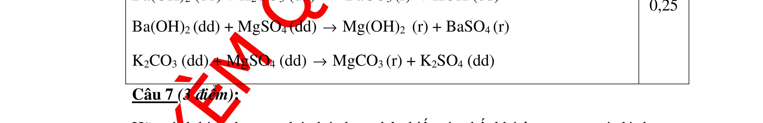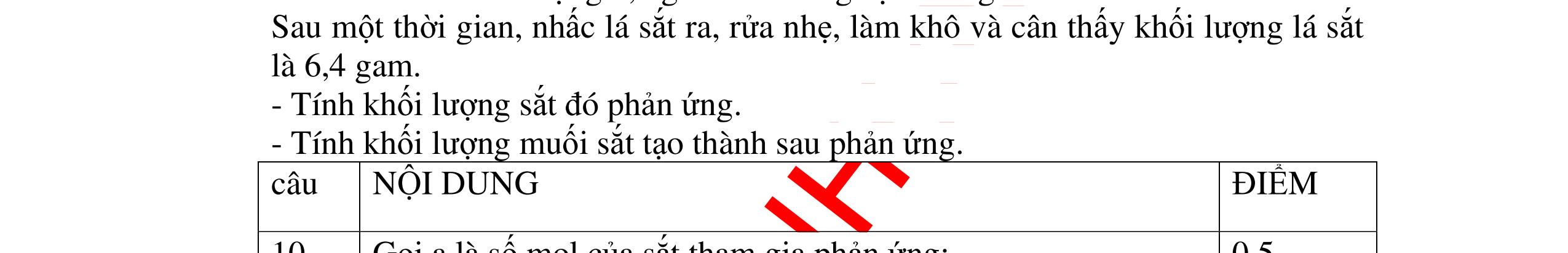 ch BaCl2. b) Cho một lá nhôm vào dung dịch HCl, sau đó dẫn khí thoát ra vào ống nghiệm đựng bột CuO nung nóng. 5. 2 điểm a) Xuất hiện kết tủa màu trắng Na2SO4 + BaCl2 → BaSO4 + 2NaCl b) Có khí không màu thoát ra, Al tan dần. Bột CuO màu đen chuyển dần thành màu đỏ (Cu), xuất hiện những giọt nước trên thành ống nghiệm. 2Al + 6HCl → 2AlCl3 + 3H2 H2 + CuO(đen) ot → Cu(đỏ)+ H2O 0,5 0,5 0,5 0,25 0,25 Câu 6: Nêu hiện tượng xảy ra của các thí nghiệm : a) Hòa tan một mẩu nhỏ vôi sống CaO vào nước b) Đốt cháy dây sắt có quấn quanh mẩu than trong lọ đựng khí oxi c) Đốt cháy photpho đỏ trong lọ đựng khí oxi sau đó hòa tan vào nước 6. 2 điểm a) CaO tan dần, phản ứng tỏa nhiều nhiệt CaO + H2O → Ca(OH)2 b) Sắt cháy sáng trong oxi, có chất rắn màu nâu đen rơi xuống đáy. 3Fe + 2O2 ot → Fe3O4 c) Photpho cháy sáng trong oxi với ngọn lửa chói, có khói trắng bám trong bình. 4P + 5O2 ot → 2P2O5 0,25 0,25 0,25 0,5 0,25 0,5