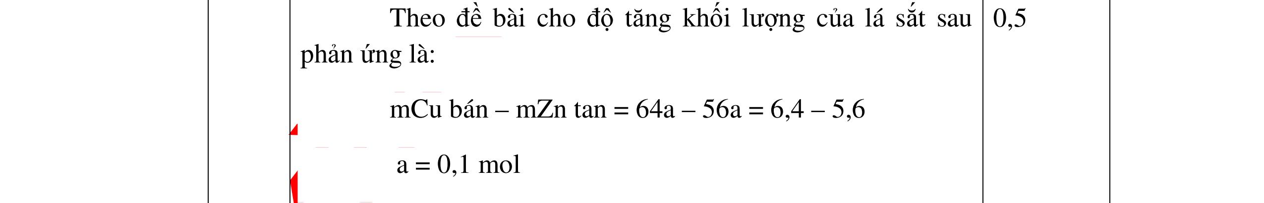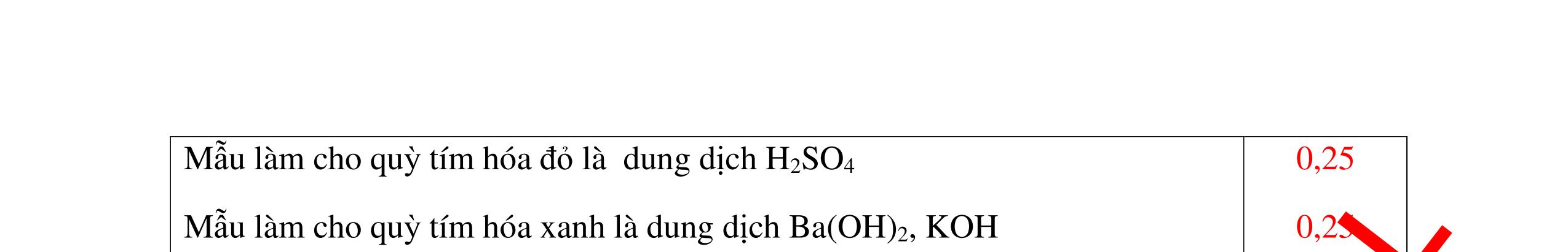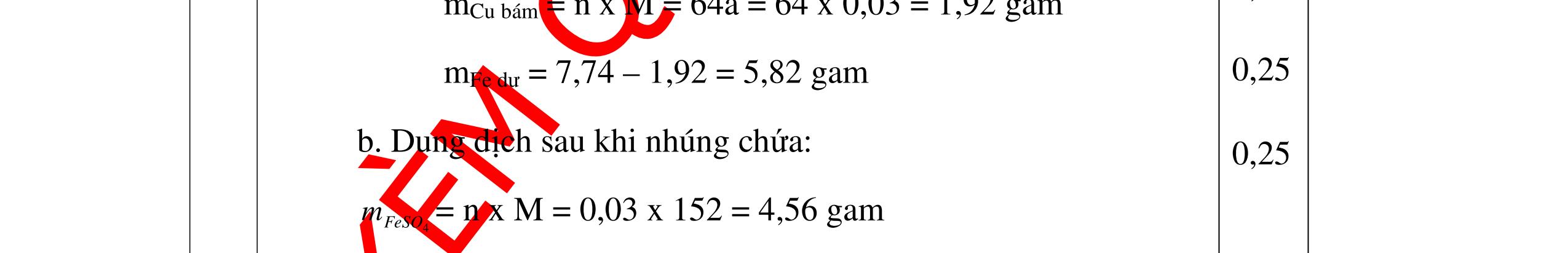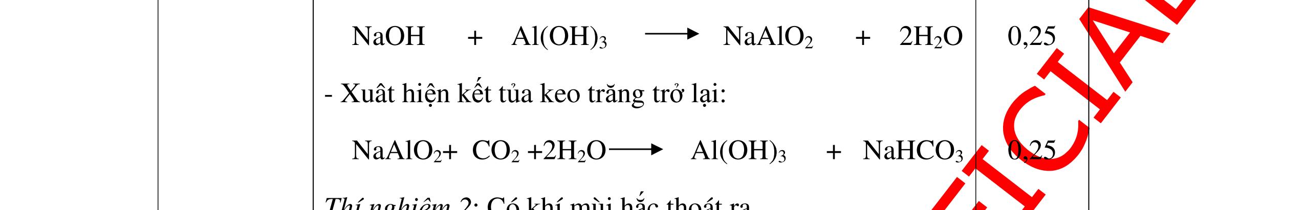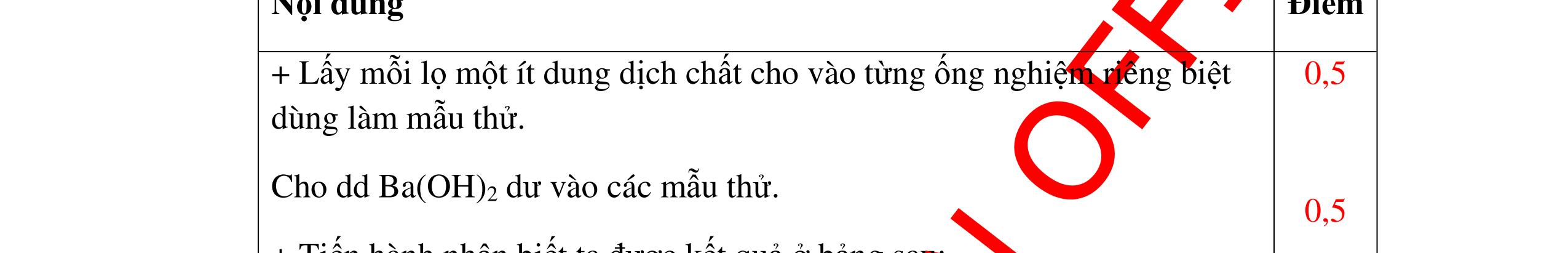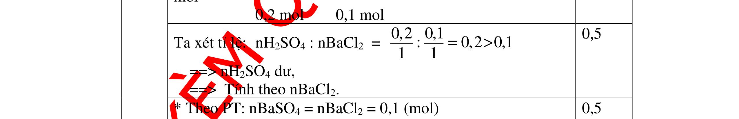 ch BaCl2. b) Cho một lá nhôm vào dung dịch HCl, sau đó dẫn khí thoát ra vào ống nghiệm đựng bột CuO nung nóng. 5. 2 điểm a) Xuất hiện kết tủa màu trắng Na2SO4 + BaCl2 → BaSO4 + 2NaCl b) Có khí không màu thoát ra, Al tan dần. Bột CuO màu đen chuyển dần thành màu đỏ (Cu), xuất hiện những giọt nước trên thành ống nghiệm. 2Al + 6HCl → 2AlCl3 + 3H2 H2 + CuO(đen) ot → Cu(đỏ)+ H2O 0,5 0,5 0,5 0,25 0,25 Câu 6: Nêu hiện tượng xảy ra của các thí nghiệm : a) Hòa tan một mẩu nhỏ vôi sống CaO vào nước b) Đốt cháy dây sắt có quấn quanh mẩu than trong lọ đựng khí oxi c) Đốt cháy photpho đỏ trong lọ đựng khí oxi sau đó hòa tan vào nước 6. 2 điểm a) CaO tan dần, phản ứng tỏa nhiều nhiệt CaO + H2O → Ca(OH)2 b) Sắt cháy sáng trong oxi, có chất rắn màu nâu đen rơi xuống đáy. 3Fe + 2O2 ot → Fe3O4 c) Photpho cháy sáng trong oxi với ngọn lửa chói, có khói trắng bám trong bình. 4P + 5O2 ot → 2P2O5 0,25 0,25 0,25 0,5 0,25 0,5