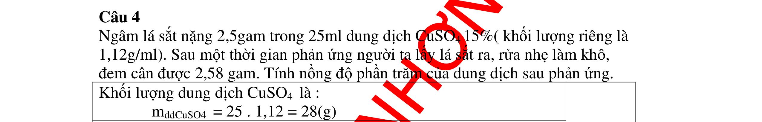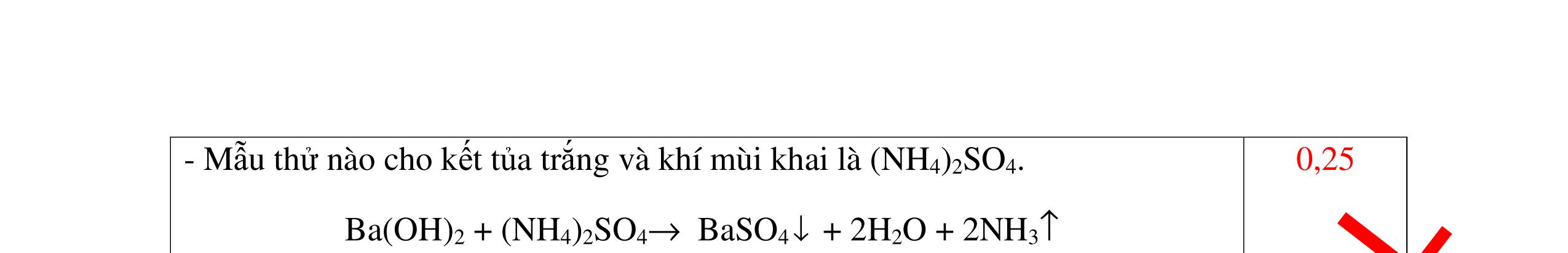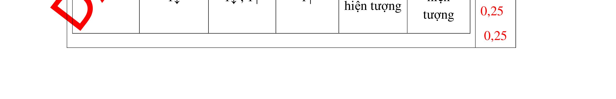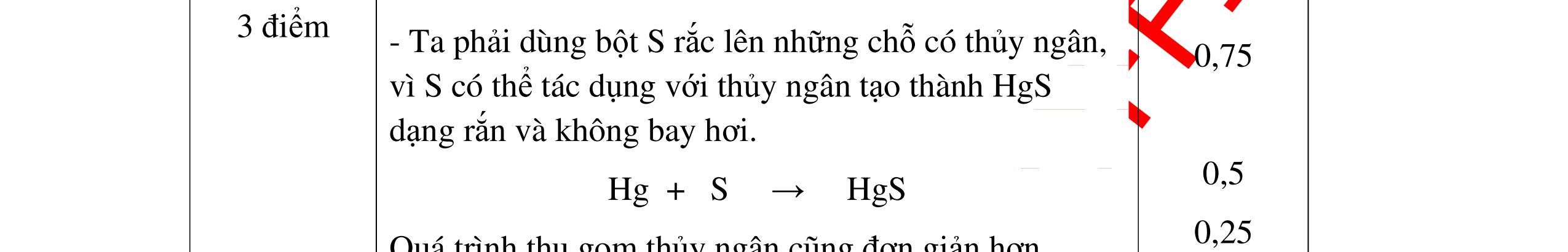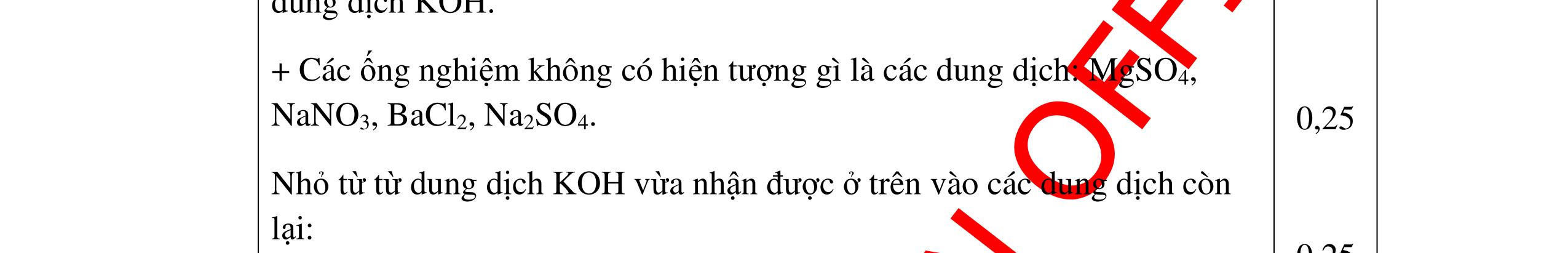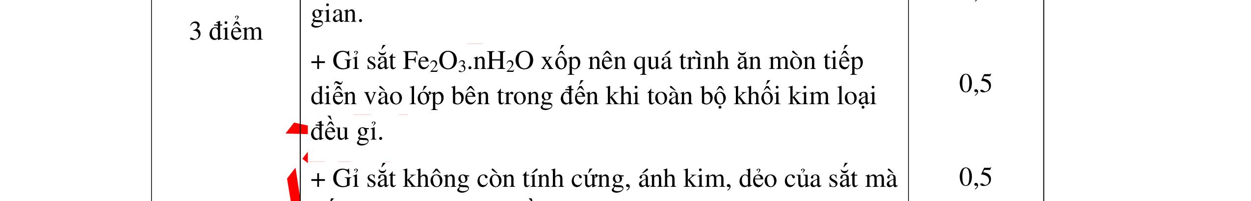 ch BaCl2. b) Cho một lá nhôm vào dung dịch HCl, sau đó dẫn khí thoát ra vào ống nghiệm đựng bột CuO nung nóng. 5. 2 điểm a) Xuất hiện kết tủa màu trắng Na2SO4 + BaCl2 → BaSO4 + 2NaCl b) Có khí không màu thoát ra, Al tan dần. Bột CuO màu đen chuyển dần thành màu đỏ (Cu), xuất hiện những giọt nước trên thành ống nghiệm. 2Al + 6HCl → 2AlCl3 + 3H2 H2 + CuO(đen) ot → Cu(đỏ)+ H2O 0,5 0,5 0,5 0,25 0,25 Câu 6: Nêu hiện tượng xảy ra của các thí nghiệm : a) Hòa tan một mẩu nhỏ vôi sống CaO vào nước b) Đốt cháy dây sắt có quấn quanh mẩu than trong lọ đựng khí oxi c) Đốt cháy photpho đỏ trong lọ đựng khí oxi sau đó hòa tan vào nước 6. 2 điểm a) CaO tan dần, phản ứng tỏa nhiều nhiệt CaO + H2O → Ca(OH)2 b) Sắt cháy sáng trong oxi, có chất rắn màu nâu đen rơi xuống đáy. 3Fe + 2O2 ot → Fe3O4 c) Photpho cháy sáng trong oxi với ngọn lửa chói, có khói trắng bám trong bình. 4P + 5O2 ot → 2P2O5 0,25 0,25 0,25 0,5 0,25 0,5
