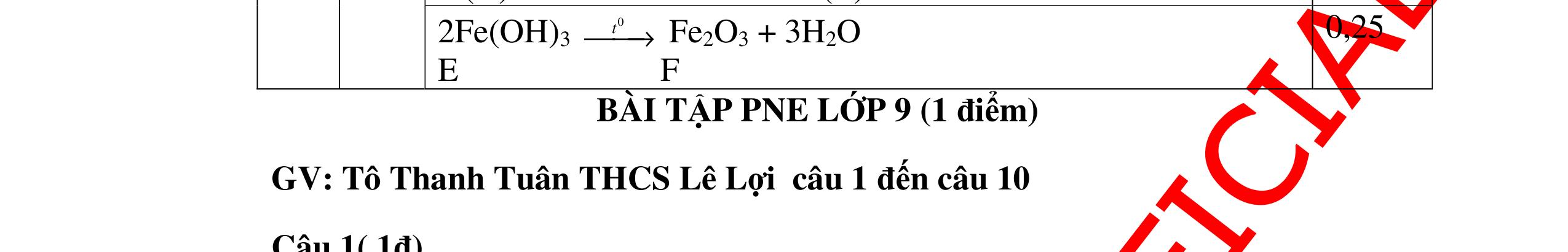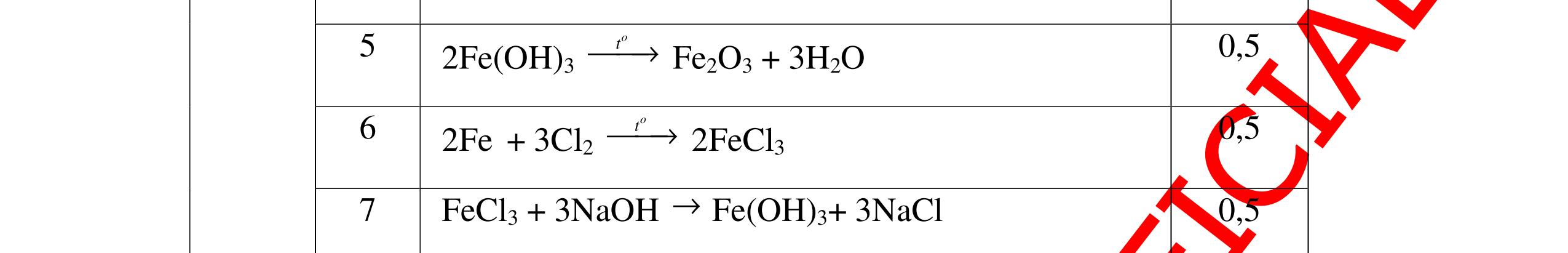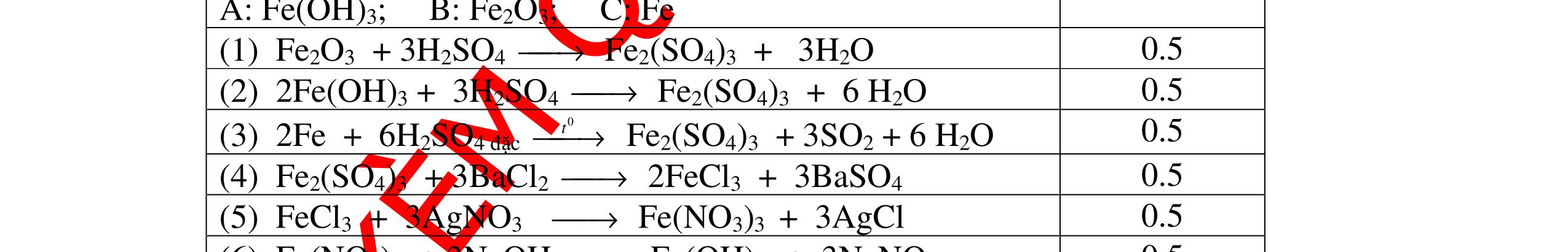 DẠYKÈMQUYNHƠNOFFICIAL Câu15(5 điểm) 1.Viết đầy đủ các phương trình hóa học theo sơ đồ chuyển hóa sau: Fe → Fe2O3 → FeCl3 →Fe(OH)3 → Fe2O3 → Fe 2.Từ H2SO4 loãng, H2SO4 đặc O2 và Cu trình bầy cách điều chế CuSO4 bằng hai cách 3. Từ Na2O, CaO, H2O và các dung dịch muối CuSO4, FeCl3 viết phương trình điều chế NaOH, Ca(OH)2, Cu(OH)2, Fe(OH)3 14a Thay các chữ cái A= H2O; B= KClO3; C= O2, D= H2 0,5 1 2H2O Điệnphân 2H2 + O2 0.25 2 2KMnO4 to K2MnO4 + MnO2 + O2 0.25 3 2KClO3 to 2KCl + 3O2 0.25 4 2KNO3 to 2KNO2 + 3O2 0.25 5 2O2 + 3Fe to Fe3O4 0.25 6 Fe3O4 + 4H2 to 3Fe + 4H2O 0.25 7,9 Fe + 2HCl → FeCl2 + H2 0.25