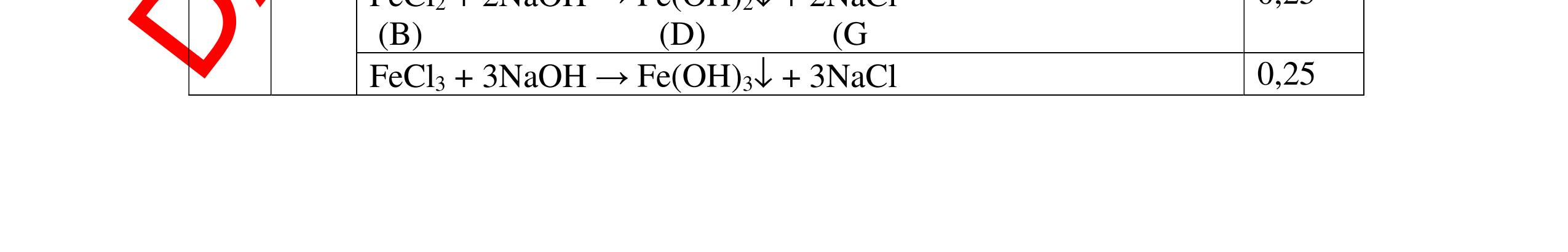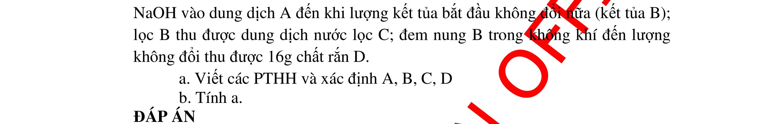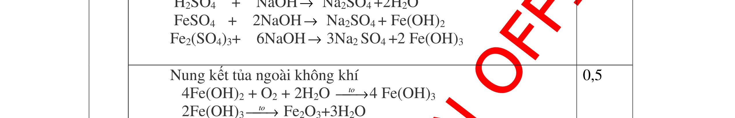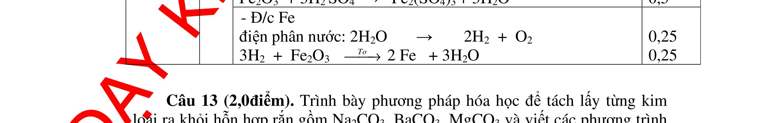 DẠYKÈMQUYNHƠNOFFICIAL Câu15(5 điểm) 1.Viết đầy đủ các phương trình hóa học theo sơ đồ chuyển hóa sau: Fe → Fe2O3 → FeCl3 →Fe(OH)3 → Fe2O3 → Fe 2.Từ H2SO4 loãng, H2SO4 đặc O2 và Cu trình bầy cách điều chế CuSO4 bằng hai cách 3. Từ Na2O, CaO, H2O và các dung dịch muối CuSO4, FeCl3 viết phương trình điều chế NaOH, Ca(OH)2, Cu(OH)2, Fe(OH)3 14a Thay các chữ cái A= H2O; B= KClO3; C= O2, D= H2 0,5 1 2H2O Điệnphân 2H2 + O2 0.25 2 2KMnO4 to K2MnO4 + MnO2 + O2 0.25 3 2KClO3 to 2KCl + 3O2 0.25 4 2KNO3 to 2KNO2 + 3O2 0.25 5 2O2 + 3Fe to Fe3O4 0.25 6 Fe3O4 + 4H2 to 3Fe + 4H2O 0.25 7,9 Fe + 2HCl → FeCl2 + H2 0.25