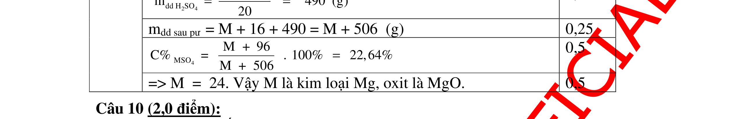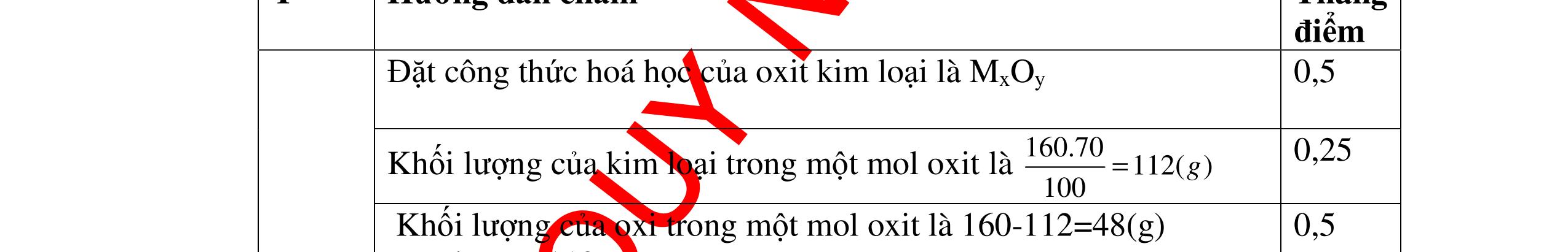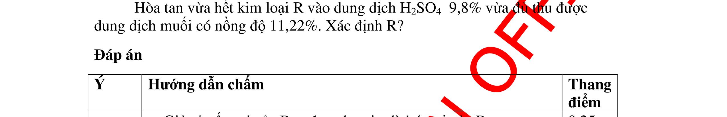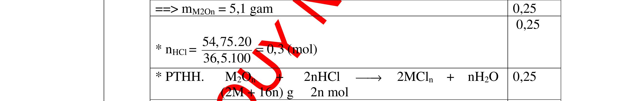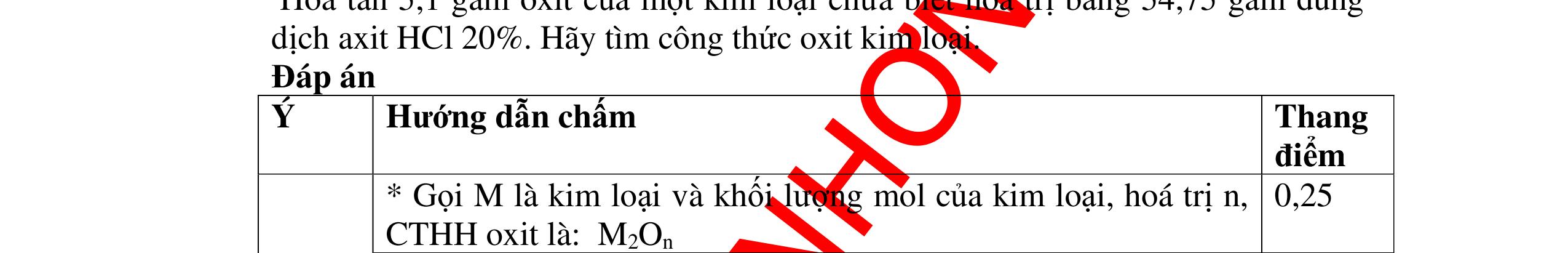 DẠYKÈMQUYNHƠNOFFICIAL 2,5 điểm PTHH: 2M + Cl2 →2MCl 2M(g) (2M + 71)g 9,2g 23,4g Ta có: 23,4 . 2M = 9,2(2M + 71) suy ra: M = 23. Kim loại có khối lượng nguyên tử bằng 23 là Na. Vậy muối thu được là: NaCl 0,75 0,75 0,25 0,5 Câu 12: Hoà tan 3,06g oxit MxOy bằng dung dich HNO3 dư sau đó cô cạn thì thu được 5,22g muối khan. Hãy xác định kim loại M biết nó chỉ có một hoá trị duy nhất. Bài làm: 12. 2,5 điểm PTHH: MxOy + 2yHNO3 → xM(NO3)2y/x + yH2O Từ PTPƯ ta có tỉ lệ: 3,065,22 16124 xx MyMy = ++ M = 68,5.2y/x Trong đó: Đặt 2y/x = n là hoá trị của kim loại. Vậy M = 68,5.n (*) Cho n các giá trị 1, 2, 3, 4. Từ (*) M = 137 và n =2 là phù hợp. Do đó M là Ba, hoá trị II. 0,5 0,5 0,5 0,25 0,25 0,5 Câu 13: Khi hoà tan một lượng của một oxit kim loại hoá trị II vào một lượng vừa đủ dung dịch axit H2SO4 4,9%, người ta thu được một dung dịch muối có nồng độ 5,78%. Xác định công thức của oxit trên. Bài làm: 13. 2,5 điểm Đặt công thức của oxit là RO PTHH: RO + H2SO4 → RSO4 + H2O (MR + 16) 98g (MR + 96)g Giả sử hoà tan 1 mol (hay MR + 16)g RO Khối lượng dd RSO4 (5,87%) = (MR + 16) + (98 : 4,9).100 = MR + 2016 C% = 96 2016 R R M M + + .100% = 5,87% 0,25 0,5 0,25 0,5 0,5