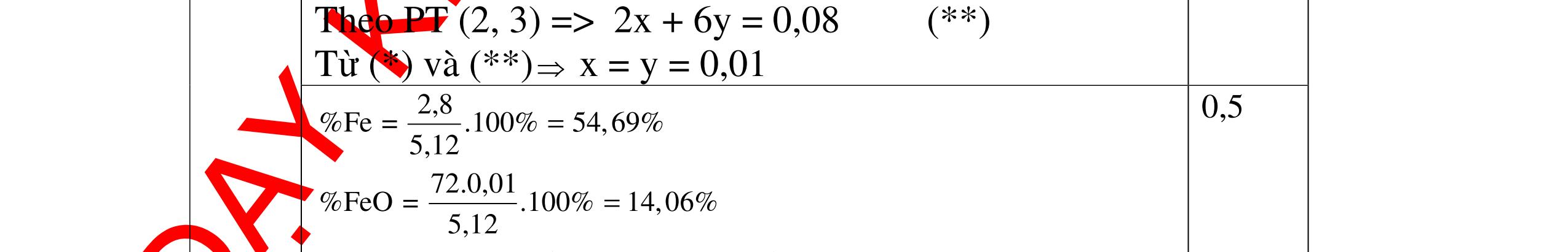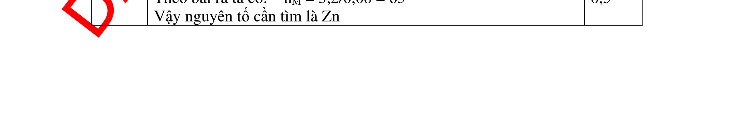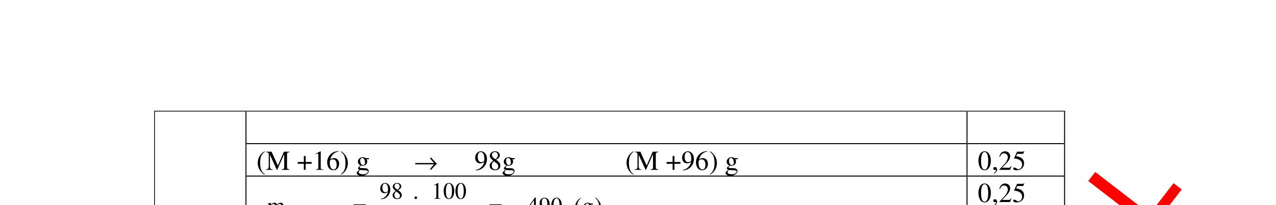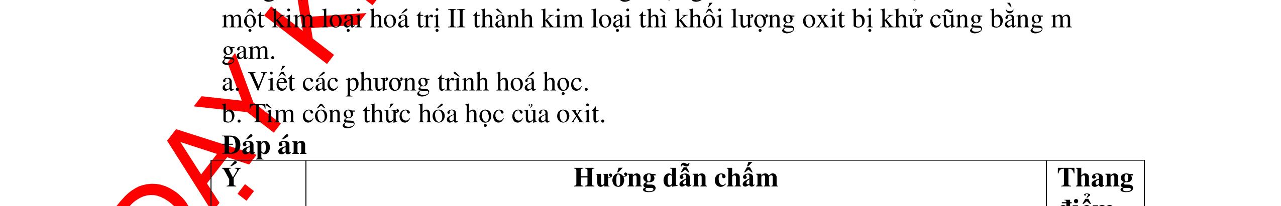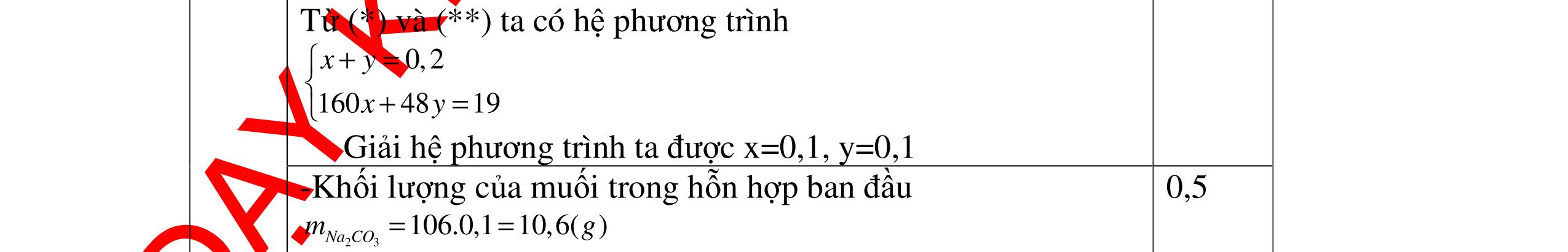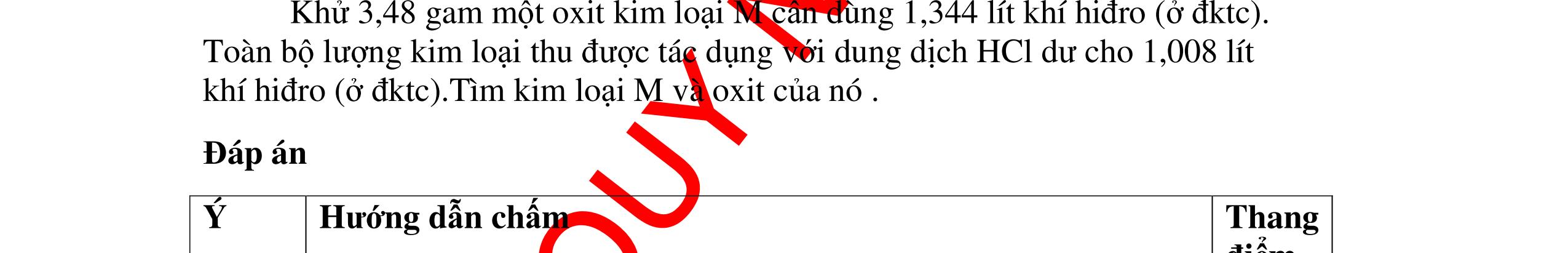 DẠYKÈMQUYNHƠNOFFICIAL 2,5 điểm PTHH: 2M + Cl2 →2MCl 2M(g) (2M + 71)g 9,2g 23,4g Ta có: 23,4 . 2M = 9,2(2M + 71) suy ra: M = 23. Kim loại có khối lượng nguyên tử bằng 23 là Na. Vậy muối thu được là: NaCl 0,75 0,75 0,25 0,5 Câu 12: Hoà tan 3,06g oxit MxOy bằng dung dich HNO3 dư sau đó cô cạn thì thu được 5,22g muối khan. Hãy xác định kim loại M biết nó chỉ có một hoá trị duy nhất. Bài làm: 12. 2,5 điểm PTHH: MxOy + 2yHNO3 → xM(NO3)2y/x + yH2O Từ PTPƯ ta có tỉ lệ: 3,065,22 16124 xx MyMy = ++ M = 68,5.2y/x Trong đó: Đặt 2y/x = n là hoá trị của kim loại. Vậy M = 68,5.n (*) Cho n các giá trị 1, 2, 3, 4. Từ (*) M = 137 và n =2 là phù hợp. Do đó M là Ba, hoá trị II. 0,5 0,5 0,5 0,25 0,25 0,5 Câu 13: Khi hoà tan một lượng của một oxit kim loại hoá trị II vào một lượng vừa đủ dung dịch axit H2SO4 4,9%, người ta thu được một dung dịch muối có nồng độ 5,78%. Xác định công thức của oxit trên. Bài làm: 13. 2,5 điểm Đặt công thức của oxit là RO PTHH: RO + H2SO4 → RSO4 + H2O (MR + 16) 98g (MR + 96)g Giả sử hoà tan 1 mol (hay MR + 16)g RO Khối lượng dd RSO4 (5,87%) = (MR + 16) + (98 : 4,9).100 = MR + 2016 C% = 96 2016 R R M M + + .100% = 5,87% 0,25 0,5 0,25 0,5 0,5