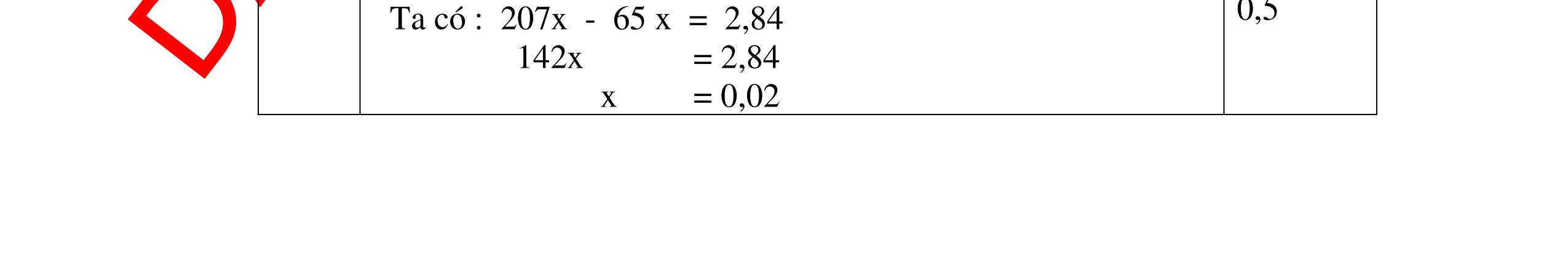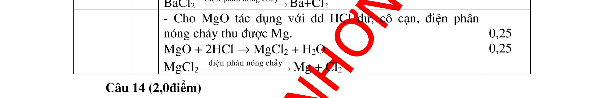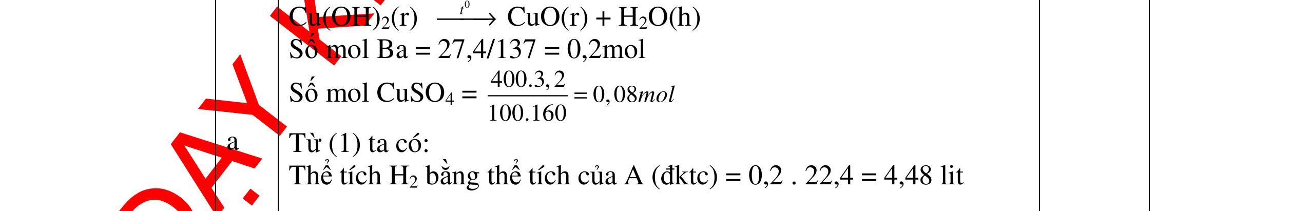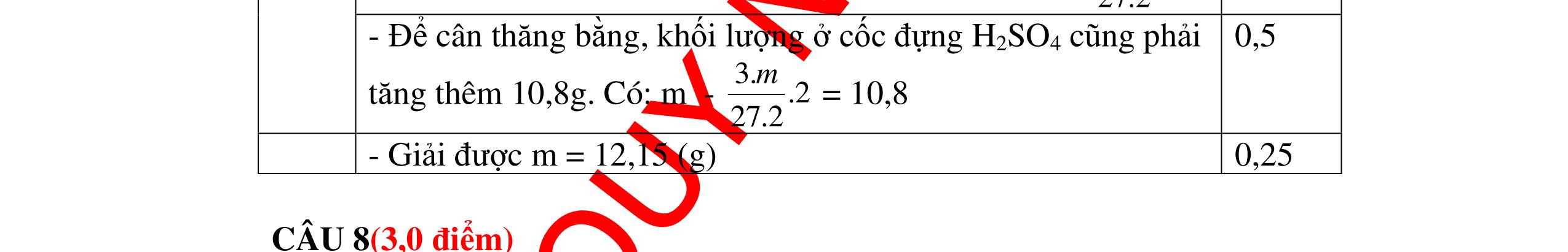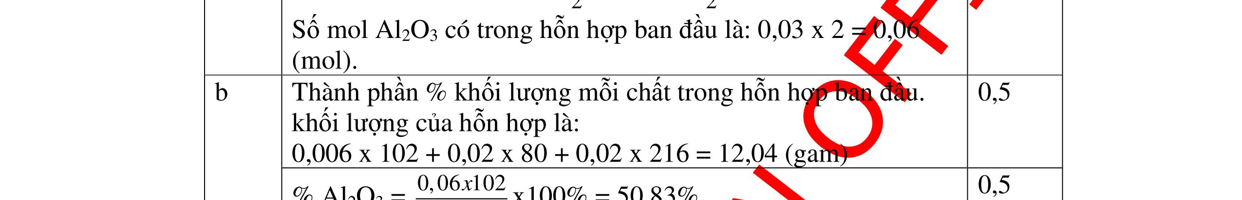 DẠYKÈMQUYNHƠNOFFICIAL 2,5 điểm PTHH: 2M + Cl2 →2MCl 2M(g) (2M + 71)g 9,2g 23,4g Ta có: 23,4 . 2M = 9,2(2M + 71) suy ra: M = 23. Kim loại có khối lượng nguyên tử bằng 23 là Na. Vậy muối thu được là: NaCl 0,75 0,75 0,25 0,5 Câu 12: Hoà tan 3,06g oxit MxOy bằng dung dich HNO3 dư sau đó cô cạn thì thu được 5,22g muối khan. Hãy xác định kim loại M biết nó chỉ có một hoá trị duy nhất. Bài làm: 12. 2,5 điểm PTHH: MxOy + 2yHNO3 → xM(NO3)2y/x + yH2O Từ PTPƯ ta có tỉ lệ: 3,065,22 16124 xx MyMy = ++ M = 68,5.2y/x Trong đó: Đặt 2y/x = n là hoá trị của kim loại. Vậy M = 68,5.n (*) Cho n các giá trị 1, 2, 3, 4. Từ (*) M = 137 và n =2 là phù hợp. Do đó M là Ba, hoá trị II. 0,5 0,5 0,5 0,25 0,25 0,5 Câu 13: Khi hoà tan một lượng của một oxit kim loại hoá trị II vào một lượng vừa đủ dung dịch axit H2SO4 4,9%, người ta thu được một dung dịch muối có nồng độ 5,78%. Xác định công thức của oxit trên. Bài làm: 13. 2,5 điểm Đặt công thức của oxit là RO PTHH: RO + H2SO4 → RSO4 + H2O (MR + 16) 98g (MR + 96)g Giả sử hoà tan 1 mol (hay MR + 16)g RO Khối lượng dd RSO4 (5,87%) = (MR + 16) + (98 : 4,9).100 = MR + 2016 C% = 96 2016 R R M M + + .100% = 5,87% 0,25 0,5 0,25 0,5 0,5