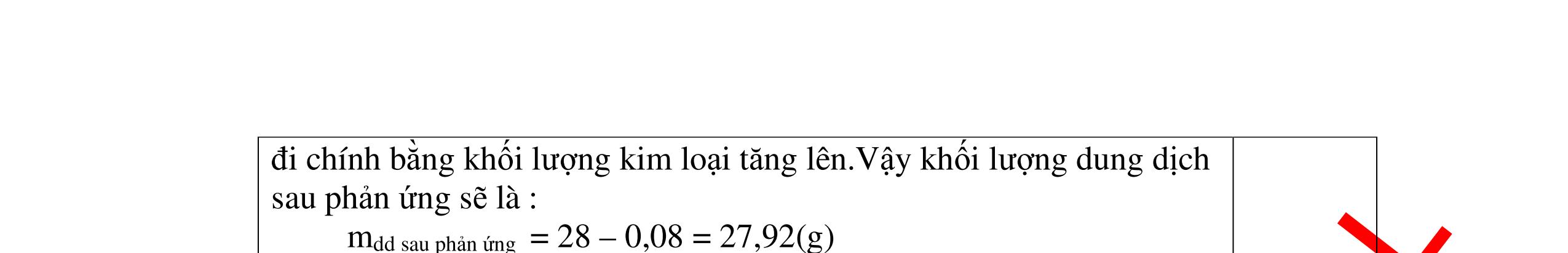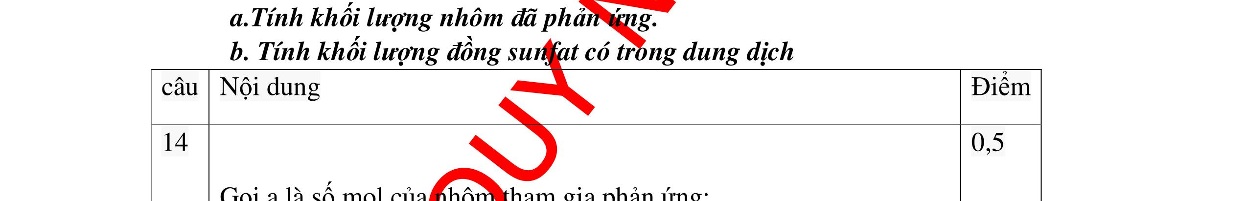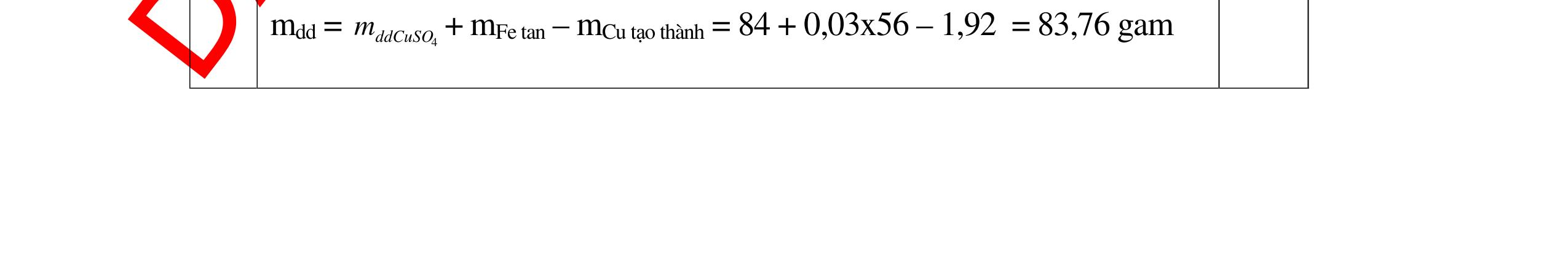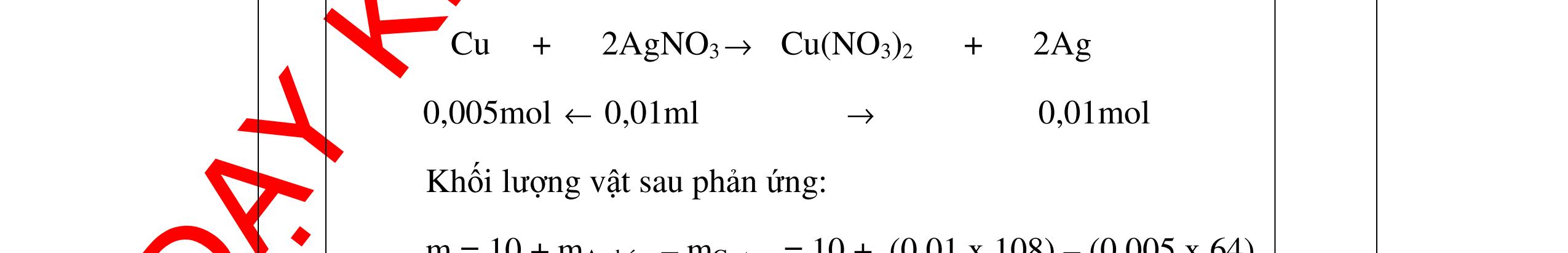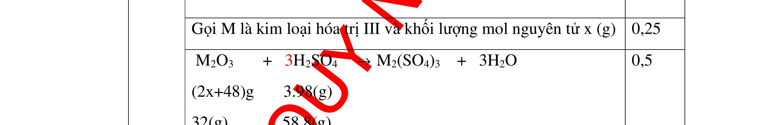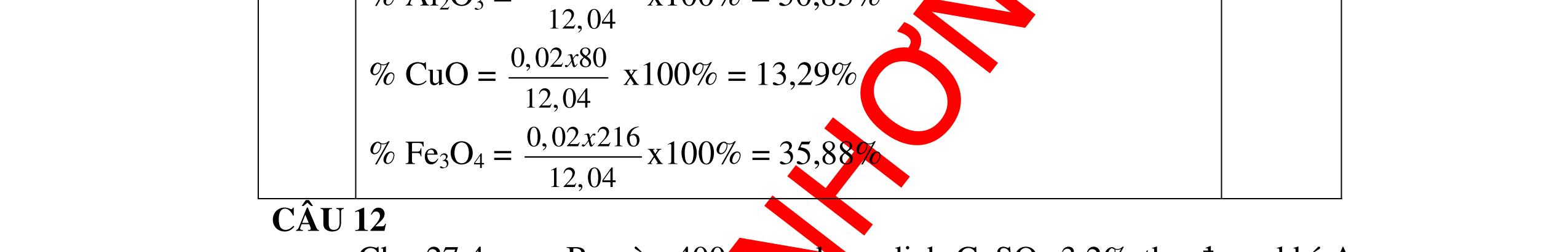 DẠYKÈMQUYNHƠNOFFICIAL 2,5 điểm PTHH: 2M + Cl2 →2MCl 2M(g) (2M + 71)g 9,2g 23,4g Ta có: 23,4 . 2M = 9,2(2M + 71) suy ra: M = 23. Kim loại có khối lượng nguyên tử bằng 23 là Na. Vậy muối thu được là: NaCl 0,75 0,75 0,25 0,5 Câu 12: Hoà tan 3,06g oxit MxOy bằng dung dich HNO3 dư sau đó cô cạn thì thu được 5,22g muối khan. Hãy xác định kim loại M biết nó chỉ có một hoá trị duy nhất. Bài làm: 12. 2,5 điểm PTHH: MxOy + 2yHNO3 → xM(NO3)2y/x + yH2O Từ PTPƯ ta có tỉ lệ: 3,065,22 16124 xx MyMy = ++ M = 68,5.2y/x Trong đó: Đặt 2y/x = n là hoá trị của kim loại. Vậy M = 68,5.n (*) Cho n các giá trị 1, 2, 3, 4. Từ (*) M = 137 và n =2 là phù hợp. Do đó M là Ba, hoá trị II. 0,5 0,5 0,5 0,25 0,25 0,5 Câu 13: Khi hoà tan một lượng của một oxit kim loại hoá trị II vào một lượng vừa đủ dung dịch axit H2SO4 4,9%, người ta thu được một dung dịch muối có nồng độ 5,78%. Xác định công thức của oxit trên. Bài làm: 13. 2,5 điểm Đặt công thức của oxit là RO PTHH: RO + H2SO4 → RSO4 + H2O (MR + 16) 98g (MR + 96)g Giả sử hoà tan 1 mol (hay MR + 16)g RO Khối lượng dd RSO4 (5,87%) = (MR + 16) + (98 : 4,9).100 = MR + 2016 C% = 96 2016 R R M M + + .100% = 5,87% 0,25 0,5 0,25 0,5 0,5