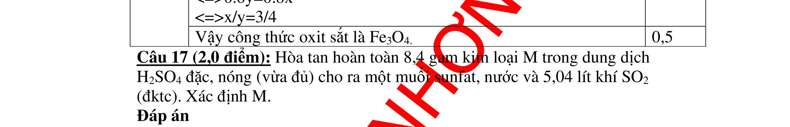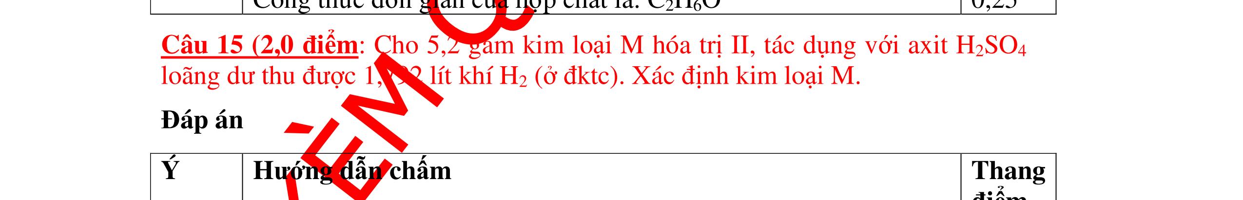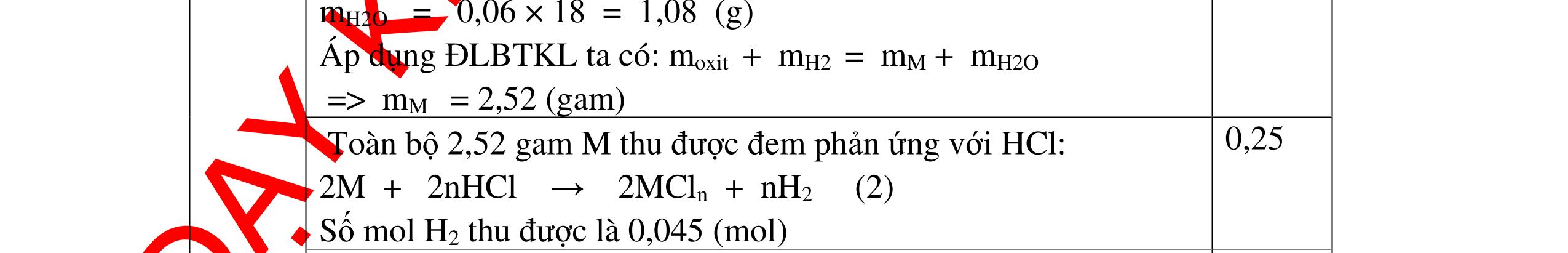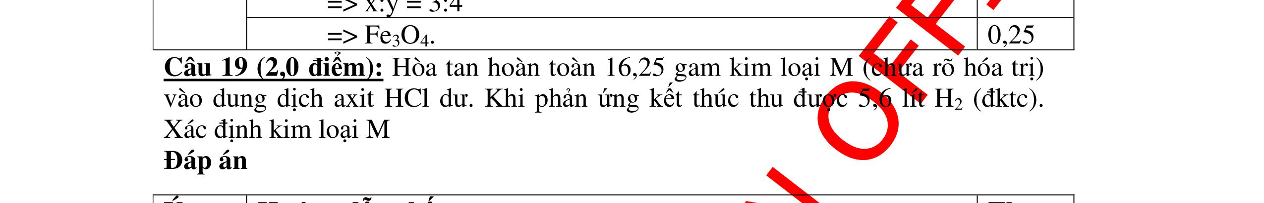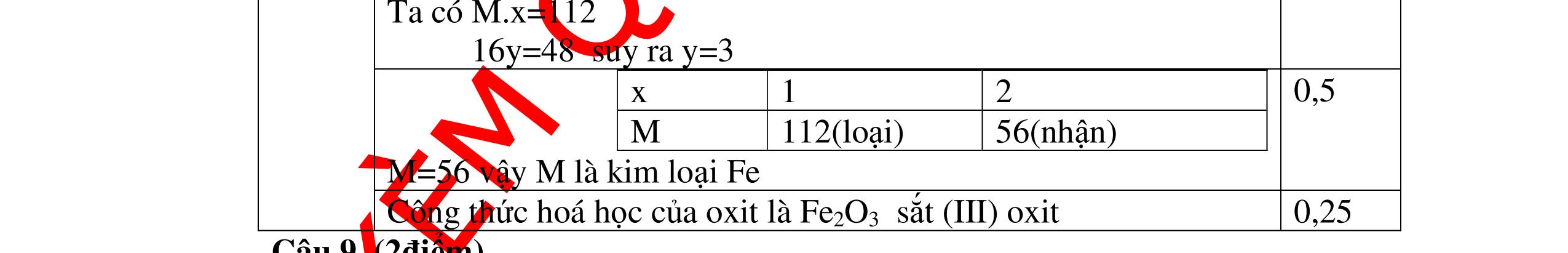DẠYKÈMQUYNHƠNOFFICIAL Giải phương trình ta được: MR = 24 kim loại hoá trị II là Mg Công thức hóa học của oxit MgO 0,5 Câu 14: Một loại oxit sắt có thành phần là 7 phần khối lượng sắt kết hợp với 3 phần khối lượng oxi. Hãy xác định công thức hóa học của oxit sắt, biết công thức hóa học trùng công thức đơn giản nhất. Bài làm: 14. 2,5 điểm Đặt công thức tổng quát của oxit sắt là FexOy. Xét 1 mol FexOy nFe = x (mol) nO = y (mol) 567 163 Fe O m x my == 2 3 x y = Vậy công thức hóa học của oxit sắt là Fe2O3. 0,5 0,25 0,5 0,75 0,5 Câu 15:( 2,5 điểm). Hòa tan hoàn toàn 16,25 gam kim loại M ( chưa rõ hóa trị) vào dung dịch axit clohidric. Sau phản ứng kết thúc thu được 5,6 lit khí hidro (đktc). Xác định kim loại M ? 15 1 Gọi n là hóa trị của M. 0.25 PTHH: 2M + 2nHCl → 2MCln + nH2↑ 2 mol n mol x mol nx /2 mol 1 Ta có hệ phương trình: Mx = 16,25 (1) nx / 2 = 5,6 / 22,4 = 0,25 (2) Từ (2) nx = 0,25 x2 = 0,5 (3) Từ (1) và (3) Mx / nx = 16,25 / 0,5 M / n = 32,5 0,5