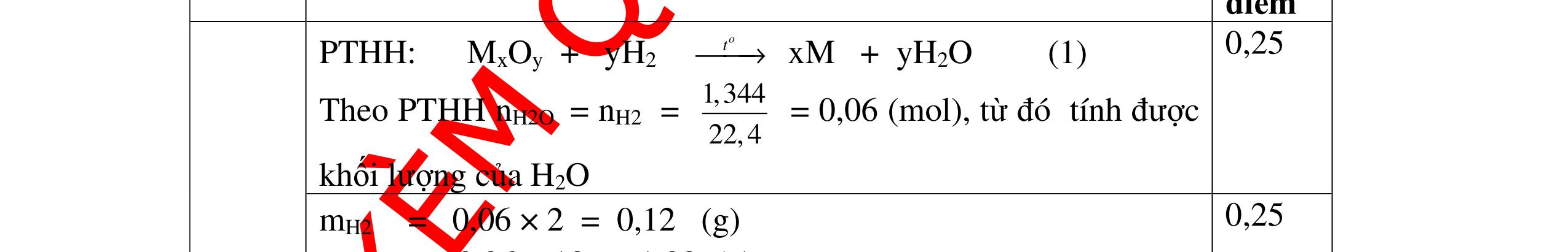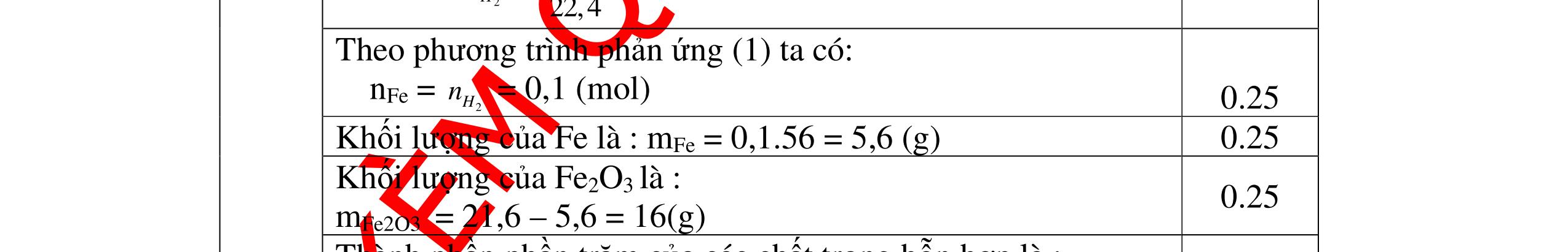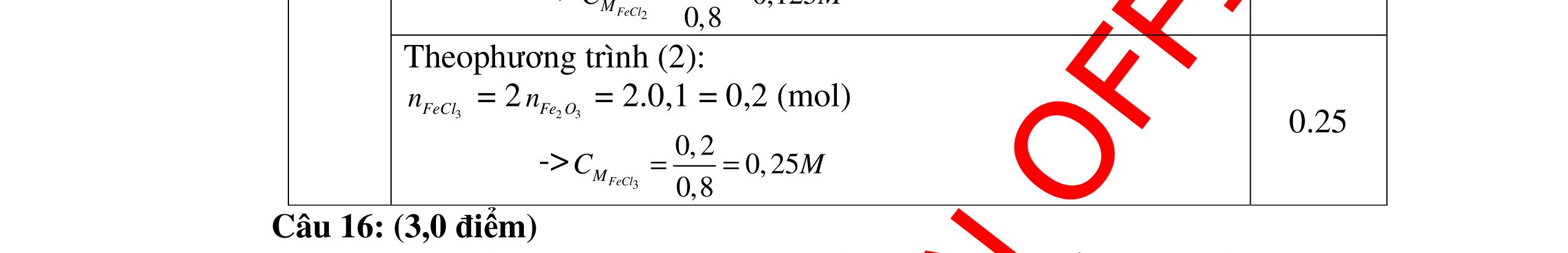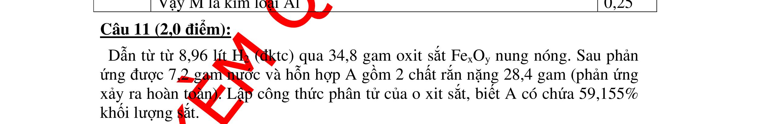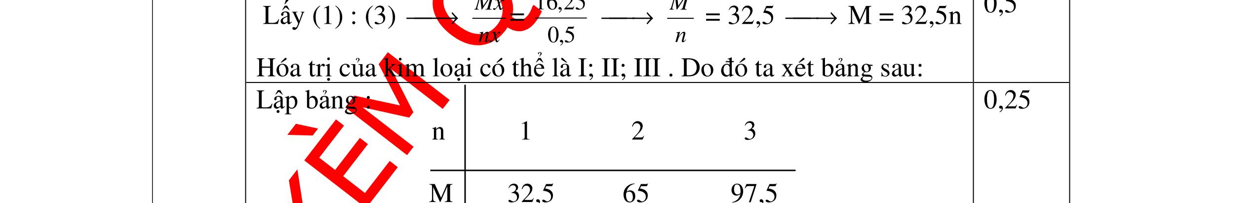 DẠYKÈMQUYNHƠNOFFICIAL Giải phương trình ta được: MR = 24 kim loại hoá trị II là Mg Công thức hóa học của oxit MgO 0,5 Câu 14: Một loại oxit sắt có thành phần là 7 phần khối lượng sắt kết hợp với 3 phần khối lượng oxi. Hãy xác định công thức hóa học của oxit sắt, biết công thức hóa học trùng công thức đơn giản nhất. Bài làm: 14. 2,5 điểm Đặt công thức tổng quát của oxit sắt là FexOy. Xét 1 mol FexOy nFe = x (mol) nO = y (mol) 567 163 Fe O m x my == 2 3 x y = Vậy công thức hóa học của oxit sắt là Fe2O3. 0,5 0,25 0,5 0,75 0,5 Câu 15:( 2,5 điểm). Hòa tan hoàn toàn 16,25 gam kim loại M ( chưa rõ hóa trị) vào dung dịch axit clohidric. Sau phản ứng kết thúc thu được 5,6 lit khí hidro (đktc). Xác định kim loại M ? 15 1 Gọi n là hóa trị của M. 0.25 PTHH: 2M + 2nHCl → 2MCln + nH2↑ 2 mol n mol x mol nx /2 mol 1 Ta có hệ phương trình: Mx = 16,25 (1) nx / 2 = 5,6 / 22,4 = 0,25 (2) Từ (2) nx = 0,25 x2 = 0,5 (3) Từ (1) và (3) Mx / nx = 16,25 / 0,5 M / n = 32,5 0,5
