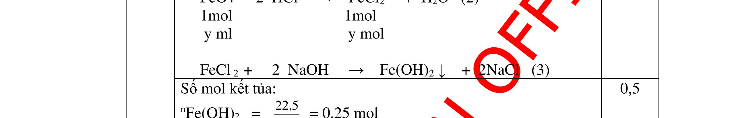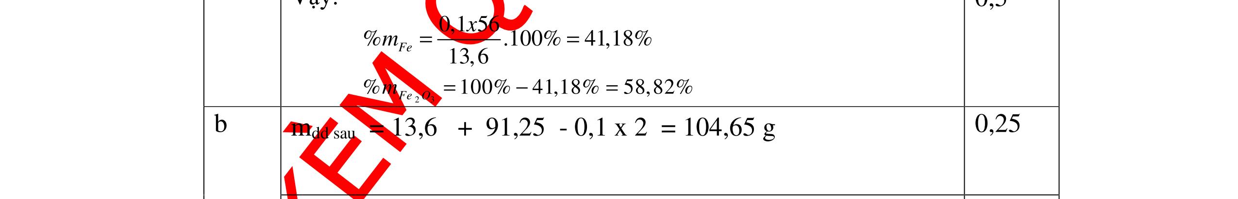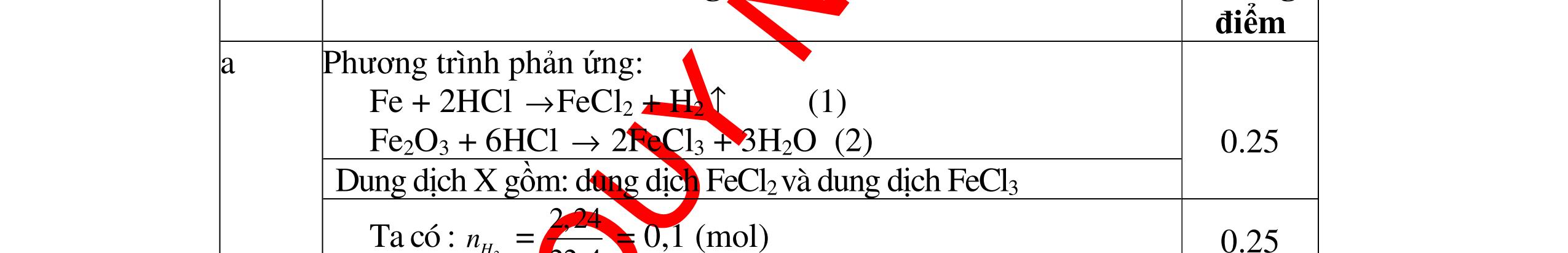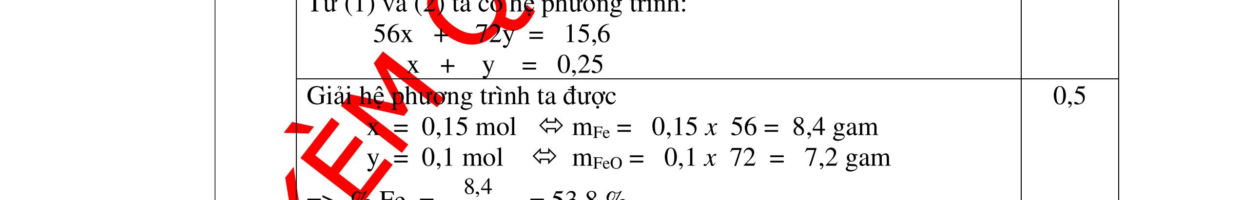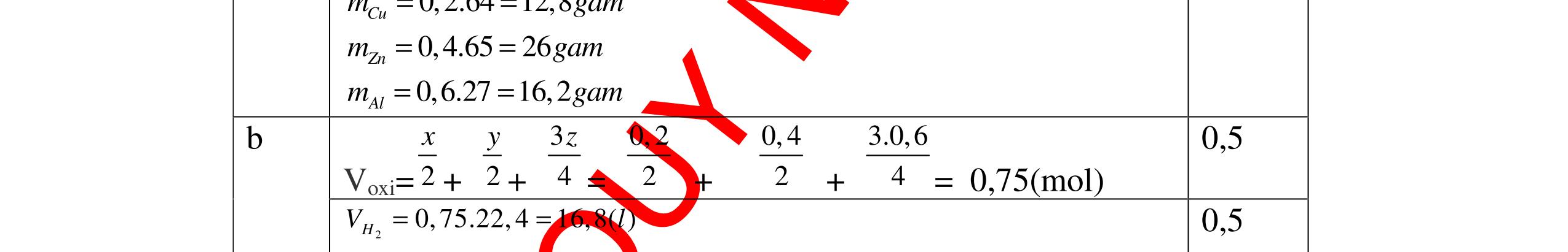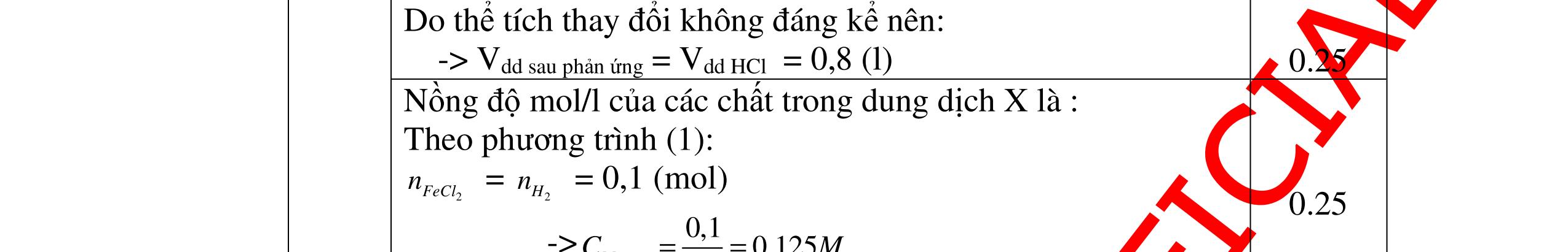 DẠYKÈMQUYNHƠNOFFICIAL Giải phương trình ta được: MR = 24 kim loại hoá trị II là Mg Công thức hóa học của oxit MgO 0,5 Câu 14: Một loại oxit sắt có thành phần là 7 phần khối lượng sắt kết hợp với 3 phần khối lượng oxi. Hãy xác định công thức hóa học của oxit sắt, biết công thức hóa học trùng công thức đơn giản nhất. Bài làm: 14. 2,5 điểm Đặt công thức tổng quát của oxit sắt là FexOy. Xét 1 mol FexOy nFe = x (mol) nO = y (mol) 567 163 Fe O m x my == 2 3 x y = Vậy công thức hóa học của oxit sắt là Fe2O3. 0,5 0,25 0,5 0,75 0,5 Câu 15:( 2,5 điểm). Hòa tan hoàn toàn 16,25 gam kim loại M ( chưa rõ hóa trị) vào dung dịch axit clohidric. Sau phản ứng kết thúc thu được 5,6 lit khí hidro (đktc). Xác định kim loại M ? 15 1 Gọi n là hóa trị của M. 0.25 PTHH: 2M + 2nHCl → 2MCln + nH2↑ 2 mol n mol x mol nx /2 mol 1 Ta có hệ phương trình: Mx = 16,25 (1) nx / 2 = 5,6 / 22,4 = 0,25 (2) Từ (2) nx = 0,25 x2 = 0,5 (3) Từ (1) và (3) Mx / nx = 16,25 / 0,5 M / n = 32,5 0,5