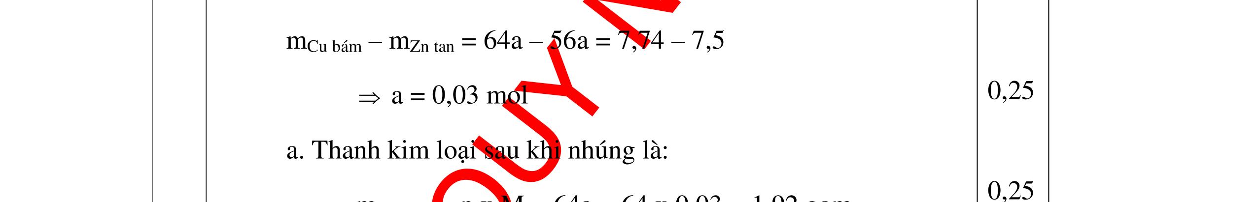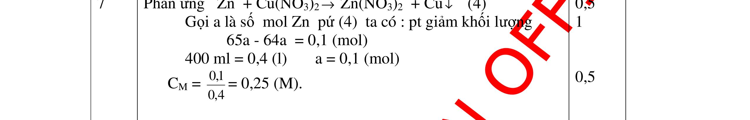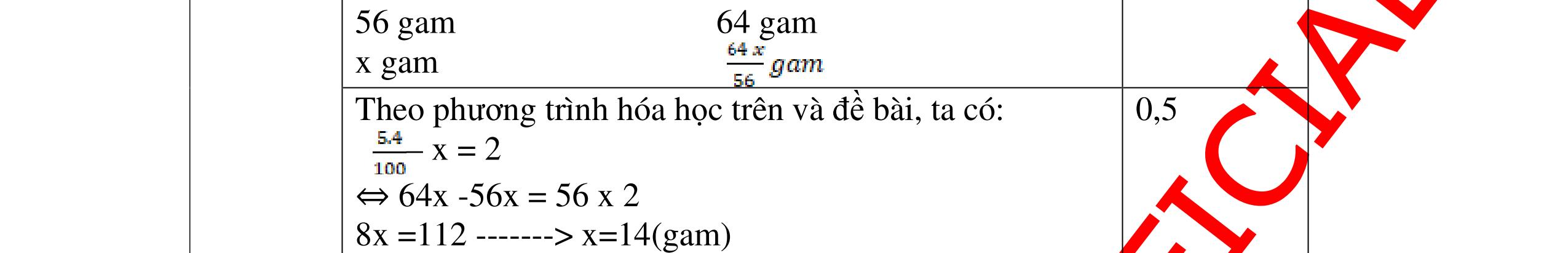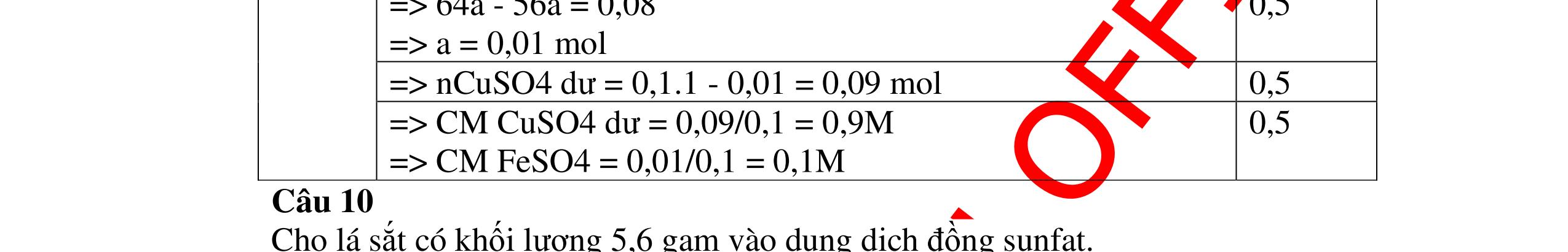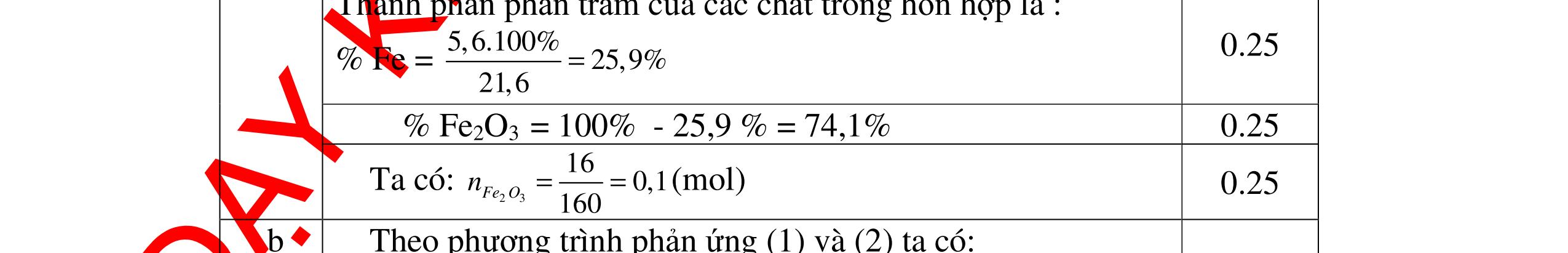 DẠYKÈMQUYNHƠNOFFICIAL Giải phương trình ta được: MR = 24 kim loại hoá trị II là Mg Công thức hóa học của oxit MgO 0,5 Câu 14: Một loại oxit sắt có thành phần là 7 phần khối lượng sắt kết hợp với 3 phần khối lượng oxi. Hãy xác định công thức hóa học của oxit sắt, biết công thức hóa học trùng công thức đơn giản nhất. Bài làm: 14. 2,5 điểm Đặt công thức tổng quát của oxit sắt là FexOy. Xét 1 mol FexOy nFe = x (mol) nO = y (mol) 567 163 Fe O m x my == 2 3 x y = Vậy công thức hóa học của oxit sắt là Fe2O3. 0,5 0,25 0,5 0,75 0,5 Câu 15:( 2,5 điểm). Hòa tan hoàn toàn 16,25 gam kim loại M ( chưa rõ hóa trị) vào dung dịch axit clohidric. Sau phản ứng kết thúc thu được 5,6 lit khí hidro (đktc). Xác định kim loại M ? 15 1 Gọi n là hóa trị của M. 0.25 PTHH: 2M + 2nHCl → 2MCln + nH2↑ 2 mol n mol x mol nx /2 mol 1 Ta có hệ phương trình: Mx = 16,25 (1) nx / 2 = 5,6 / 22,4 = 0,25 (2) Từ (2) nx = 0,25 x2 = 0,5 (3) Từ (1) và (3) Mx / nx = 16,25 / 0,5 M / n = 32,5 0,5