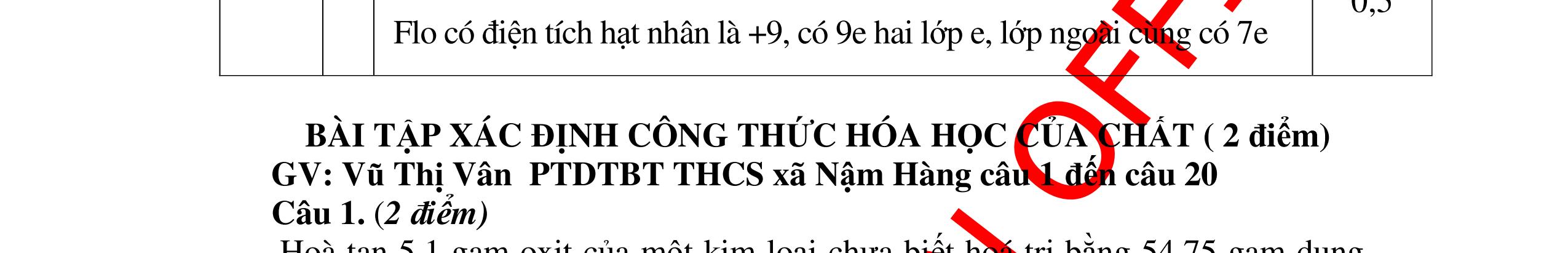 DẠYKÈMQUYNHƠNOFFICIAL 23 1 Số hạt không mang điện là: n = 28/100 x 35,7 = 10 (hạt) 0.5 Số hạt mang điện là: 28 – 10 = 18 (hạt) p = e = 18/2 = 9 (hạt) 0,5 Vậy nguyên tố là flo ký hiệu là F công thức hóa học là F2 Flo có điện tích hạt nhân là +9, có 9e hai lớp e, lớp ngoài cùng có 7e 0,5 2 Theo bài ra ta có: 1/4 X = 1/3 x 39 => X = (39 x 4) : 3 = 52 (đvc) 0.5 Vậy nguyên tố X là Crom ký hiệu là Cr 0,5 Câu 24: Hai nguyên tử X kết hợp với một nguyên tử oxi tạo ra phân tử oxit. Trong phân tử oxit, nguyên tố oxi chiếm 25,8 % về khối lượng. Tìm nguyên tố X. 24 Công thức hóa học của oxit là X2O Vì Oxi chiếm 25,8% về khối lượng nên ta có : 16 = 0,258 2X + 16 Giải ra được X = 23. Vậy X là natri ( Na) 0,5đ 0,5đ 1đ 0,5 Câu 25:Lập công thức hoá học của các chất có thành phần như sau: a) 70% Fe, còn lại là oxi và có phân tử khối là 160đvc. b) Hợp chất gồm hai nguyên tố C và H, biết cứ 3 phần khối lượng cacbon kết hợp với 1 phần khối lượng hiđro và công thức phân tử cũng chính là công thức đơn giản. 25 a) Khối lượng Fe là : 160.70% = 112g =>nFe = 112: 56 = 2mol 0,25 0,25