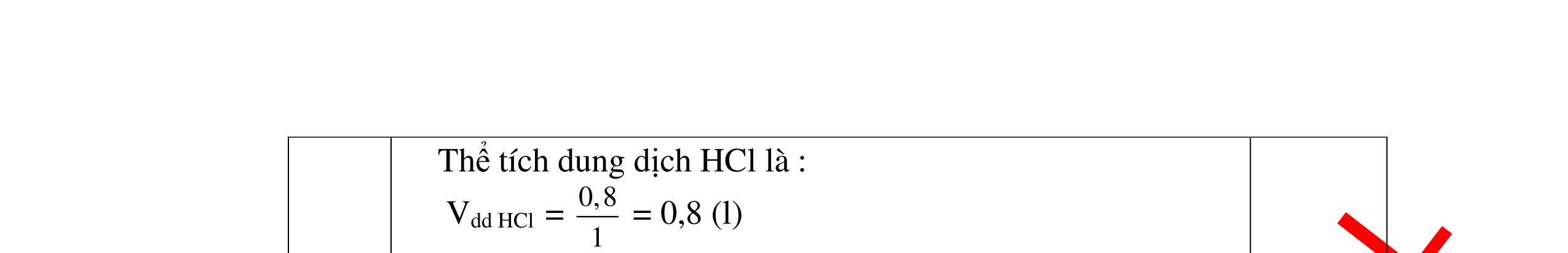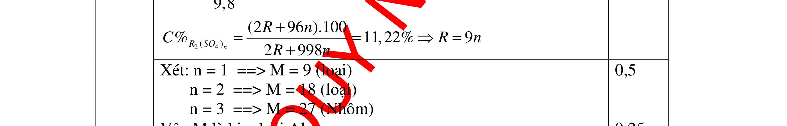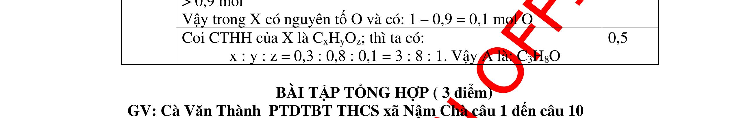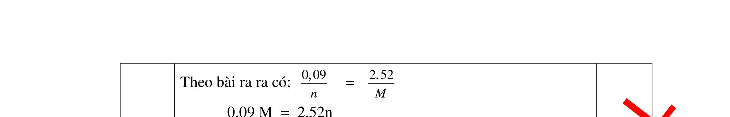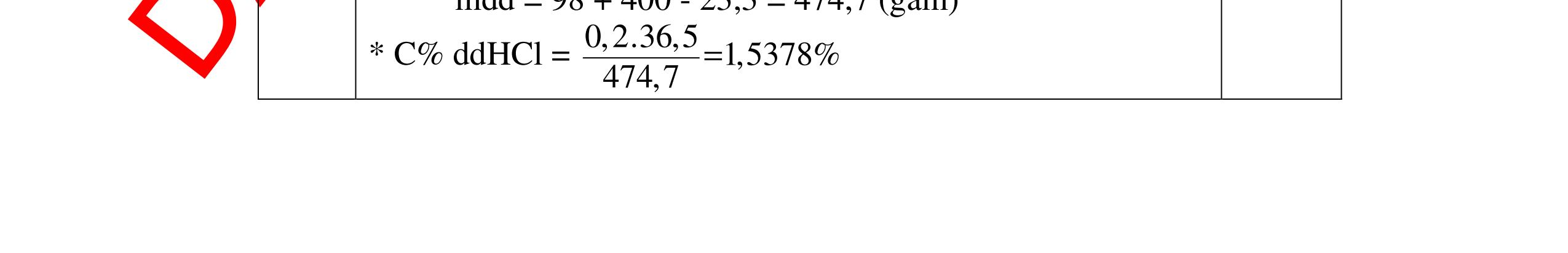 DẠYKÈMQUYNHƠNOFFICIAL Câu 3: Phân tích một hợp chất vô cơ A người ta nhận được % về khối lượng K là 45,95%; % về khối lượng N là16,45% và % về khối lượng O là 37,6%. Xác định công thức hoá học của A. Bài làm: 3. 2,5 điểm Vì %K + %N + %O = 45,95 + 16,45 + 37,6 = 100% nên A chỉ chứa K, N, O. Gọi công thức của A là KxNyOz ta có: = 1,17 : 1,17 : 2,34 = 1 : 1 : 2 vậy A có công thức hoá học là KNO2 0,5 0,25 0,5 0,5 0,25 0,5 Câu 4: Hoà tan hoàn toàn 3,78g một kim loại X vào dung dịch HCl thu được 4,704l H2 (đktc). Xác định kim loại X. Bài làm: 4. 2,5 điểm Gọi n là hoá trị của kim loại và a là số mol của kim loại X đã dùng, ta có phương trình phản ứng: X + HCl XCln + H2 1 mol mol a mol mol Suy ra ta có hệ: aX = 3,78 (1) = = 0,21 (2) (2) an = 0,42 (3) (1) : (3) = 9 X = 9n Vì hoá trị kim loại có thể là 1; 2 hoặc 3. Do đó xét bảng sau: 0,25 0,25 0,25 0,25 0,25 0,25 0,25 0,25 0,25 2 n 2 n 2 an 2 an 22 704 n x x: y: z = : 14 16 : 39 45 16 37