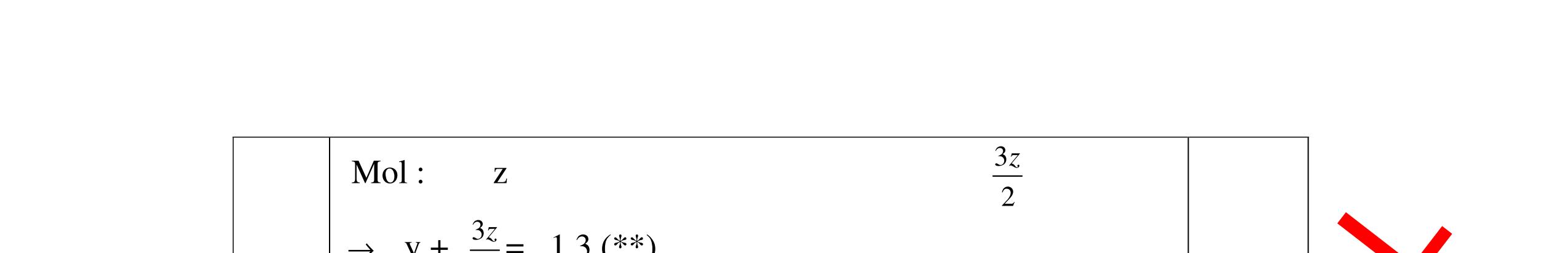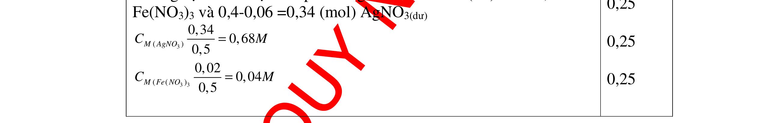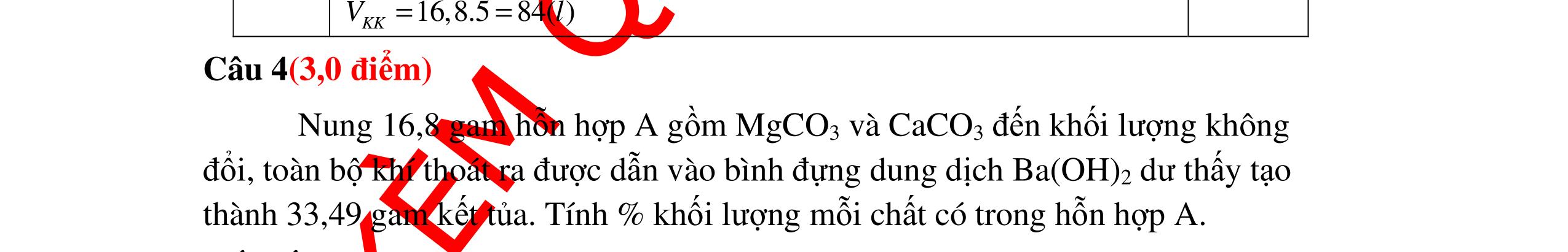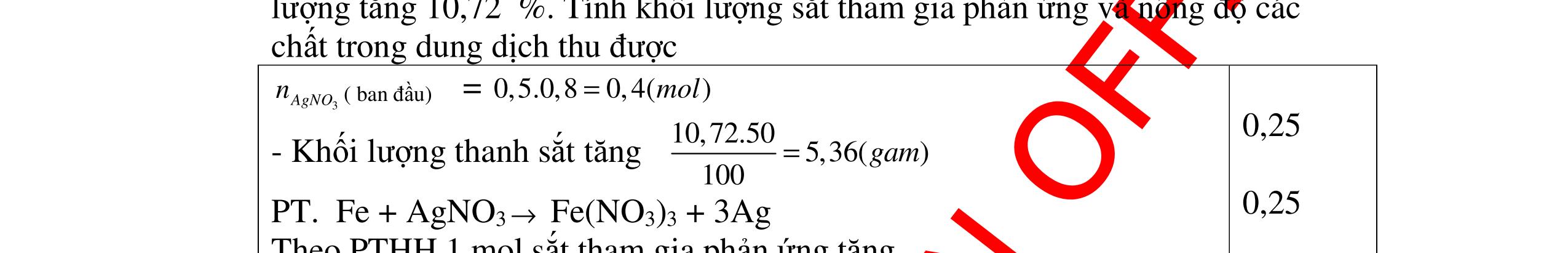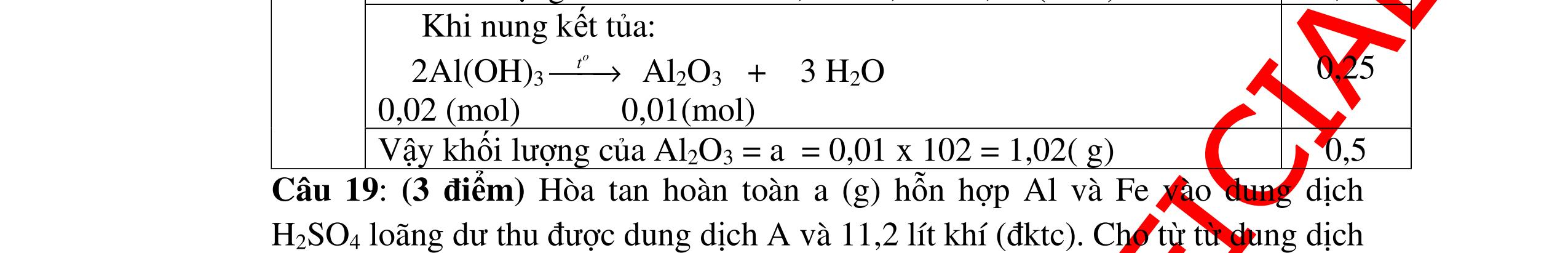DẠYKÈMQUYNHƠNOFFICIAL Câu 3: Phân tích một hợp chất vô cơ A người ta nhận được % về khối lượng K là 45,95%; % về khối lượng N là16,45% và % về khối lượng O là 37,6%. Xác định công thức hoá học của A. Bài làm: 3. 2,5 điểm Vì %K + %N + %O = 45,95 + 16,45 + 37,6 = 100% nên A chỉ chứa K, N, O. Gọi công thức của A là KxNyOz ta có: = 1,17 : 1,17 : 2,34 = 1 : 1 : 2 vậy A có công thức hoá học là KNO2 0,5 0,25 0,5 0,5 0,25 0,5 Câu 4: Hoà tan hoàn toàn 3,78g một kim loại X vào dung dịch HCl thu được 4,704l H2 (đktc). Xác định kim loại X. Bài làm: 4. 2,5 điểm Gọi n là hoá trị của kim loại và a là số mol của kim loại X đã dùng, ta có phương trình phản ứng: X + HCl XCln + H2 1 mol mol a mol mol Suy ra ta có hệ: aX = 3,78 (1) = = 0,21 (2) (2) an = 0,42 (3) (1) : (3) = 9 X = 9n Vì hoá trị kim loại có thể là 1; 2 hoặc 3. Do đó xét bảng sau: 0,25 0,25 0,25 0,25 0,25 0,25 0,25 0,25 0,25 2 n 2 n 2 an 2 an 22 704 n x x: y: z = : 14 16 : 39 45 16 37