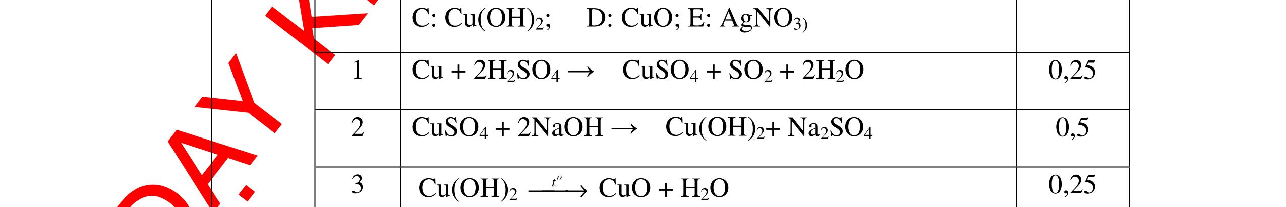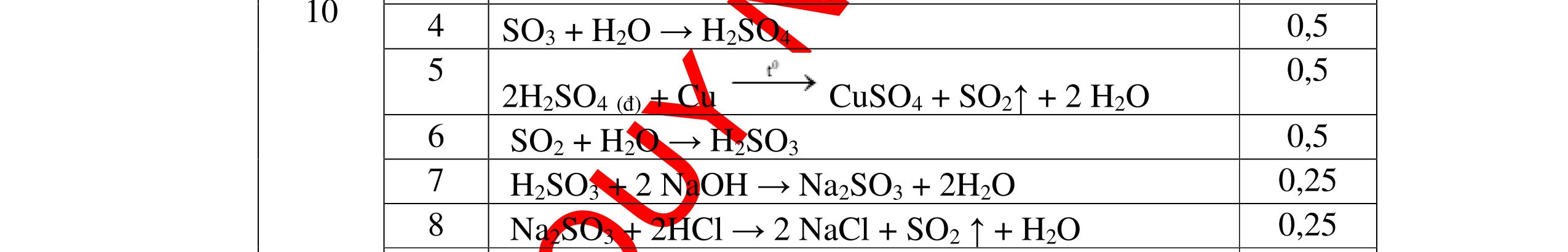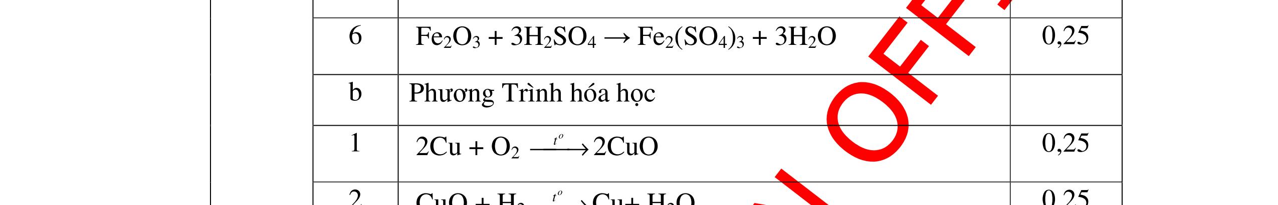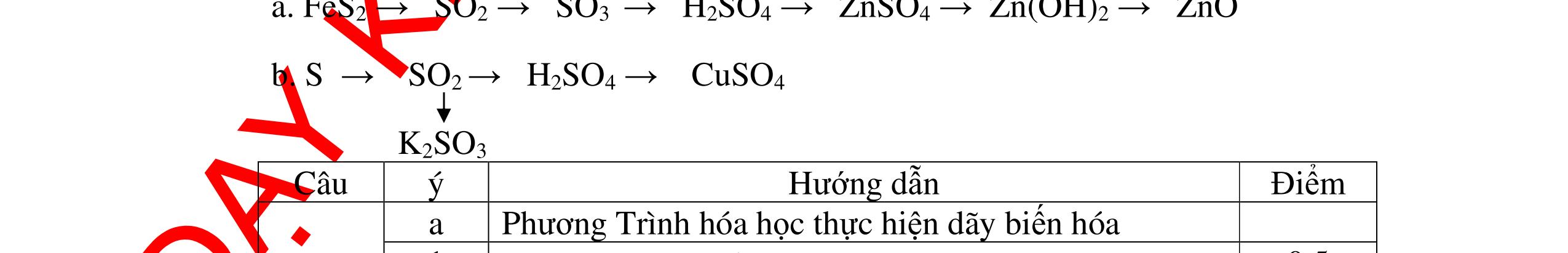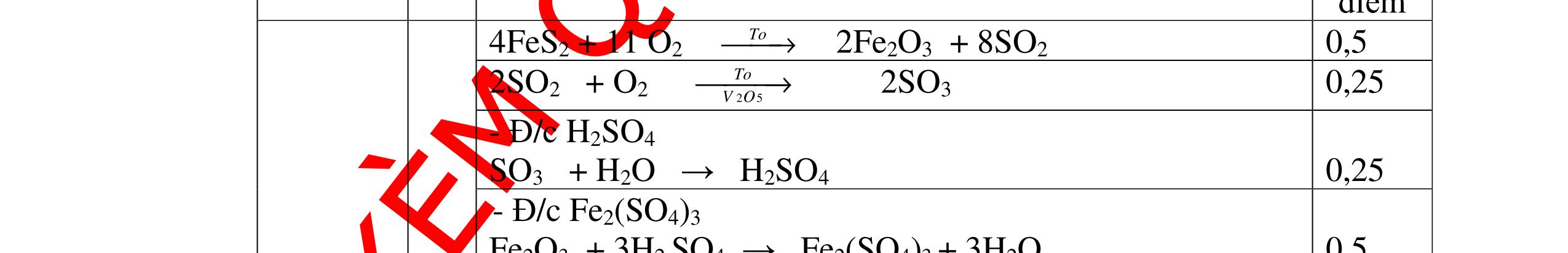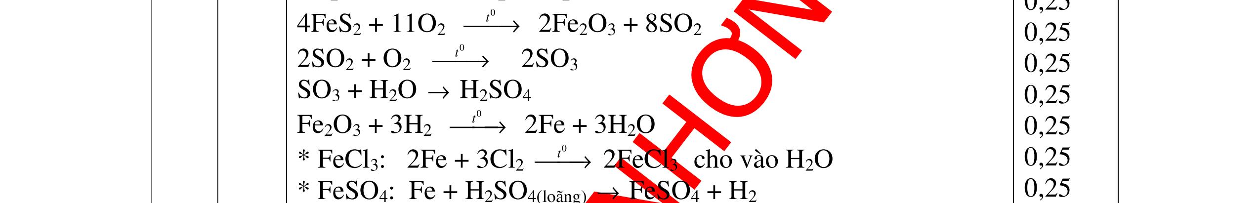 điều kiện cần thiết. Viết phương trình hóa học điều chế các chất theo sơ đồ chuyển hóa sau: Cu→CuO→Cu. Biết Fe có thể phản ứng với CuSO4 theo phương trình Fe + CuSO4 →FeSO4 + Cu b) SO2 + 2H2O + Br2 → H2SO4 + 2HBr 0,25 2 A, B, C, D lần lượt là: Cu(OH)2, CuO, Cu, H2SO4. Các phương trình hóa học: H2SO4 + Cu(OH)2 → CuSO4 + 2H2O H2SO4 + CuO → CuSO4 + H2O 2H2SO4 đặc,nóng + Cu → CuSO4 + 2H2O + SO2↑ CuSO4 + BaCl2 → BaSO4 + CuCl2 CuCl2 + 2AgNO3 → 2AgCl↓ + Cu(NO3)2 Cu(NO3)2 + 2NaOH → Cu(OH)2↓ + 2NaNO3 Cu(OH)2 → CuO + H2O CuO + CO → Cu + CO2 0,25 0,25 0,25 0,25 0,25 0,25 0,25 0,25 Câu2 Ý Hướngdẫnchấm Biểu điểm 1 1 4FeS2 + 11O2 > 2Fe2O3 + 8SO2 0,5 2 6KOH + Al2(SO4)3 > 3K2SO4 + 2Al(OH)3 0,5 3 FeO + 2HCl > FeCl2 + H2O 0,5 4 FexOy + yCO > xFeO + yCO2 0,5 5 2 Al + 6 H2SO4 Al2(SO4)3 + 3 SO2 + 6 H2O 0,5 6 3Fe3O4 + 8Al 0t → 9Fe + 4Al2O3 0,5 7 FexOy + yH2 0t → xFe + yH2O 0,5 8 2Fe + 3Cl2 0t → 2 FeCl3 0,25 2 1 2KMnO4 to K2MnO4 + MnO2+ O2 (điều chế O2) 0.25 2 Fe +2HCl →FeCl2 + H2 (điều chế H2) 0.25 3 Fe + CuSO4 →FeSO4 + Cu (điều chế Cu) 0.25 4 2Cu + O2 to 2CuO (điều chế CuO) 0.25 5 CuO + H2 to Cu+ H2O (điều chế Cu) 0.25 t0 t0