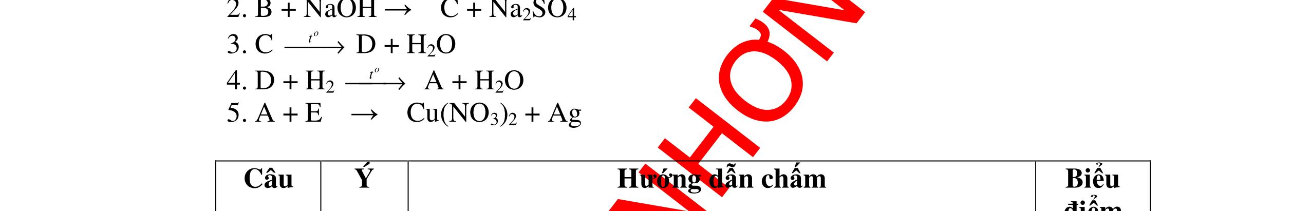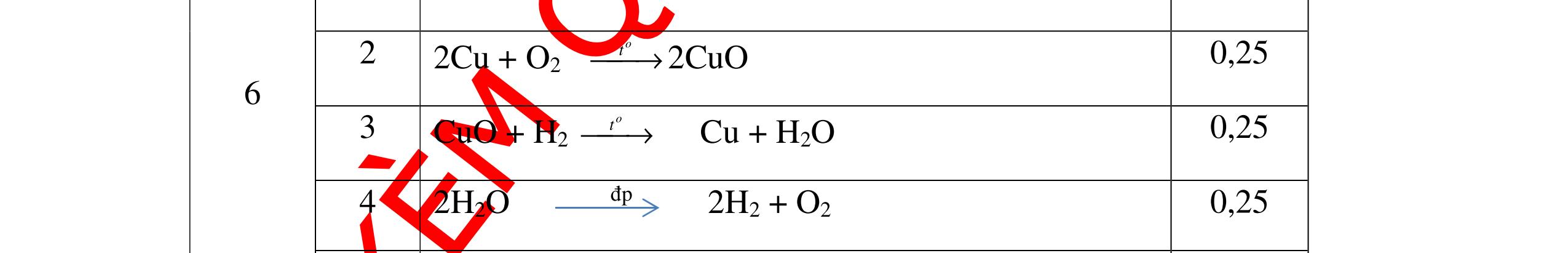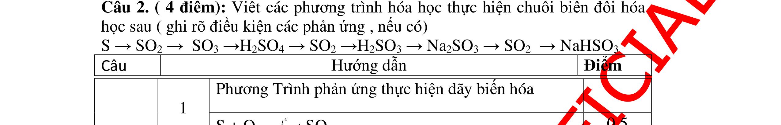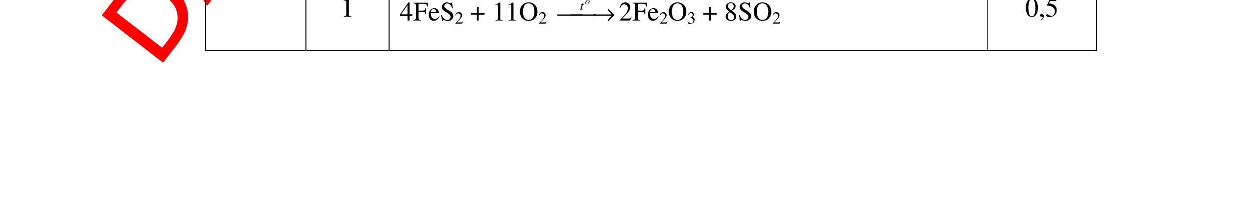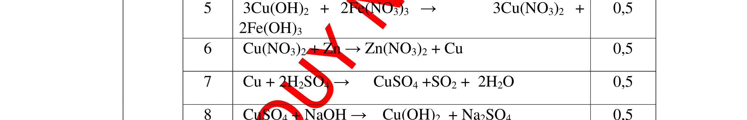 điều kiện cần thiết. Viết phương trình hóa học điều chế các chất theo sơ đồ chuyển hóa sau: Cu→CuO→Cu. Biết Fe có thể phản ứng với CuSO4 theo phương trình Fe + CuSO4 →FeSO4 + Cu b) SO2 + 2H2O + Br2 → H2SO4 + 2HBr 0,25 2 A, B, C, D lần lượt là: Cu(OH)2, CuO, Cu, H2SO4. Các phương trình hóa học: H2SO4 + Cu(OH)2 → CuSO4 + 2H2O H2SO4 + CuO → CuSO4 + H2O 2H2SO4 đặc,nóng + Cu → CuSO4 + 2H2O + SO2↑ CuSO4 + BaCl2 → BaSO4 + CuCl2 CuCl2 + 2AgNO3 → 2AgCl↓ + Cu(NO3)2 Cu(NO3)2 + 2NaOH → Cu(OH)2↓ + 2NaNO3 Cu(OH)2 → CuO + H2O CuO + CO → Cu + CO2 0,25 0,25 0,25 0,25 0,25 0,25 0,25 0,25 Câu2 Ý Hướngdẫnchấm Biểu điểm 1 1 4FeS2 + 11O2 > 2Fe2O3 + 8SO2 0,5 2 6KOH + Al2(SO4)3 > 3K2SO4 + 2Al(OH)3 0,5 3 FeO + 2HCl > FeCl2 + H2O 0,5 4 FexOy + yCO > xFeO + yCO2 0,5 5 2 Al + 6 H2SO4 Al2(SO4)3 + 3 SO2 + 6 H2O 0,5 6 3Fe3O4 + 8Al 0t → 9Fe + 4Al2O3 0,5 7 FexOy + yH2 0t → xFe + yH2O 0,5 8 2Fe + 3Cl2 0t → 2 FeCl3 0,25 2 1 2KMnO4 to K2MnO4 + MnO2+ O2 (điều chế O2) 0.25 2 Fe +2HCl →FeCl2 + H2 (điều chế H2) 0.25 3 Fe + CuSO4 →FeSO4 + Cu (điều chế Cu) 0.25 4 2Cu + O2 to 2CuO (điều chế CuO) 0.25 5 CuO + H2 to Cu+ H2O (điều chế Cu) 0.25 t0 t0