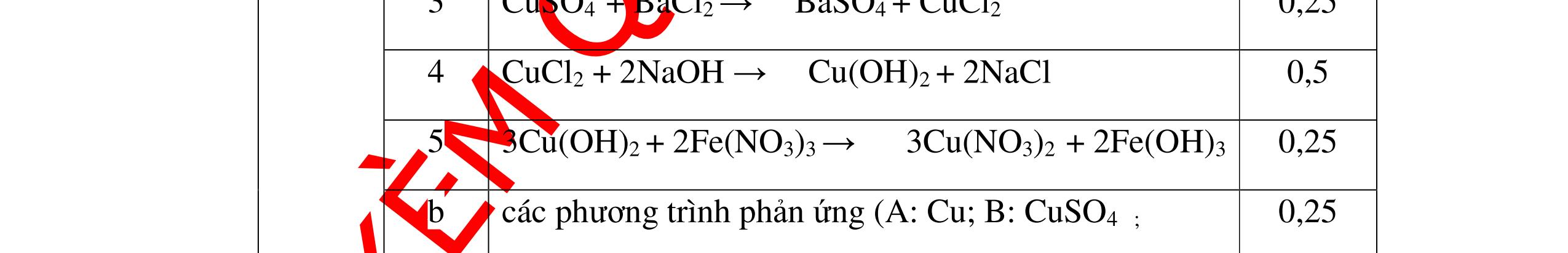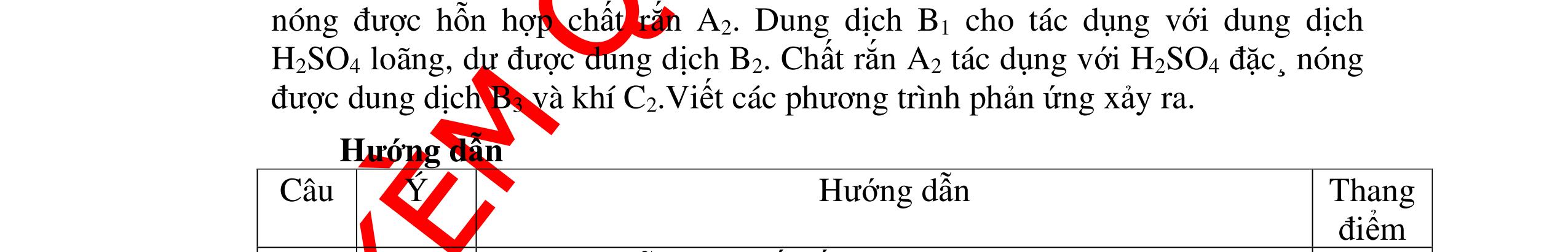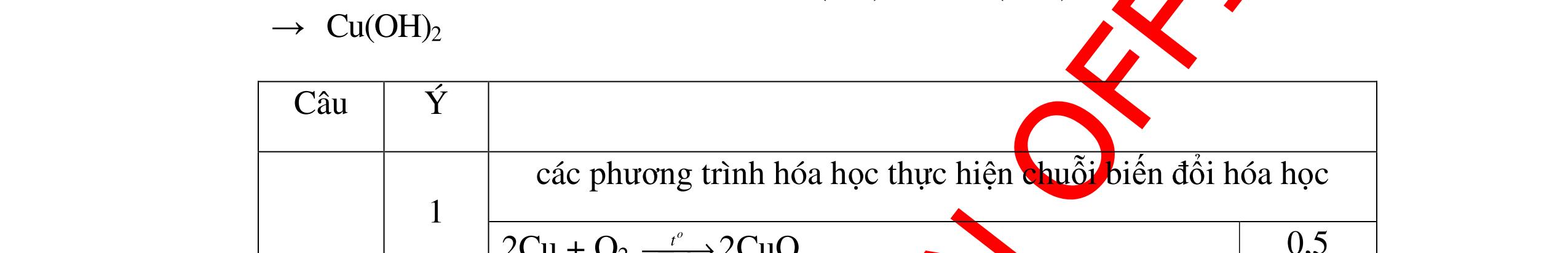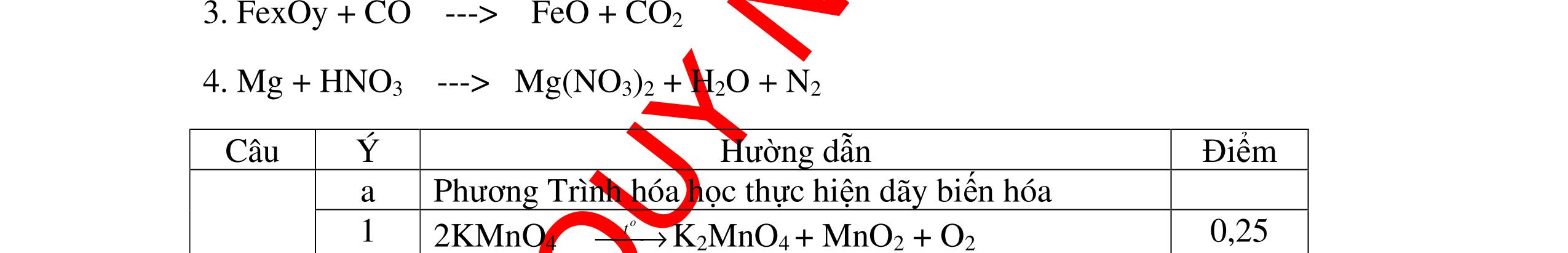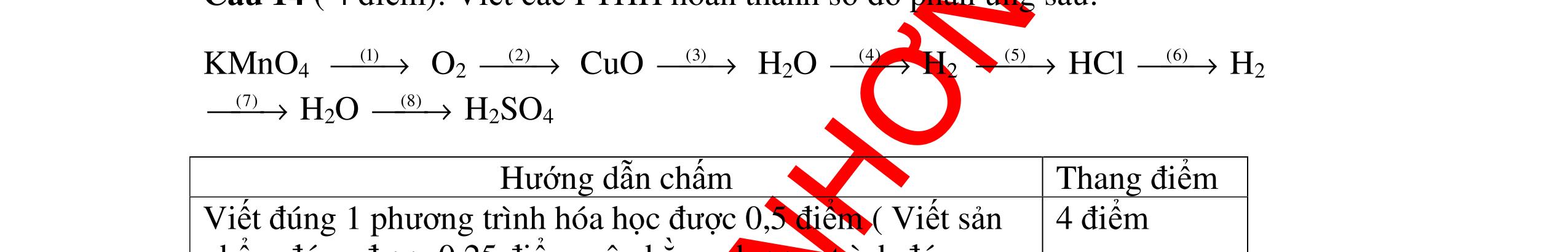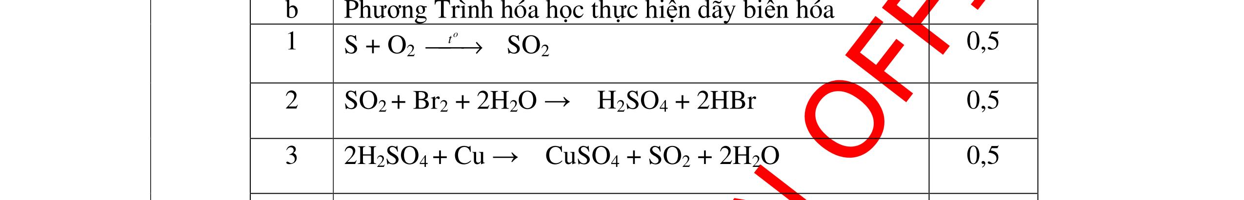 điều kiện cần thiết. Viết phương trình hóa học điều chế các chất theo sơ đồ chuyển hóa sau: Cu→CuO→Cu. Biết Fe có thể phản ứng với CuSO4 theo phương trình Fe + CuSO4 →FeSO4 + Cu b) SO2 + 2H2O + Br2 → H2SO4 + 2HBr 0,25 2 A, B, C, D lần lượt là: Cu(OH)2, CuO, Cu, H2SO4. Các phương trình hóa học: H2SO4 + Cu(OH)2 → CuSO4 + 2H2O H2SO4 + CuO → CuSO4 + H2O 2H2SO4 đặc,nóng + Cu → CuSO4 + 2H2O + SO2↑ CuSO4 + BaCl2 → BaSO4 + CuCl2 CuCl2 + 2AgNO3 → 2AgCl↓ + Cu(NO3)2 Cu(NO3)2 + 2NaOH → Cu(OH)2↓ + 2NaNO3 Cu(OH)2 → CuO + H2O CuO + CO → Cu + CO2 0,25 0,25 0,25 0,25 0,25 0,25 0,25 0,25 Câu2 Ý Hướngdẫnchấm Biểu điểm 1 1 4FeS2 + 11O2 > 2Fe2O3 + 8SO2 0,5 2 6KOH + Al2(SO4)3 > 3K2SO4 + 2Al(OH)3 0,5 3 FeO + 2HCl > FeCl2 + H2O 0,5 4 FexOy + yCO > xFeO + yCO2 0,5 5 2 Al + 6 H2SO4 Al2(SO4)3 + 3 SO2 + 6 H2O 0,5 6 3Fe3O4 + 8Al 0t → 9Fe + 4Al2O3 0,5 7 FexOy + yH2 0t → xFe + yH2O 0,5 8 2Fe + 3Cl2 0t → 2 FeCl3 0,25 2 1 2KMnO4 to K2MnO4 + MnO2+ O2 (điều chế O2) 0.25 2 Fe +2HCl →FeCl2 + H2 (điều chế H2) 0.25 3 Fe + CuSO4 →FeSO4 + Cu (điều chế Cu) 0.25 4 2Cu + O2 to 2CuO (điều chế CuO) 0.25 5 CuO + H2 to Cu+ H2O (điều chế Cu) 0.25 t0 t0