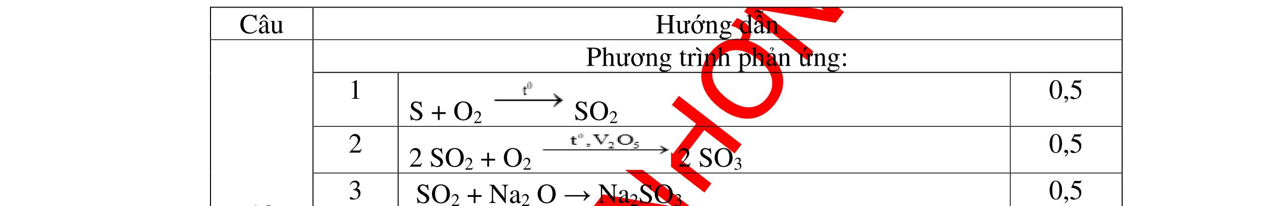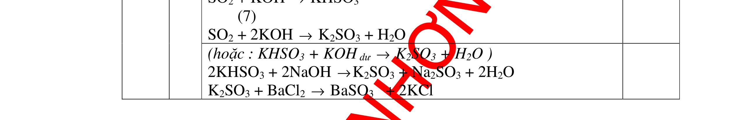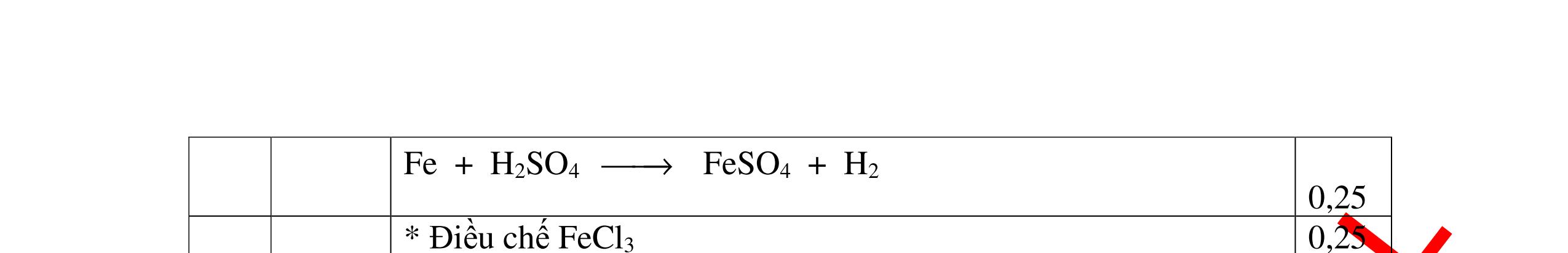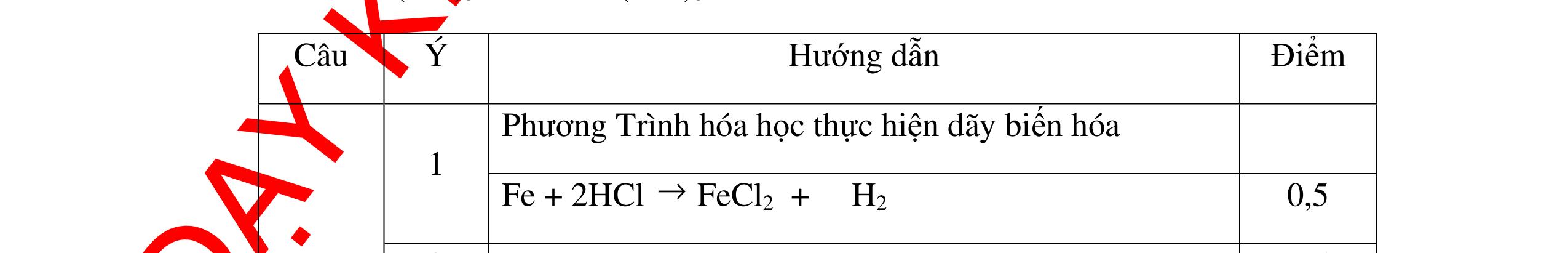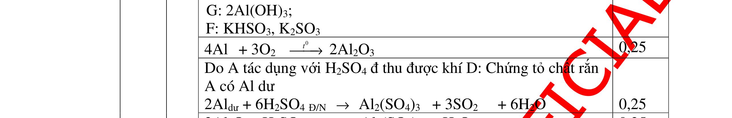 điều kiện cần thiết. Viết phương trình hóa học điều chế các chất theo sơ đồ chuyển hóa sau: Cu→CuO→Cu. Biết Fe có thể phản ứng với CuSO4 theo phương trình Fe + CuSO4 →FeSO4 + Cu b) SO2 + 2H2O + Br2 → H2SO4 + 2HBr 0,25 2 A, B, C, D lần lượt là: Cu(OH)2, CuO, Cu, H2SO4. Các phương trình hóa học: H2SO4 + Cu(OH)2 → CuSO4 + 2H2O H2SO4 + CuO → CuSO4 + H2O 2H2SO4 đặc,nóng + Cu → CuSO4 + 2H2O + SO2↑ CuSO4 + BaCl2 → BaSO4 + CuCl2 CuCl2 + 2AgNO3 → 2AgCl↓ + Cu(NO3)2 Cu(NO3)2 + 2NaOH → Cu(OH)2↓ + 2NaNO3 Cu(OH)2 → CuO + H2O CuO + CO → Cu + CO2 0,25 0,25 0,25 0,25 0,25 0,25 0,25 0,25 Câu2 Ý Hướngdẫnchấm Biểu điểm 1 1 4FeS2 + 11O2 > 2Fe2O3 + 8SO2 0,5 2 6KOH + Al2(SO4)3 > 3K2SO4 + 2Al(OH)3 0,5 3 FeO + 2HCl > FeCl2 + H2O 0,5 4 FexOy + yCO > xFeO + yCO2 0,5 5 2 Al + 6 H2SO4 Al2(SO4)3 + 3 SO2 + 6 H2O 0,5 6 3Fe3O4 + 8Al 0t → 9Fe + 4Al2O3 0,5 7 FexOy + yH2 0t → xFe + yH2O 0,5 8 2Fe + 3Cl2 0t → 2 FeCl3 0,25 2 1 2KMnO4 to K2MnO4 + MnO2+ O2 (điều chế O2) 0.25 2 Fe +2HCl →FeCl2 + H2 (điều chế H2) 0.25 3 Fe + CuSO4 →FeSO4 + Cu (điều chế Cu) 0.25 4 2Cu + O2 to 2CuO (điều chế CuO) 0.25 5 CuO + H2 to Cu+ H2O (điều chế Cu) 0.25 t0 t0
