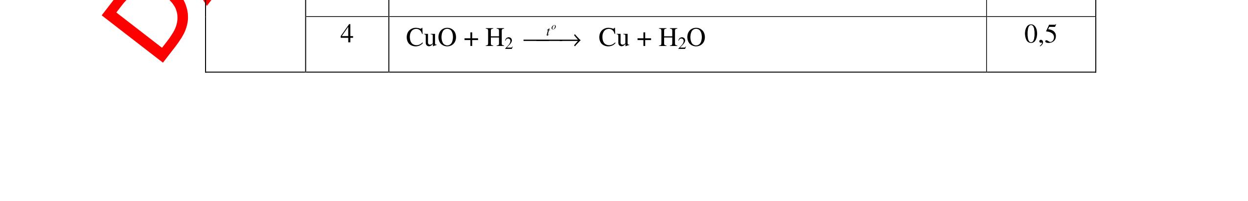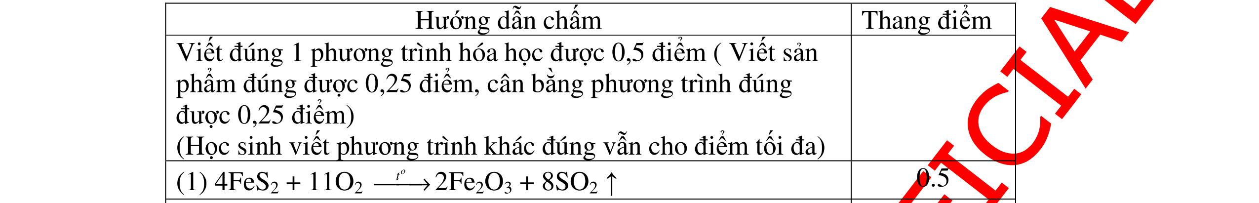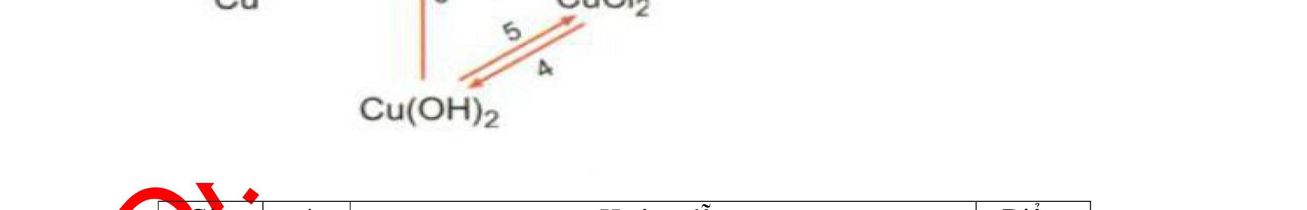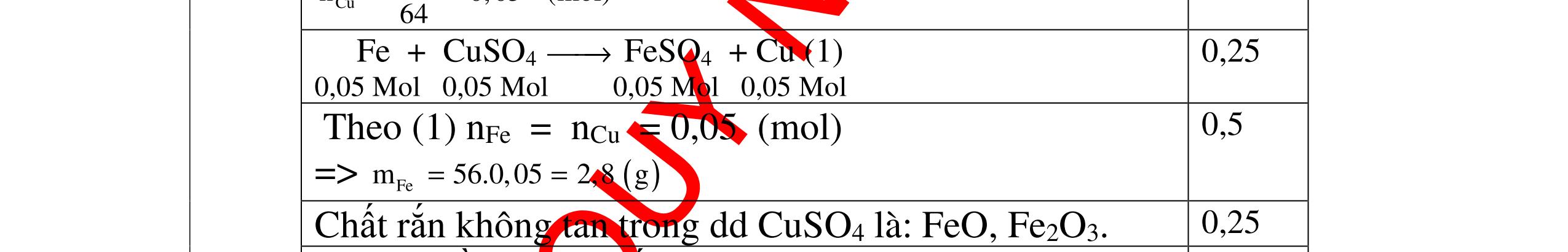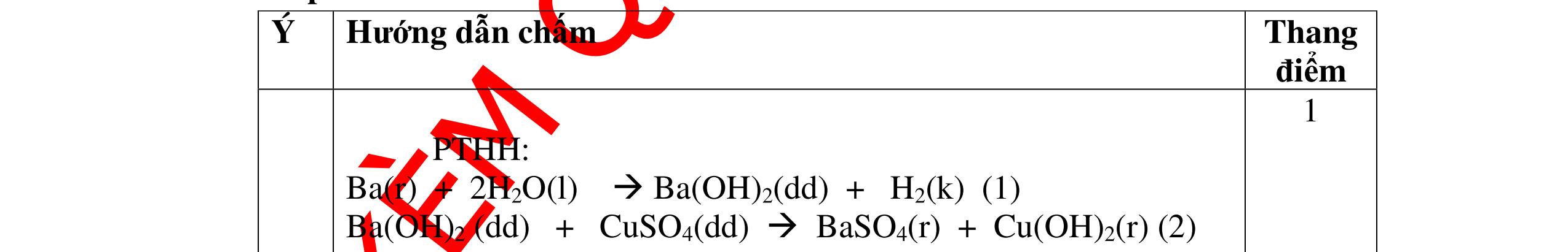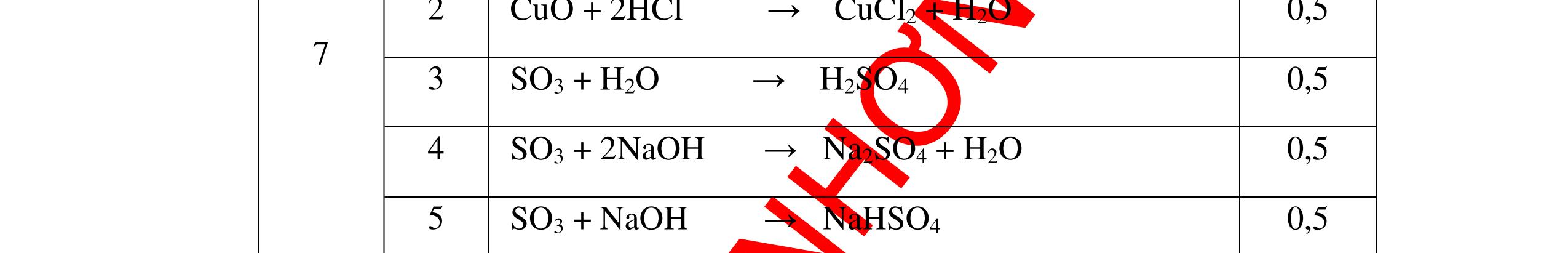 điều kiện cần thiết. Viết phương trình hóa học điều chế các chất theo sơ đồ chuyển hóa sau: Cu→CuO→Cu. Biết Fe có thể phản ứng với CuSO4 theo phương trình Fe + CuSO4 →FeSO4 + Cu b) SO2 + 2H2O + Br2 → H2SO4 + 2HBr 0,25 2 A, B, C, D lần lượt là: Cu(OH)2, CuO, Cu, H2SO4. Các phương trình hóa học: H2SO4 + Cu(OH)2 → CuSO4 + 2H2O H2SO4 + CuO → CuSO4 + H2O 2H2SO4 đặc,nóng + Cu → CuSO4 + 2H2O + SO2↑ CuSO4 + BaCl2 → BaSO4 + CuCl2 CuCl2 + 2AgNO3 → 2AgCl↓ + Cu(NO3)2 Cu(NO3)2 + 2NaOH → Cu(OH)2↓ + 2NaNO3 Cu(OH)2 → CuO + H2O CuO + CO → Cu + CO2 0,25 0,25 0,25 0,25 0,25 0,25 0,25 0,25 Câu2 Ý Hướngdẫnchấm Biểu điểm 1 1 4FeS2 + 11O2 > 2Fe2O3 + 8SO2 0,5 2 6KOH + Al2(SO4)3 > 3K2SO4 + 2Al(OH)3 0,5 3 FeO + 2HCl > FeCl2 + H2O 0,5 4 FexOy + yCO > xFeO + yCO2 0,5 5 2 Al + 6 H2SO4 Al2(SO4)3 + 3 SO2 + 6 H2O 0,5 6 3Fe3O4 + 8Al 0t → 9Fe + 4Al2O3 0,5 7 FexOy + yH2 0t → xFe + yH2O 0,5 8 2Fe + 3Cl2 0t → 2 FeCl3 0,25 2 1 2KMnO4 to K2MnO4 + MnO2+ O2 (điều chế O2) 0.25 2 Fe +2HCl →FeCl2 + H2 (điều chế H2) 0.25 3 Fe + CuSO4 →FeSO4 + Cu (điều chế Cu) 0.25 4 2Cu + O2 to 2CuO (điều chế CuO) 0.25 5 CuO + H2 to Cu+ H2O (điều chế Cu) 0.25 t0 t0