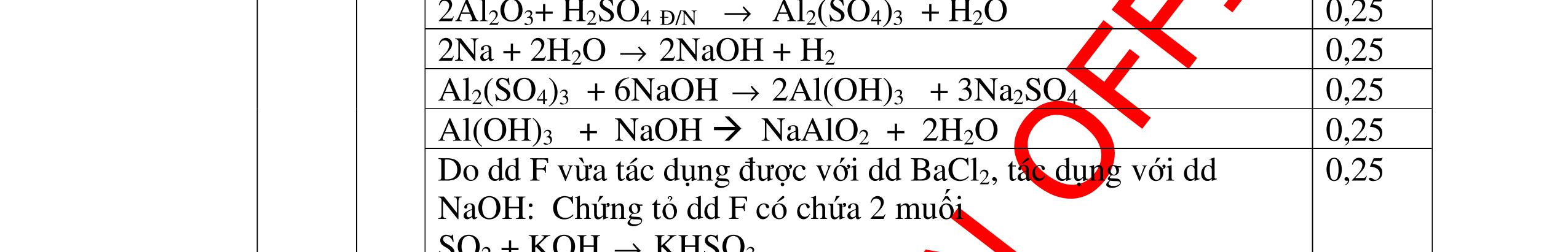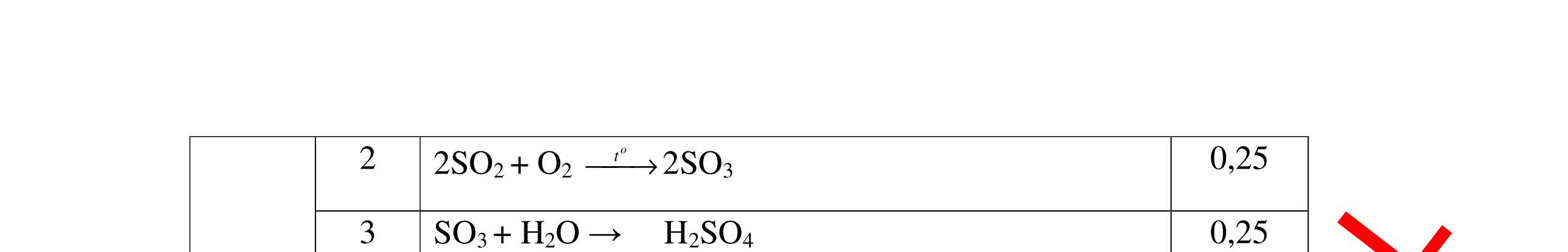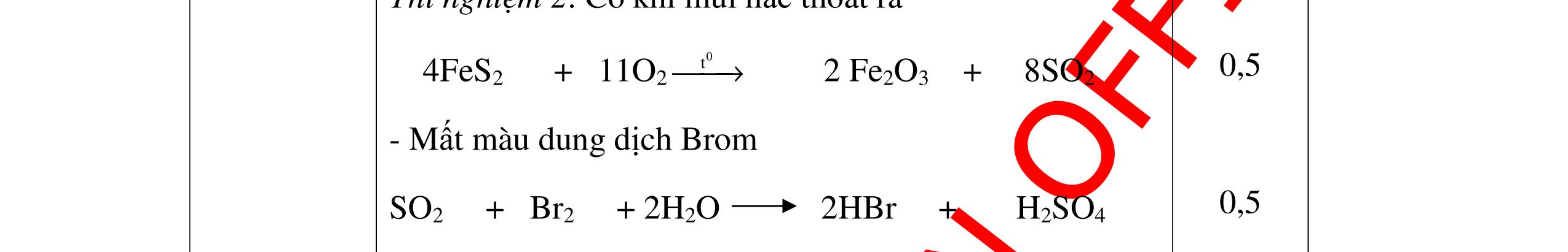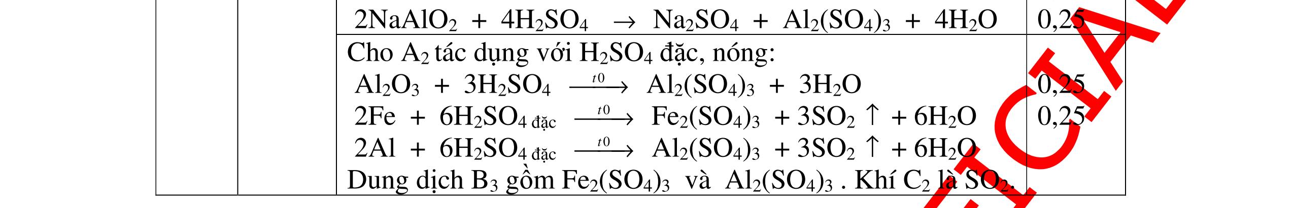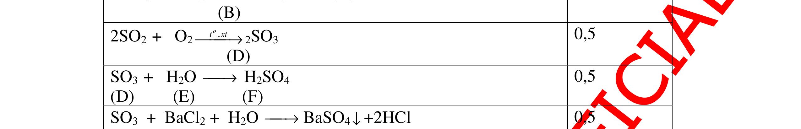 điều kiện cần thiết. Viết phương trình hóa học điều chế các chất theo sơ đồ chuyển hóa sau: Cu→CuO→Cu. Biết Fe có thể phản ứng với CuSO4 theo phương trình Fe + CuSO4 →FeSO4 + Cu b) SO2 + 2H2O + Br2 → H2SO4 + 2HBr 0,25 2 A, B, C, D lần lượt là: Cu(OH)2, CuO, Cu, H2SO4. Các phương trình hóa học: H2SO4 + Cu(OH)2 → CuSO4 + 2H2O H2SO4 + CuO → CuSO4 + H2O 2H2SO4 đặc,nóng + Cu → CuSO4 + 2H2O + SO2↑ CuSO4 + BaCl2 → BaSO4 + CuCl2 CuCl2 + 2AgNO3 → 2AgCl↓ + Cu(NO3)2 Cu(NO3)2 + 2NaOH → Cu(OH)2↓ + 2NaNO3 Cu(OH)2 → CuO + H2O CuO + CO → Cu + CO2 0,25 0,25 0,25 0,25 0,25 0,25 0,25 0,25 Câu2 Ý Hướngdẫnchấm Biểu điểm 1 1 4FeS2 + 11O2 > 2Fe2O3 + 8SO2 0,5 2 6KOH + Al2(SO4)3 > 3K2SO4 + 2Al(OH)3 0,5 3 FeO + 2HCl > FeCl2 + H2O 0,5 4 FexOy + yCO > xFeO + yCO2 0,5 5 2 Al + 6 H2SO4 Al2(SO4)3 + 3 SO2 + 6 H2O 0,5 6 3Fe3O4 + 8Al 0t → 9Fe + 4Al2O3 0,5 7 FexOy + yH2 0t → xFe + yH2O 0,5 8 2Fe + 3Cl2 0t → 2 FeCl3 0,25 2 1 2KMnO4 to K2MnO4 + MnO2+ O2 (điều chế O2) 0.25 2 Fe +2HCl →FeCl2 + H2 (điều chế H2) 0.25 3 Fe + CuSO4 →FeSO4 + Cu (điều chế Cu) 0.25 4 2Cu + O2 to 2CuO (điều chế CuO) 0.25 5 CuO + H2 to Cu+ H2O (điều chế Cu) 0.25 t0 t0
