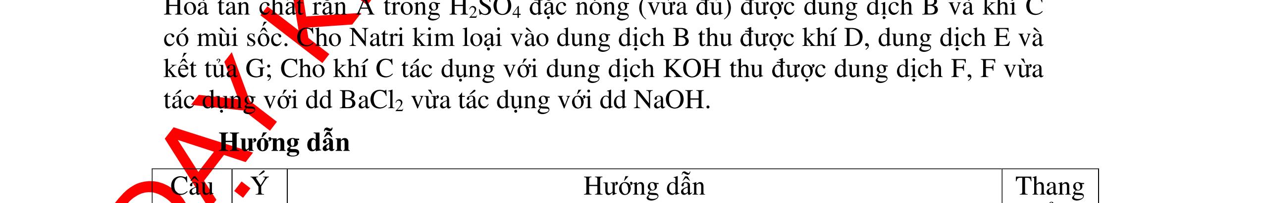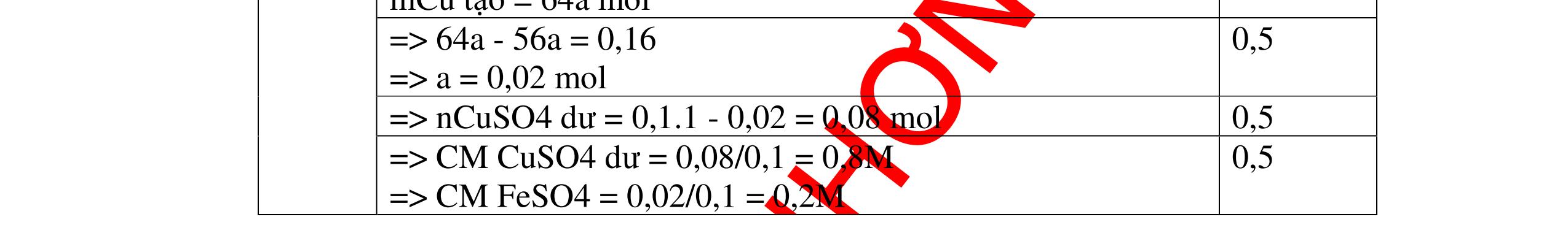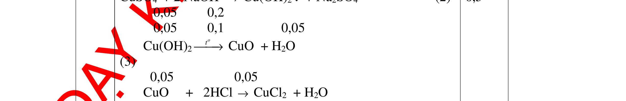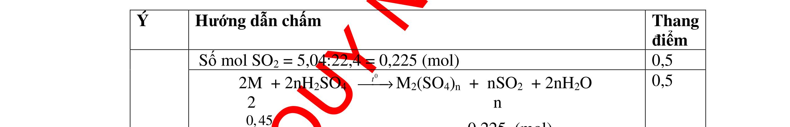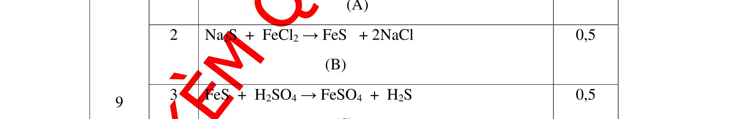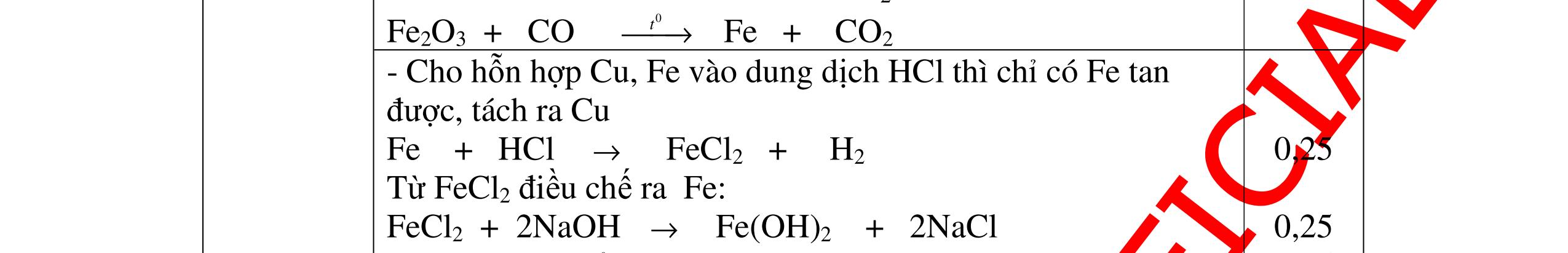 điều kiện cần thiết. Viết phương trình hóa học điều chế các chất theo sơ đồ chuyển hóa sau: Cu→CuO→Cu. Biết Fe có thể phản ứng với CuSO4 theo phương trình Fe + CuSO4 →FeSO4 + Cu b) SO2 + 2H2O + Br2 → H2SO4 + 2HBr 0,25 2 A, B, C, D lần lượt là: Cu(OH)2, CuO, Cu, H2SO4. Các phương trình hóa học: H2SO4 + Cu(OH)2 → CuSO4 + 2H2O H2SO4 + CuO → CuSO4 + H2O 2H2SO4 đặc,nóng + Cu → CuSO4 + 2H2O + SO2↑ CuSO4 + BaCl2 → BaSO4 + CuCl2 CuCl2 + 2AgNO3 → 2AgCl↓ + Cu(NO3)2 Cu(NO3)2 + 2NaOH → Cu(OH)2↓ + 2NaNO3 Cu(OH)2 → CuO + H2O CuO + CO → Cu + CO2 0,25 0,25 0,25 0,25 0,25 0,25 0,25 0,25 Câu2 Ý Hướngdẫnchấm Biểu điểm 1 1 4FeS2 + 11O2 > 2Fe2O3 + 8SO2 0,5 2 6KOH + Al2(SO4)3 > 3K2SO4 + 2Al(OH)3 0,5 3 FeO + 2HCl > FeCl2 + H2O 0,5 4 FexOy + yCO > xFeO + yCO2 0,5 5 2 Al + 6 H2SO4 Al2(SO4)3 + 3 SO2 + 6 H2O 0,5 6 3Fe3O4 + 8Al 0t → 9Fe + 4Al2O3 0,5 7 FexOy + yH2 0t → xFe + yH2O 0,5 8 2Fe + 3Cl2 0t → 2 FeCl3 0,25 2 1 2KMnO4 to K2MnO4 + MnO2+ O2 (điều chế O2) 0.25 2 Fe +2HCl →FeCl2 + H2 (điều chế H2) 0.25 3 Fe + CuSO4 →FeSO4 + Cu (điều chế Cu) 0.25 4 2Cu + O2 to 2CuO (điều chế CuO) 0.25 5 CuO + H2 to Cu+ H2O (điều chế Cu) 0.25 t0 t0