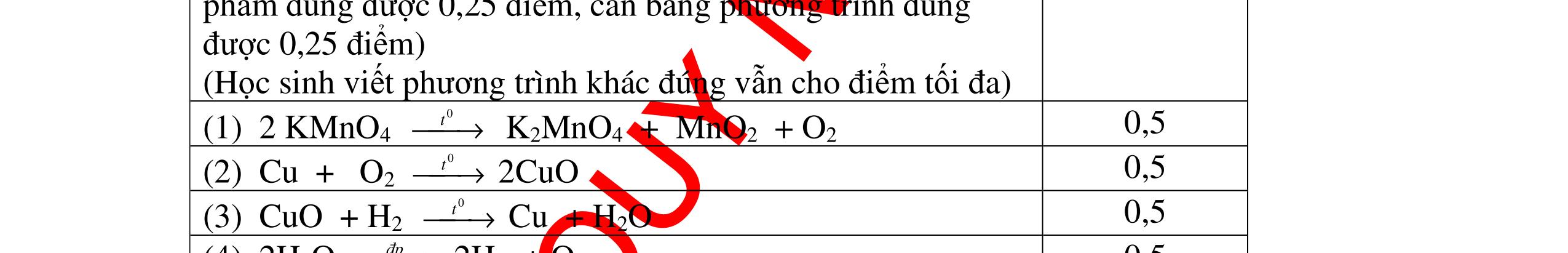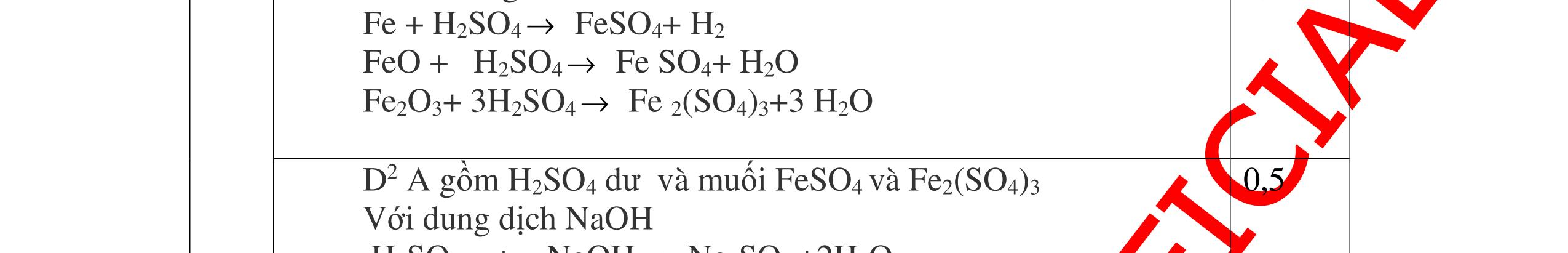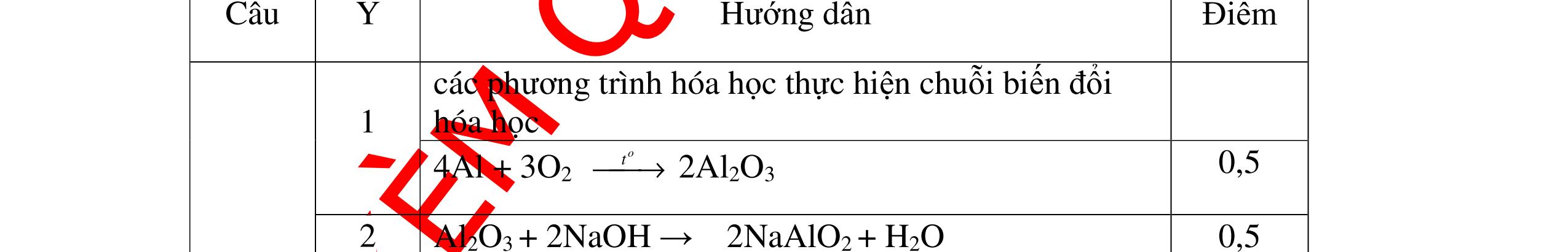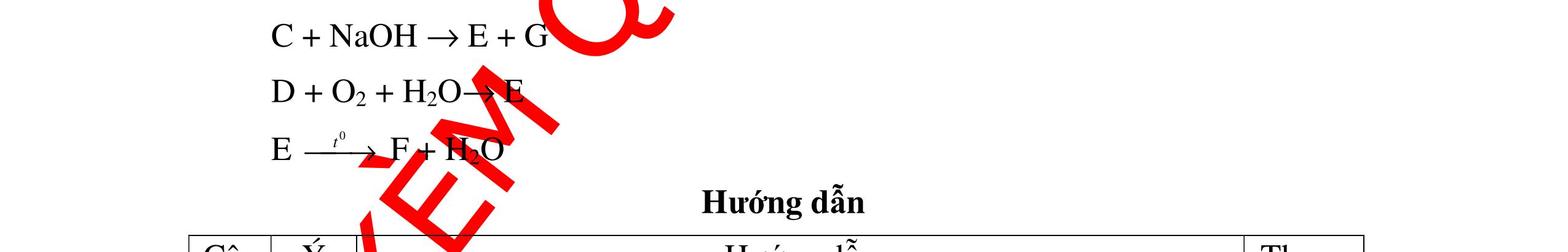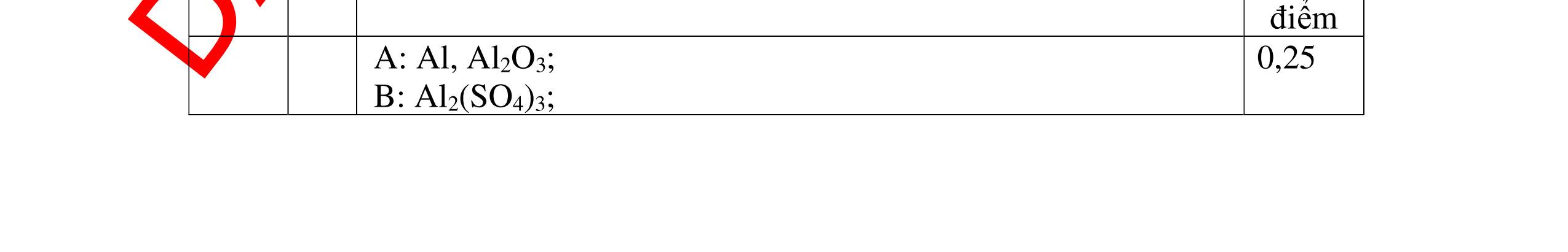 điều kiện cần thiết. Viết phương trình hóa học điều chế các chất theo sơ đồ chuyển hóa sau: Cu→CuO→Cu. Biết Fe có thể phản ứng với CuSO4 theo phương trình Fe + CuSO4 →FeSO4 + Cu b) SO2 + 2H2O + Br2 → H2SO4 + 2HBr 0,25 2 A, B, C, D lần lượt là: Cu(OH)2, CuO, Cu, H2SO4. Các phương trình hóa học: H2SO4 + Cu(OH)2 → CuSO4 + 2H2O H2SO4 + CuO → CuSO4 + H2O 2H2SO4 đặc,nóng + Cu → CuSO4 + 2H2O + SO2↑ CuSO4 + BaCl2 → BaSO4 + CuCl2 CuCl2 + 2AgNO3 → 2AgCl↓ + Cu(NO3)2 Cu(NO3)2 + 2NaOH → Cu(OH)2↓ + 2NaNO3 Cu(OH)2 → CuO + H2O CuO + CO → Cu + CO2 0,25 0,25 0,25 0,25 0,25 0,25 0,25 0,25 Câu2 Ý Hướngdẫnchấm Biểu điểm 1 1 4FeS2 + 11O2 > 2Fe2O3 + 8SO2 0,5 2 6KOH + Al2(SO4)3 > 3K2SO4 + 2Al(OH)3 0,5 3 FeO + 2HCl > FeCl2 + H2O 0,5 4 FexOy + yCO > xFeO + yCO2 0,5 5 2 Al + 6 H2SO4 Al2(SO4)3 + 3 SO2 + 6 H2O 0,5 6 3Fe3O4 + 8Al 0t → 9Fe + 4Al2O3 0,5 7 FexOy + yH2 0t → xFe + yH2O 0,5 8 2Fe + 3Cl2 0t → 2 FeCl3 0,25 2 1 2KMnO4 to K2MnO4 + MnO2+ O2 (điều chế O2) 0.25 2 Fe +2HCl →FeCl2 + H2 (điều chế H2) 0.25 3 Fe + CuSO4 →FeSO4 + Cu (điều chế Cu) 0.25 4 2Cu + O2 to 2CuO (điều chế CuO) 0.25 5 CuO + H2 to Cu+ H2O (điều chế Cu) 0.25 t0 t0