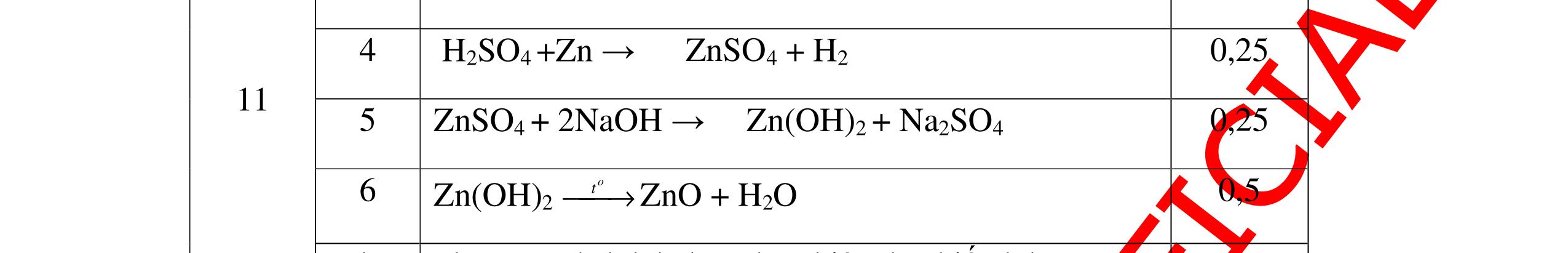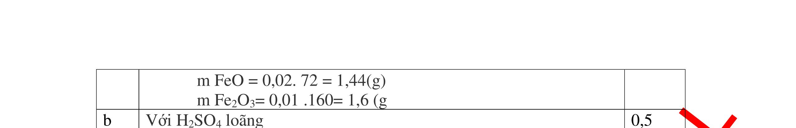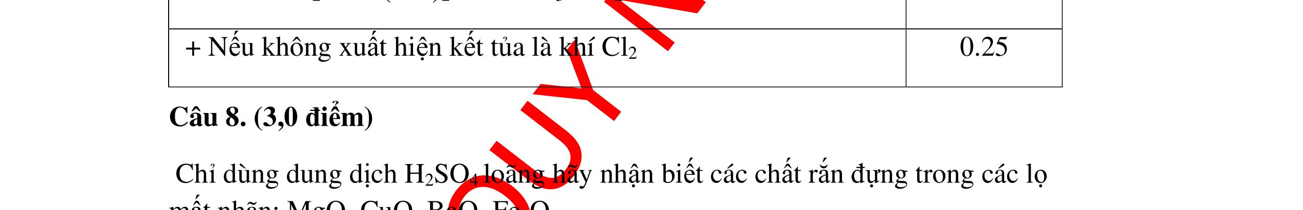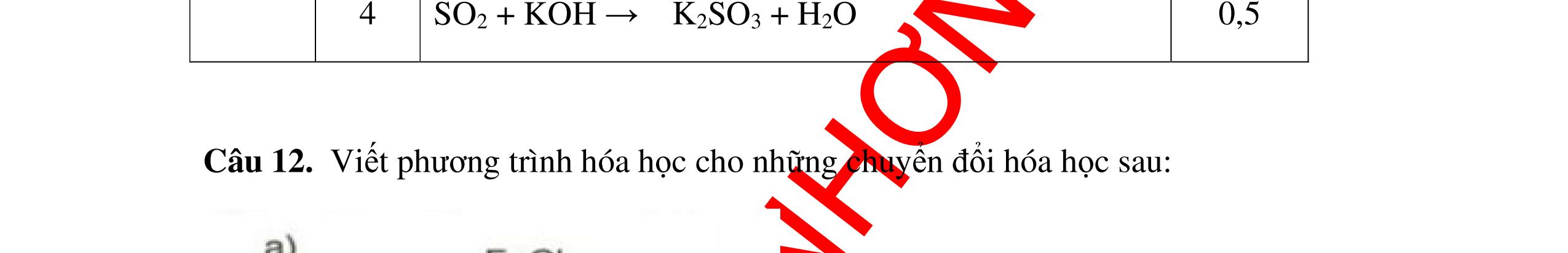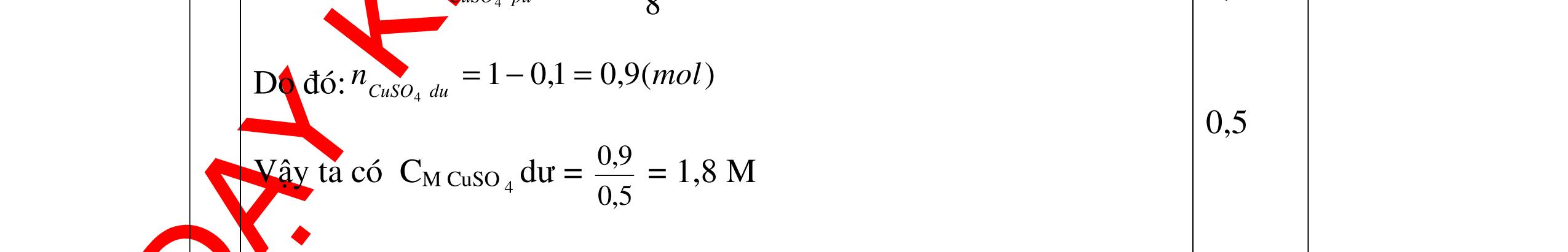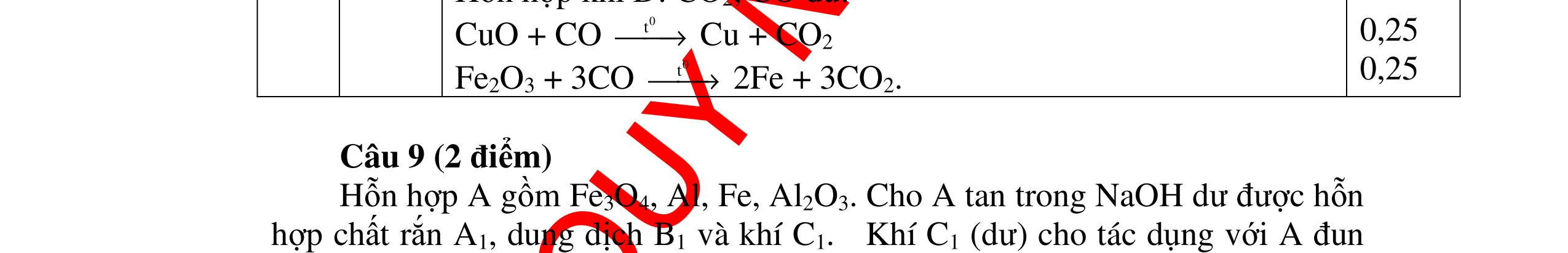 điều kiện cần thiết. Viết phương trình hóa học điều chế các chất theo sơ đồ chuyển hóa sau: Cu→CuO→Cu. Biết Fe có thể phản ứng với CuSO4 theo phương trình Fe + CuSO4 →FeSO4 + Cu b) SO2 + 2H2O + Br2 → H2SO4 + 2HBr 0,25 2 A, B, C, D lần lượt là: Cu(OH)2, CuO, Cu, H2SO4. Các phương trình hóa học: H2SO4 + Cu(OH)2 → CuSO4 + 2H2O H2SO4 + CuO → CuSO4 + H2O 2H2SO4 đặc,nóng + Cu → CuSO4 + 2H2O + SO2↑ CuSO4 + BaCl2 → BaSO4 + CuCl2 CuCl2 + 2AgNO3 → 2AgCl↓ + Cu(NO3)2 Cu(NO3)2 + 2NaOH → Cu(OH)2↓ + 2NaNO3 Cu(OH)2 → CuO + H2O CuO + CO → Cu + CO2 0,25 0,25 0,25 0,25 0,25 0,25 0,25 0,25 Câu2 Ý Hướngdẫnchấm Biểu điểm 1 1 4FeS2 + 11O2 > 2Fe2O3 + 8SO2 0,5 2 6KOH + Al2(SO4)3 > 3K2SO4 + 2Al(OH)3 0,5 3 FeO + 2HCl > FeCl2 + H2O 0,5 4 FexOy + yCO > xFeO + yCO2 0,5 5 2 Al + 6 H2SO4 Al2(SO4)3 + 3 SO2 + 6 H2O 0,5 6 3Fe3O4 + 8Al 0t → 9Fe + 4Al2O3 0,5 7 FexOy + yH2 0t → xFe + yH2O 0,5 8 2Fe + 3Cl2 0t → 2 FeCl3 0,25 2 1 2KMnO4 to K2MnO4 + MnO2+ O2 (điều chế O2) 0.25 2 Fe +2HCl →FeCl2 + H2 (điều chế H2) 0.25 3 Fe + CuSO4 →FeSO4 + Cu (điều chế Cu) 0.25 4 2Cu + O2 to 2CuO (điều chế CuO) 0.25 5 CuO + H2 to Cu+ H2O (điều chế Cu) 0.25 t0 t0