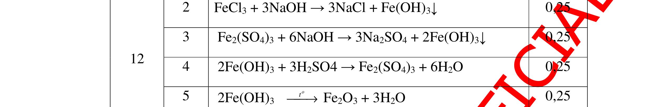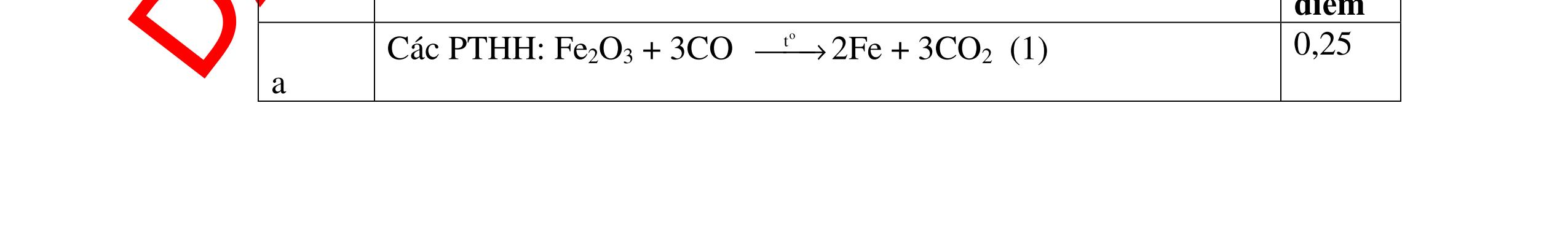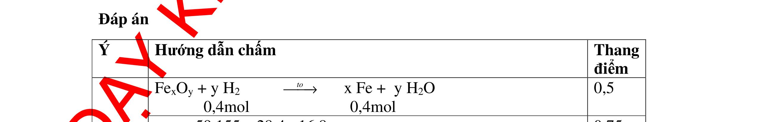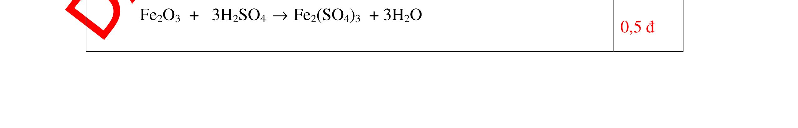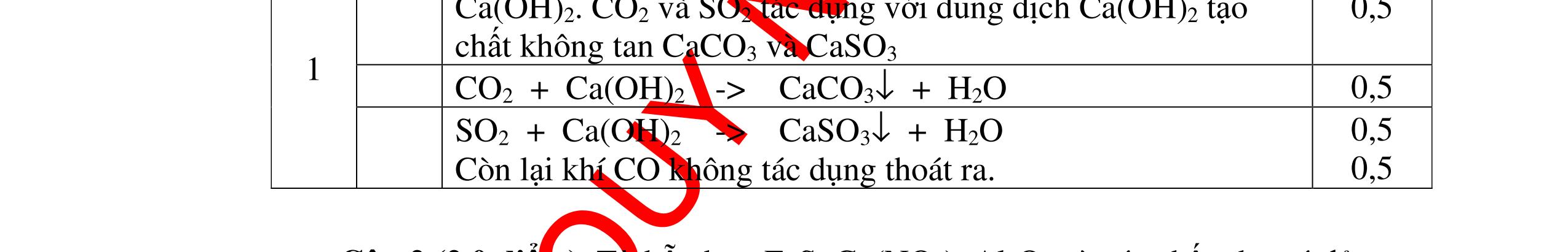 điều kiện cần thiết. Viết phương trình hóa học điều chế các chất theo sơ đồ chuyển hóa sau: Cu→CuO→Cu. Biết Fe có thể phản ứng với CuSO4 theo phương trình Fe + CuSO4 →FeSO4 + Cu b) SO2 + 2H2O + Br2 → H2SO4 + 2HBr 0,25 2 A, B, C, D lần lượt là: Cu(OH)2, CuO, Cu, H2SO4. Các phương trình hóa học: H2SO4 + Cu(OH)2 → CuSO4 + 2H2O H2SO4 + CuO → CuSO4 + H2O 2H2SO4 đặc,nóng + Cu → CuSO4 + 2H2O + SO2↑ CuSO4 + BaCl2 → BaSO4 + CuCl2 CuCl2 + 2AgNO3 → 2AgCl↓ + Cu(NO3)2 Cu(NO3)2 + 2NaOH → Cu(OH)2↓ + 2NaNO3 Cu(OH)2 → CuO + H2O CuO + CO → Cu + CO2 0,25 0,25 0,25 0,25 0,25 0,25 0,25 0,25 Câu2 Ý Hướngdẫnchấm Biểu điểm 1 1 4FeS2 + 11O2 > 2Fe2O3 + 8SO2 0,5 2 6KOH + Al2(SO4)3 > 3K2SO4 + 2Al(OH)3 0,5 3 FeO + 2HCl > FeCl2 + H2O 0,5 4 FexOy + yCO > xFeO + yCO2 0,5 5 2 Al + 6 H2SO4 Al2(SO4)3 + 3 SO2 + 6 H2O 0,5 6 3Fe3O4 + 8Al 0t → 9Fe + 4Al2O3 0,5 7 FexOy + yH2 0t → xFe + yH2O 0,5 8 2Fe + 3Cl2 0t → 2 FeCl3 0,25 2 1 2KMnO4 to K2MnO4 + MnO2+ O2 (điều chế O2) 0.25 2 Fe +2HCl →FeCl2 + H2 (điều chế H2) 0.25 3 Fe + CuSO4 →FeSO4 + Cu (điều chế Cu) 0.25 4 2Cu + O2 to 2CuO (điều chế CuO) 0.25 5 CuO + H2 to Cu+ H2O (điều chế Cu) 0.25 t0 t0