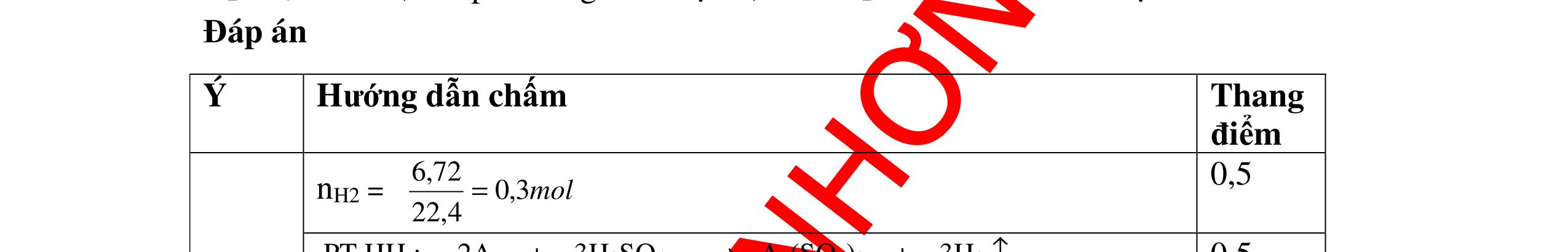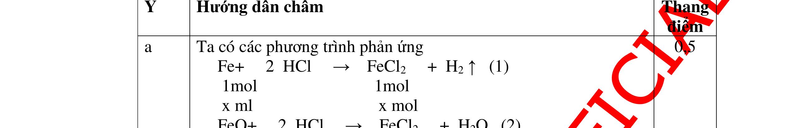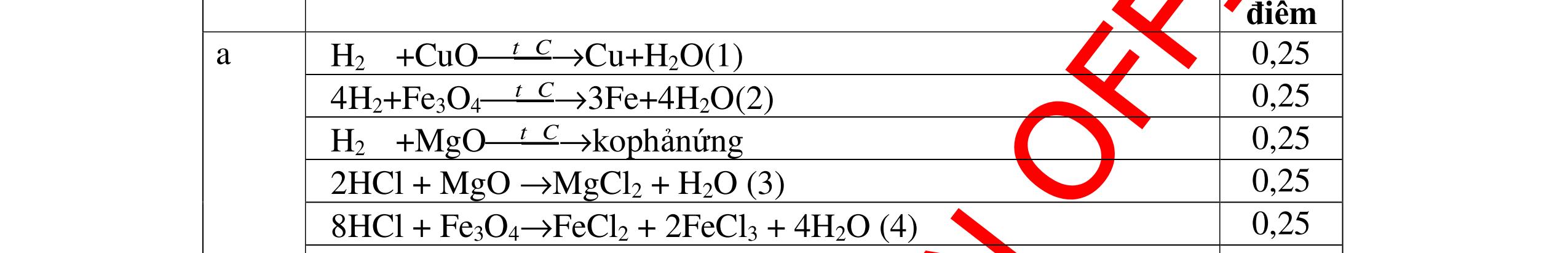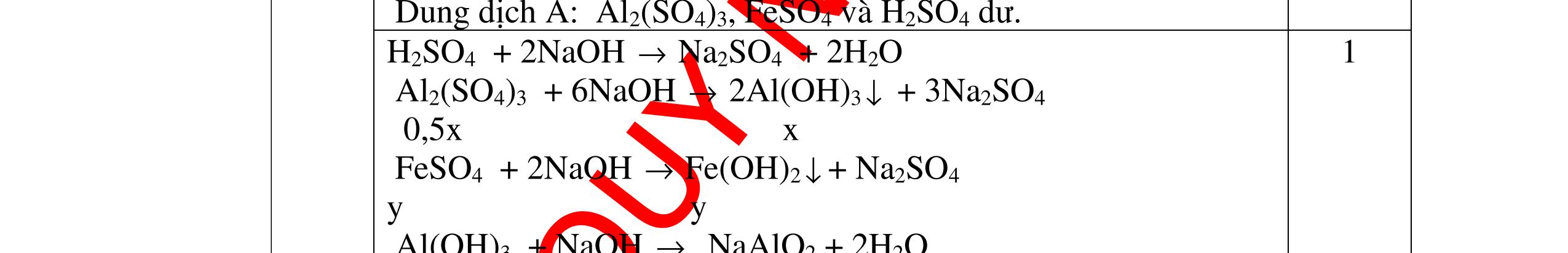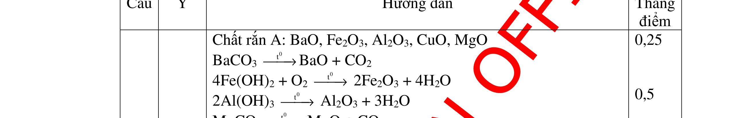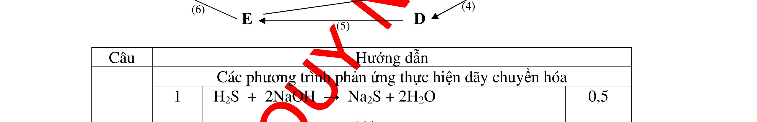 điều kiện cần thiết. Viết phương trình hóa học điều chế các chất theo sơ đồ chuyển hóa sau: Cu→CuO→Cu. Biết Fe có thể phản ứng với CuSO4 theo phương trình Fe + CuSO4 →FeSO4 + Cu b) SO2 + 2H2O + Br2 → H2SO4 + 2HBr 0,25 2 A, B, C, D lần lượt là: Cu(OH)2, CuO, Cu, H2SO4. Các phương trình hóa học: H2SO4 + Cu(OH)2 → CuSO4 + 2H2O H2SO4 + CuO → CuSO4 + H2O 2H2SO4 đặc,nóng + Cu → CuSO4 + 2H2O + SO2↑ CuSO4 + BaCl2 → BaSO4 + CuCl2 CuCl2 + 2AgNO3 → 2AgCl↓ + Cu(NO3)2 Cu(NO3)2 + 2NaOH → Cu(OH)2↓ + 2NaNO3 Cu(OH)2 → CuO + H2O CuO + CO → Cu + CO2 0,25 0,25 0,25 0,25 0,25 0,25 0,25 0,25 Câu2 Ý Hướngdẫnchấm Biểu điểm 1 1 4FeS2 + 11O2 > 2Fe2O3 + 8SO2 0,5 2 6KOH + Al2(SO4)3 > 3K2SO4 + 2Al(OH)3 0,5 3 FeO + 2HCl > FeCl2 + H2O 0,5 4 FexOy + yCO > xFeO + yCO2 0,5 5 2 Al + 6 H2SO4 Al2(SO4)3 + 3 SO2 + 6 H2O 0,5 6 3Fe3O4 + 8Al 0t → 9Fe + 4Al2O3 0,5 7 FexOy + yH2 0t → xFe + yH2O 0,5 8 2Fe + 3Cl2 0t → 2 FeCl3 0,25 2 1 2KMnO4 to K2MnO4 + MnO2+ O2 (điều chế O2) 0.25 2 Fe +2HCl →FeCl2 + H2 (điều chế H2) 0.25 3 Fe + CuSO4 →FeSO4 + Cu (điều chế Cu) 0.25 4 2Cu + O2 to 2CuO (điều chế CuO) 0.25 5 CuO + H2 to Cu+ H2O (điều chế Cu) 0.25 t0 t0