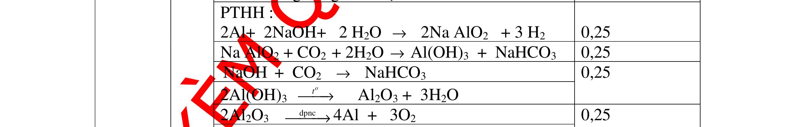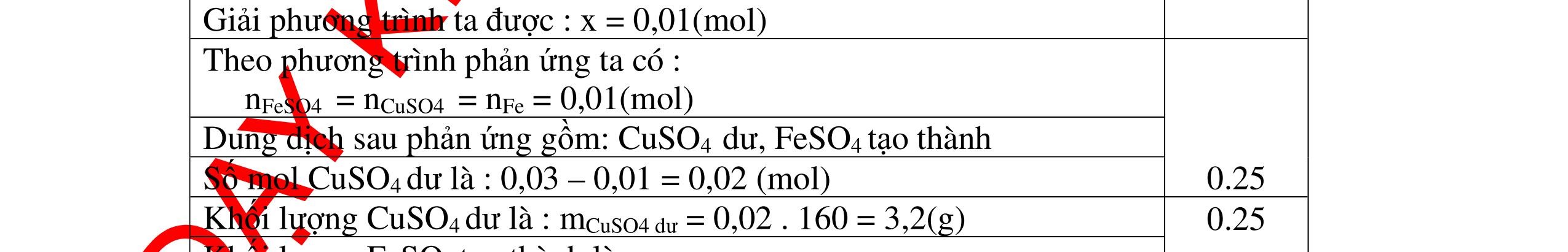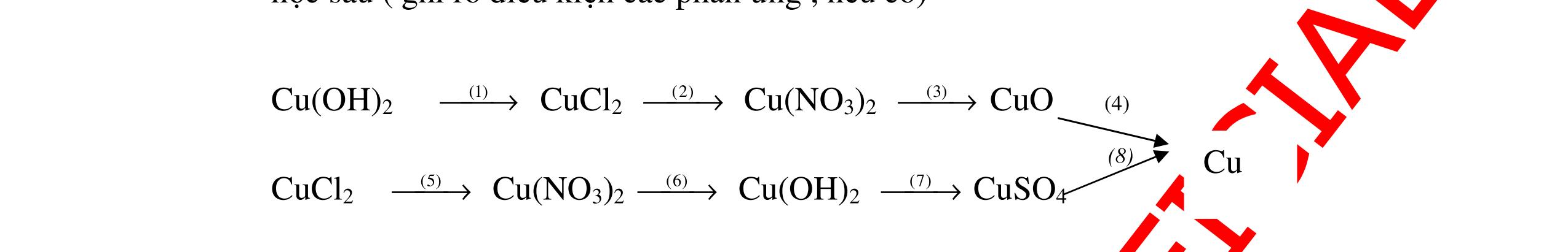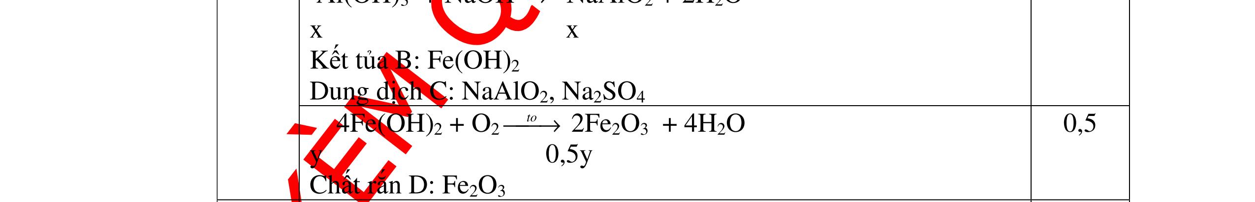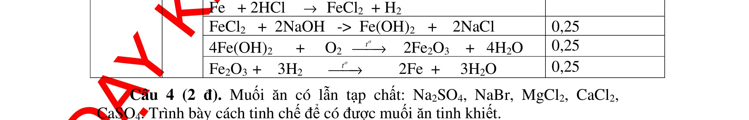 điều kiện cần thiết. Viết phương trình hóa học điều chế các chất theo sơ đồ chuyển hóa sau: Cu→CuO→Cu. Biết Fe có thể phản ứng với CuSO4 theo phương trình Fe + CuSO4 →FeSO4 + Cu b) SO2 + 2H2O + Br2 → H2SO4 + 2HBr 0,25 2 A, B, C, D lần lượt là: Cu(OH)2, CuO, Cu, H2SO4. Các phương trình hóa học: H2SO4 + Cu(OH)2 → CuSO4 + 2H2O H2SO4 + CuO → CuSO4 + H2O 2H2SO4 đặc,nóng + Cu → CuSO4 + 2H2O + SO2↑ CuSO4 + BaCl2 → BaSO4 + CuCl2 CuCl2 + 2AgNO3 → 2AgCl↓ + Cu(NO3)2 Cu(NO3)2 + 2NaOH → Cu(OH)2↓ + 2NaNO3 Cu(OH)2 → CuO + H2O CuO + CO → Cu + CO2 0,25 0,25 0,25 0,25 0,25 0,25 0,25 0,25 Câu2 Ý Hướngdẫnchấm Biểu điểm 1 1 4FeS2 + 11O2 > 2Fe2O3 + 8SO2 0,5 2 6KOH + Al2(SO4)3 > 3K2SO4 + 2Al(OH)3 0,5 3 FeO + 2HCl > FeCl2 + H2O 0,5 4 FexOy + yCO > xFeO + yCO2 0,5 5 2 Al + 6 H2SO4 Al2(SO4)3 + 3 SO2 + 6 H2O 0,5 6 3Fe3O4 + 8Al 0t → 9Fe + 4Al2O3 0,5 7 FexOy + yH2 0t → xFe + yH2O 0,5 8 2Fe + 3Cl2 0t → 2 FeCl3 0,25 2 1 2KMnO4 to K2MnO4 + MnO2+ O2 (điều chế O2) 0.25 2 Fe +2HCl →FeCl2 + H2 (điều chế H2) 0.25 3 Fe + CuSO4 →FeSO4 + Cu (điều chế Cu) 0.25 4 2Cu + O2 to 2CuO (điều chế CuO) 0.25 5 CuO + H2 to Cu+ H2O (điều chế Cu) 0.25 t0 t0