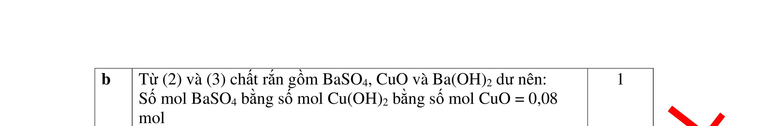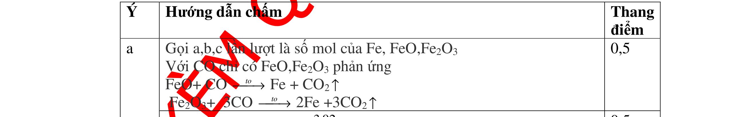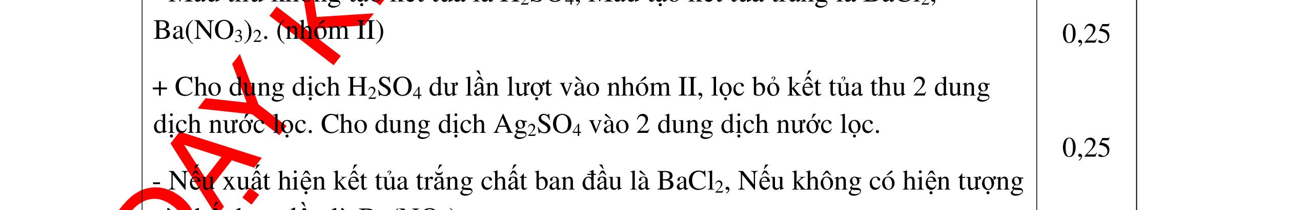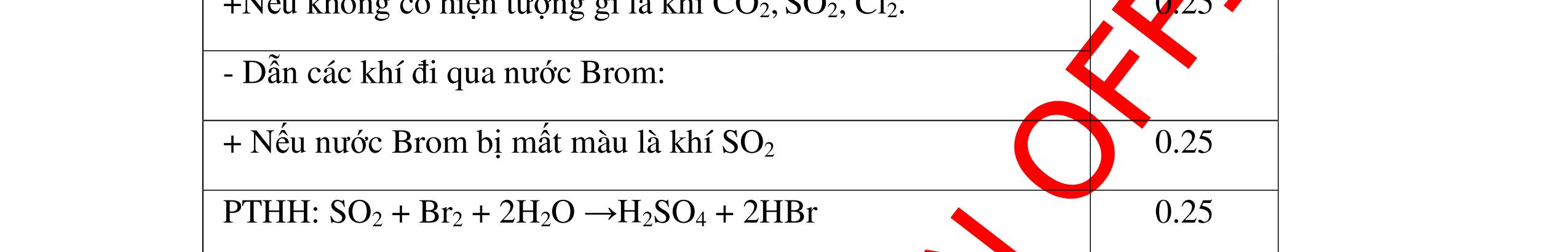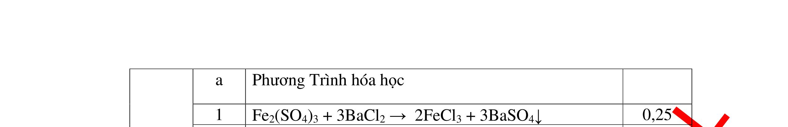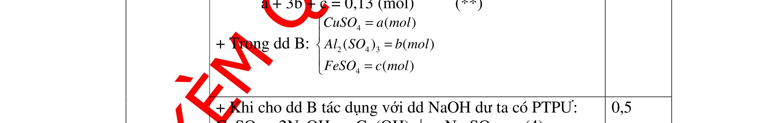 điều kiện cần thiết. Viết phương trình hóa học điều chế các chất theo sơ đồ chuyển hóa sau: Cu→CuO→Cu. Biết Fe có thể phản ứng với CuSO4 theo phương trình Fe + CuSO4 →FeSO4 + Cu b) SO2 + 2H2O + Br2 → H2SO4 + 2HBr 0,25 2 A, B, C, D lần lượt là: Cu(OH)2, CuO, Cu, H2SO4. Các phương trình hóa học: H2SO4 + Cu(OH)2 → CuSO4 + 2H2O H2SO4 + CuO → CuSO4 + H2O 2H2SO4 đặc,nóng + Cu → CuSO4 + 2H2O + SO2↑ CuSO4 + BaCl2 → BaSO4 + CuCl2 CuCl2 + 2AgNO3 → 2AgCl↓ + Cu(NO3)2 Cu(NO3)2 + 2NaOH → Cu(OH)2↓ + 2NaNO3 Cu(OH)2 → CuO + H2O CuO + CO → Cu + CO2 0,25 0,25 0,25 0,25 0,25 0,25 0,25 0,25 Câu2 Ý Hướngdẫnchấm Biểu điểm 1 1 4FeS2 + 11O2 > 2Fe2O3 + 8SO2 0,5 2 6KOH + Al2(SO4)3 > 3K2SO4 + 2Al(OH)3 0,5 3 FeO + 2HCl > FeCl2 + H2O 0,5 4 FexOy + yCO > xFeO + yCO2 0,5 5 2 Al + 6 H2SO4 Al2(SO4)3 + 3 SO2 + 6 H2O 0,5 6 3Fe3O4 + 8Al 0t → 9Fe + 4Al2O3 0,5 7 FexOy + yH2 0t → xFe + yH2O 0,5 8 2Fe + 3Cl2 0t → 2 FeCl3 0,25 2 1 2KMnO4 to K2MnO4 + MnO2+ O2 (điều chế O2) 0.25 2 Fe +2HCl →FeCl2 + H2 (điều chế H2) 0.25 3 Fe + CuSO4 →FeSO4 + Cu (điều chế Cu) 0.25 4 2Cu + O2 to 2CuO (điều chế CuO) 0.25 5 CuO + H2 to Cu+ H2O (điều chế Cu) 0.25 t0 t0