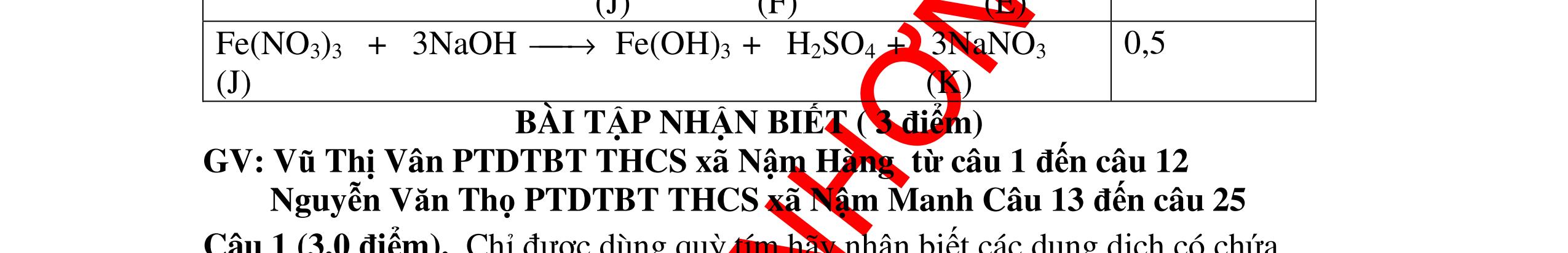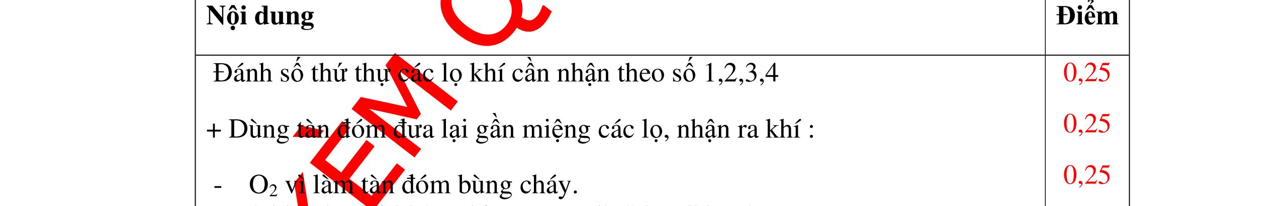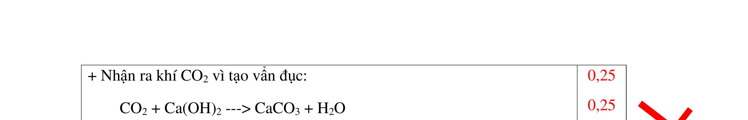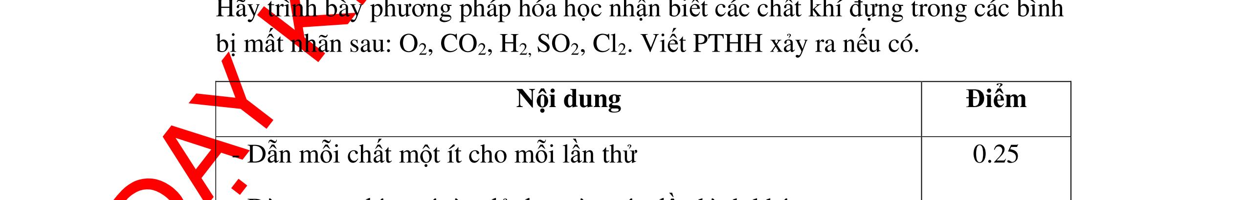 DẠYKÈMQUYNHƠNOFFICIAL CHUYÊN ĐỀ NHẬNBIẾTCÁCCHẤT(3 điểm) Ngườithựchiện: 1)LòThị Bích-TrườngPTDTBTTHCSNậmHàng(Từ câu1–20) Câu1(3.0 điểm): Bằng cách nào có thể nhận biết các khí sau đựng riêng biệt bị mất nhãn: không khí, khí hiđrô, khí oxi, khí cacbonic? Giải thích và viết phương trình hóa học (nếu có)? Câu2(3.0 điểm):Trình bày phương pháp nhận biết các dung dịch đựng trong 4 lọ mất nhãn sau: Nước, Natri hiđôxit, Axit clohiđric, Natriclorua? Viết phương trình phản ứng xảy ra (nếu có)? Câu3(3.0 điểm): Có 4 khí: O2 , H2 , CO2 và N2 đựng trong 4 lọ riêng biệt. Hãy trình bày phương pháp hóa học nhận biết mỗi lọ khí và Viết phương trình phản ứng xảy ra (nếu có)? CâuÝ Hướngdẫnchấm Thang điểm 1 - Lấy mỗi chất một ít cho mỗi lần thử - Cho các khí trên qua dung dịch nước vôi trong Ca(OH)2 dư, khí nào làm đục nước vôi trong đó là khí CO2.