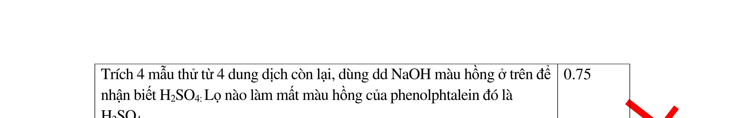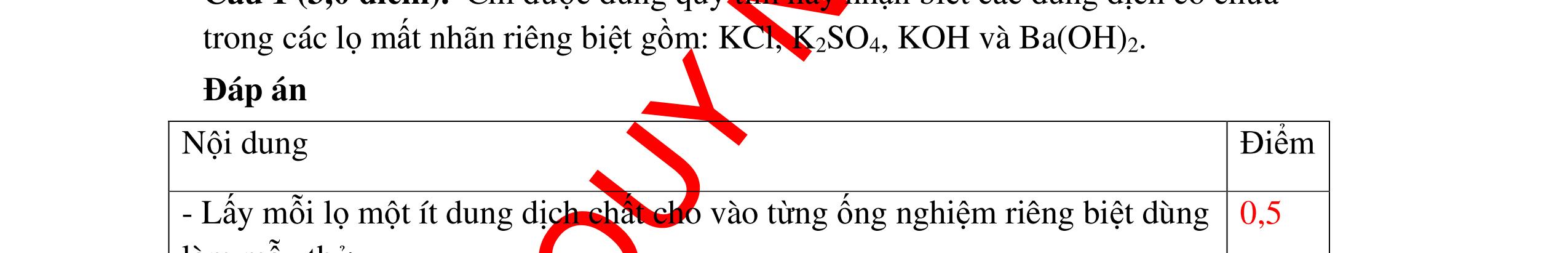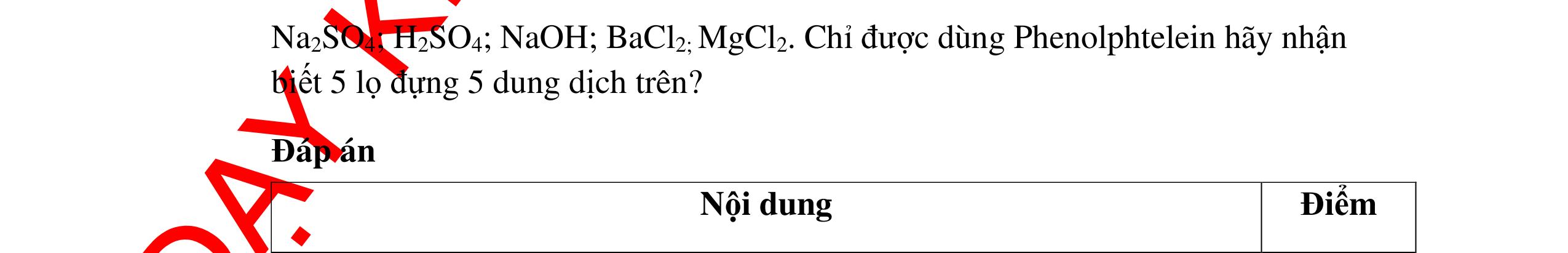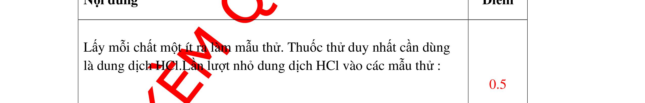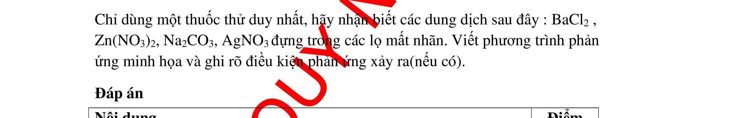 DẠYKÈMQUYNHƠNOFFICIAL CHUYÊN ĐỀ NHẬNBIẾTCÁCCHẤT(3 điểm) Ngườithựchiện: 1)LòThị Bích-TrườngPTDTBTTHCSNậmHàng(Từ câu1–20) Câu1(3.0 điểm): Bằng cách nào có thể nhận biết các khí sau đựng riêng biệt bị mất nhãn: không khí, khí hiđrô, khí oxi, khí cacbonic? Giải thích và viết phương trình hóa học (nếu có)? Câu2(3.0 điểm):Trình bày phương pháp nhận biết các dung dịch đựng trong 4 lọ mất nhãn sau: Nước, Natri hiđôxit, Axit clohiđric, Natriclorua? Viết phương trình phản ứng xảy ra (nếu có)? Câu3(3.0 điểm): Có 4 khí: O2 , H2 , CO2 và N2 đựng trong 4 lọ riêng biệt. Hãy trình bày phương pháp hóa học nhận biết mỗi lọ khí và Viết phương trình phản ứng xảy ra (nếu có)? CâuÝ Hướngdẫnchấm Thang điểm 1 - Lấy mỗi chất một ít cho mỗi lần thử - Cho các khí trên qua dung dịch nước vôi trong Ca(OH)2 dư, khí nào làm đục nước vôi trong đó là khí CO2.