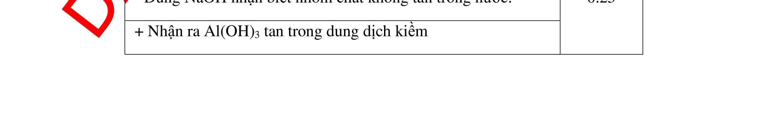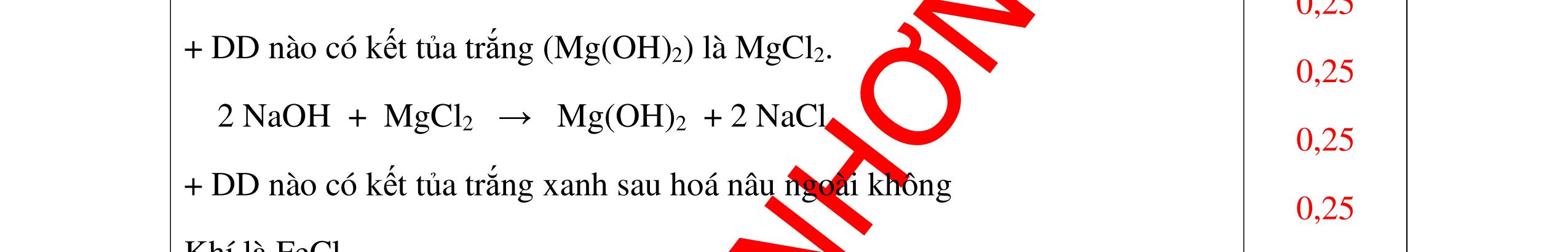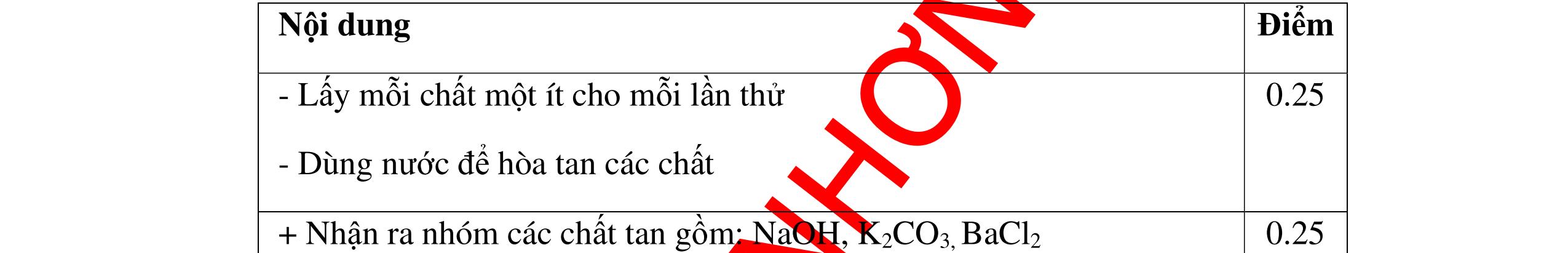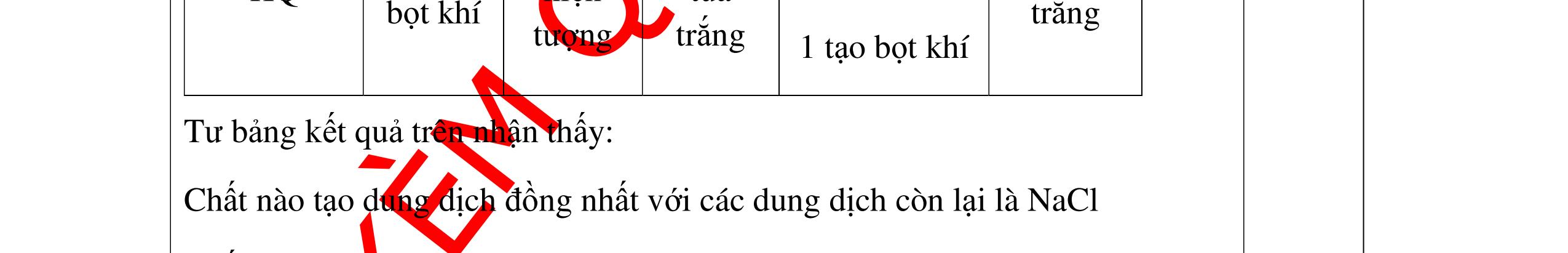 DẠYKÈMQUYNHƠNOFFICIAL CHUYÊN ĐỀ NHẬNBIẾTCÁCCHẤT(3 điểm) Ngườithựchiện: 1)LòThị Bích-TrườngPTDTBTTHCSNậmHàng(Từ câu1–20) Câu1(3.0 điểm): Bằng cách nào có thể nhận biết các khí sau đựng riêng biệt bị mất nhãn: không khí, khí hiđrô, khí oxi, khí cacbonic? Giải thích và viết phương trình hóa học (nếu có)? Câu2(3.0 điểm):Trình bày phương pháp nhận biết các dung dịch đựng trong 4 lọ mất nhãn sau: Nước, Natri hiđôxit, Axit clohiđric, Natriclorua? Viết phương trình phản ứng xảy ra (nếu có)? Câu3(3.0 điểm): Có 4 khí: O2 , H2 , CO2 và N2 đựng trong 4 lọ riêng biệt. Hãy trình bày phương pháp hóa học nhận biết mỗi lọ khí và Viết phương trình phản ứng xảy ra (nếu có)? CâuÝ Hướngdẫnchấm Thang điểm 1 - Lấy mỗi chất một ít cho mỗi lần thử - Cho các khí trên qua dung dịch nước vôi trong Ca(OH)2 dư, khí nào làm đục nước vôi trong đó là khí CO2.