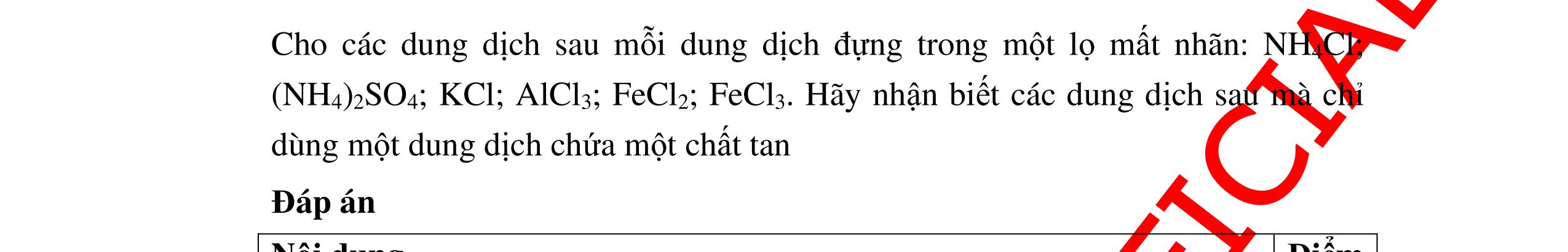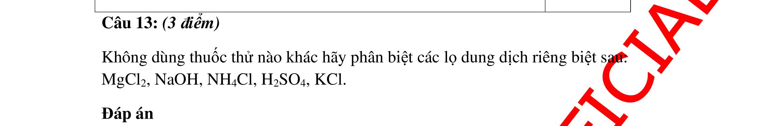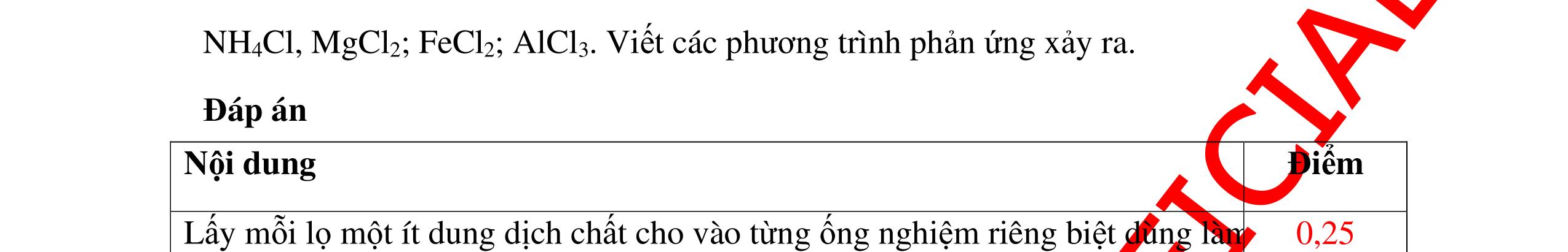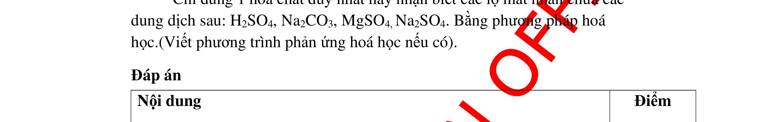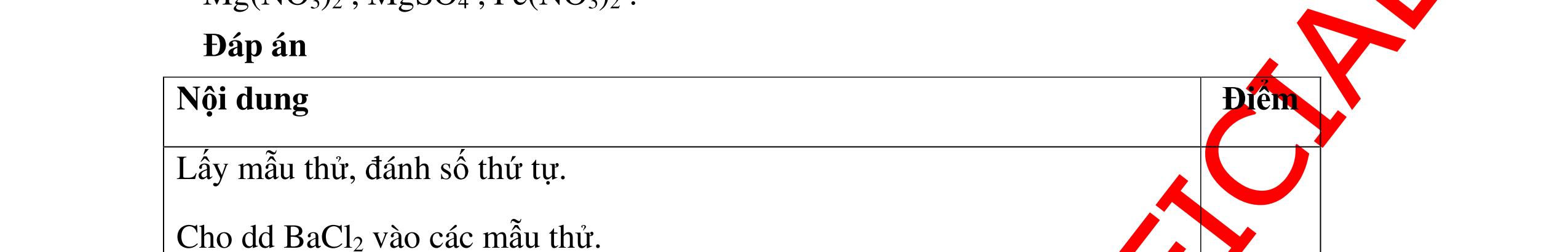 DẠYKÈMQUYNHƠNOFFICIAL CHUYÊN ĐỀ NHẬNBIẾTCÁCCHẤT(3 điểm) Ngườithựchiện: 1)LòThị Bích-TrườngPTDTBTTHCSNậmHàng(Từ câu1–20) Câu1(3.0 điểm): Bằng cách nào có thể nhận biết các khí sau đựng riêng biệt bị mất nhãn: không khí, khí hiđrô, khí oxi, khí cacbonic? Giải thích và viết phương trình hóa học (nếu có)? Câu2(3.0 điểm):Trình bày phương pháp nhận biết các dung dịch đựng trong 4 lọ mất nhãn sau: Nước, Natri hiđôxit, Axit clohiđric, Natriclorua? Viết phương trình phản ứng xảy ra (nếu có)? Câu3(3.0 điểm): Có 4 khí: O2 , H2 , CO2 và N2 đựng trong 4 lọ riêng biệt. Hãy trình bày phương pháp hóa học nhận biết mỗi lọ khí và Viết phương trình phản ứng xảy ra (nếu có)? CâuÝ Hướngdẫnchấm Thang điểm 1 - Lấy mỗi chất một ít cho mỗi lần thử - Cho các khí trên qua dung dịch nước vôi trong Ca(OH)2 dư, khí nào làm đục nước vôi trong đó là khí CO2.