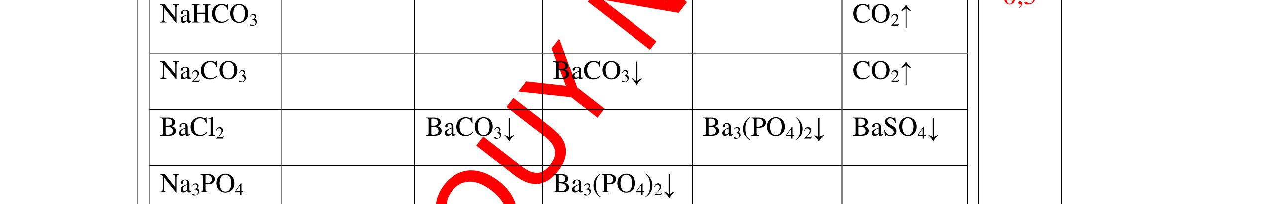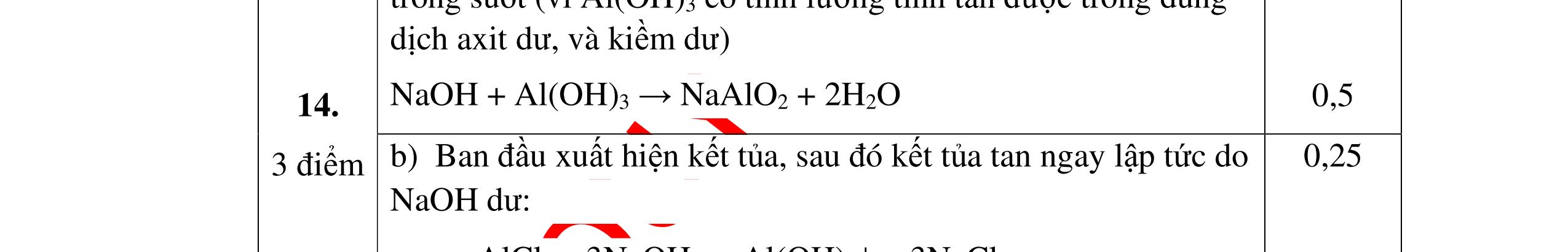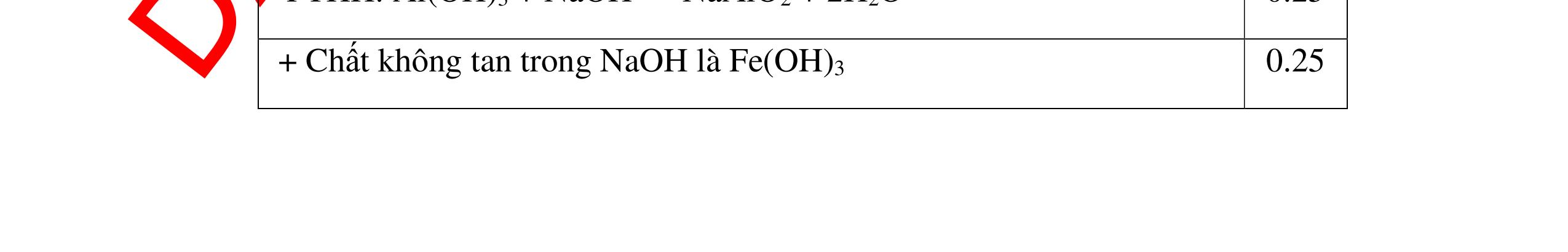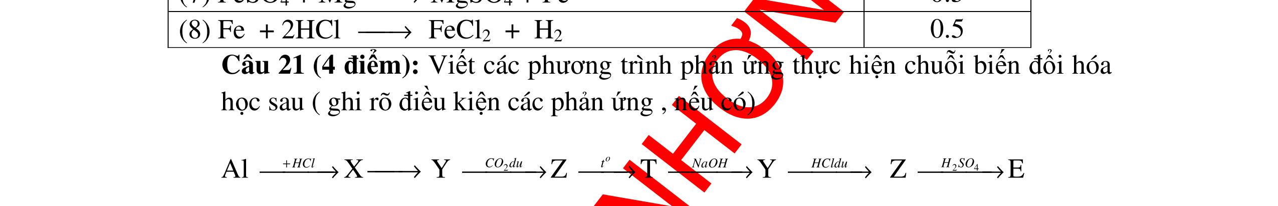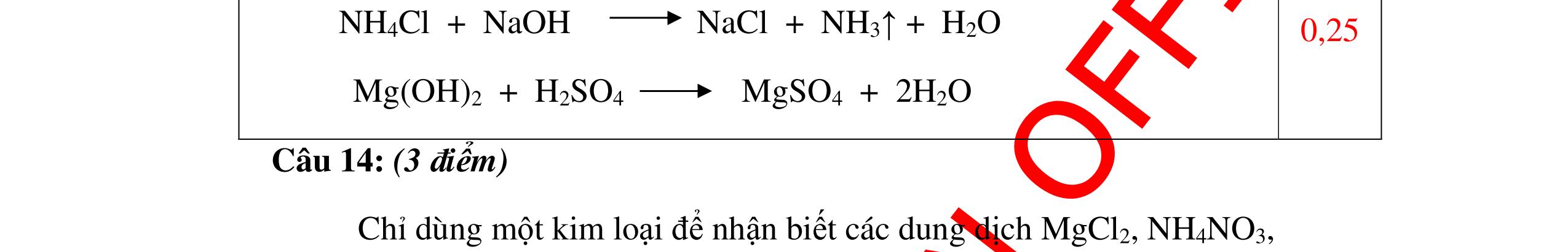 DẠYKÈMQUYNHƠNOFFICIAL 9 P2O5 + 3H2O → 2H3PO4 0,5 10 3 Fe + 2 O2 ot → Fe3O4 0,5 Câu13:(5 điểm) Hoànthànhcácphươngtrìnhphản ứngsauvàghirõ điềukiệnxảyraphản ứng(nếucó): 1. ..... + AgNO3 - - -> Al(NO3)3 + Ag 2. Zn + ..... ----> ZnCl2 + H2 ↑ 3. Fe(OH)3 + ...... ------> Fe2(SO4)3 + H2O 4. Na2CO3 + Ca(OH)2 - - -> CaCO3 + ..... 5. NaOH + ...... -----> Fe(OH)3 + NaCl 6. Al + O2 ----> ...... 7. BaCl2 + AgNO3 ------> AgCl + ......... 8. CaCO3 + HCl - - -> CaCl2 + ....... + ....... 9. Fe3O4 + H2 0t → ……… + ……… 10. Na2CO3 +………. → CaCO3 + NaCl 13 (5 điểm) 1 Al + 3AgNO3 → Al(NO3)3 + 3Ag 0.5 2 Zn + 2HCl → ZnCl2 + H2 ↑ 0.5 3 2Fe(OH)3 + 3H2SO4 → Fe2(SO4)3 + 6H2O 0.5 4 Na2CO3 + Ca(OH)2 → CaCO3 + 2NaOH 0.5 5 3NaOH + FeCl3 → Fe(OH)3 + 3NaCl 0.5 6 4Al + 3O2 0t → 2Al2O3 0.5 7 BaCl2 + 2AgNO3 → 2AgCl ↓ + Ba(NO3)2 0.5 8 CaCO3 + 2HCl → CaCl2 + CO2 ↑ + H2O 0.5 9 Fe3O4 + 4H2 0t → 3Fe + 4H2O 0,5 10 Na2CO3 + CaCl2 → CaCO3 + 2NaCl 0,5