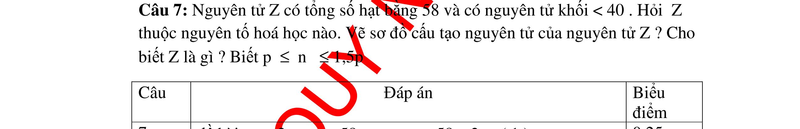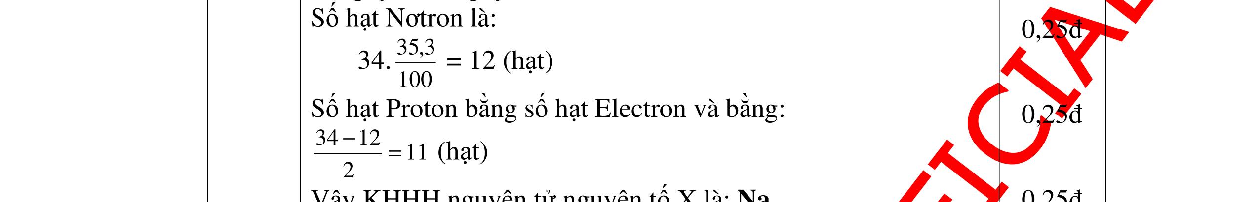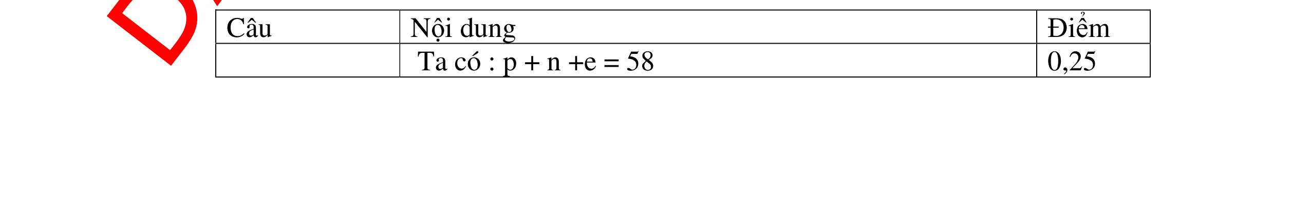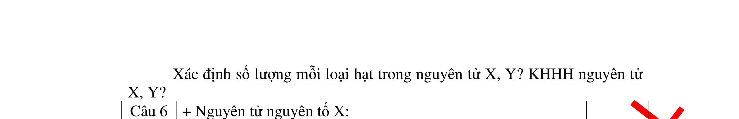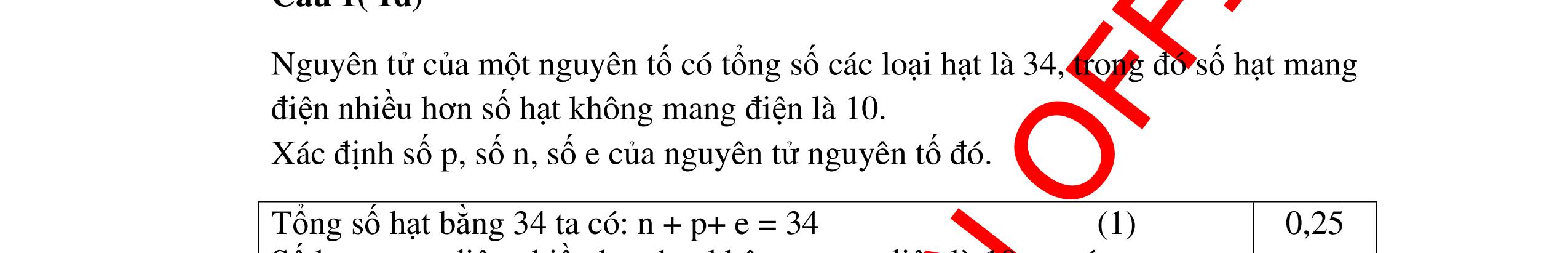 DẠYKÈMQUYNHƠNOFFICIAL Câu6. Nguyên tử X có tổng các hạt là 52 trong đó số hạt mang điện nhiều hơn số hạt không mang điện là 16 hạt. Hãy xác định số hạt p, n e trong nguyên tử X. Câu Hướngdẫnchấm Điểm 6 Ta có p + n + e = 52 P + e – n = 16 0.25 Vì p = e nên : 2p + n = 52 2p – n = 16 0.25 Suy ra 4p = 68 Suy ra p = e = 17 , n = 18 0.5 Câu7. Nguyên tử của một nguyên tố có tổng số các loại hạt là 34, trong đó số hạt mang điện nhiều hơn số hạt không mang điện là 10. Tính thành phần phần trăm về số lượng của các hạt trong nguyên tử nguyên tố đó. Câu Hướngdẫnchấm Điểm 7 Tổng số hạt bằng 34 ta có: n + p+ e = 34 (1) 0.25 Số hạt mang điện nhiều hơn hạt không mang điện là 10, ta có: p+e – n = 10 ( 2) Mà số p = số e ( 3) 0.25 ta có: p = e = 11, n = 12 0.5 Câu8. Một nguyên tử nguyên tố X có tổng số lượng các hạt là 34, trong đó số hạt không mang điện chiếm 35,3%. Một nguyên tử nguyên tố Y có tổng số lượng các hạt là 52, trong đó số hạt mang điện nhiều hơn số hạt không mang điện là 16 hạt. Xác định số lượng mỗi loại hạt trong nguyên tử X, Y? KHHH nguyên tử X, Y? Câu Hướngdẫnchấm Điểm + Nguyên tử nguyên tố X: Số hạt Nơtron là: 34. 100 35 = 12 (hạt) Số hạt Proton bằng số hạt Electron và bằng: 11 2 3412 = (hạt) Vậy KHHH nguyên tử nguyên tố X là: Na. 0,5 + Nguyên tử nguyên tố Y: Gọi số hạt Proton là Z, số hạt Nơtron là N số hạt Electron là Z. Tổng số lượng các hạt là: 2Z + N = 52 (1) 0,5