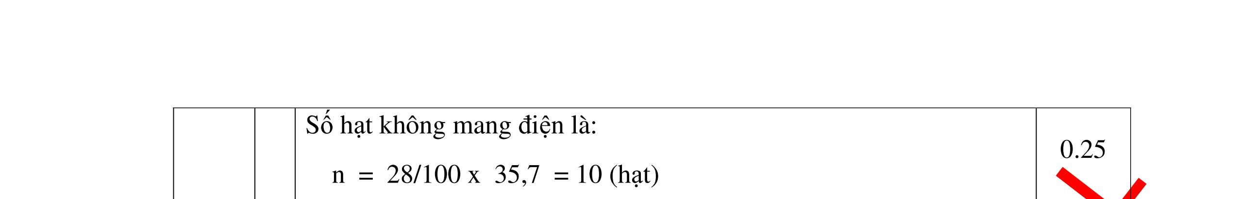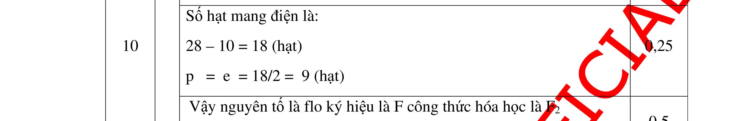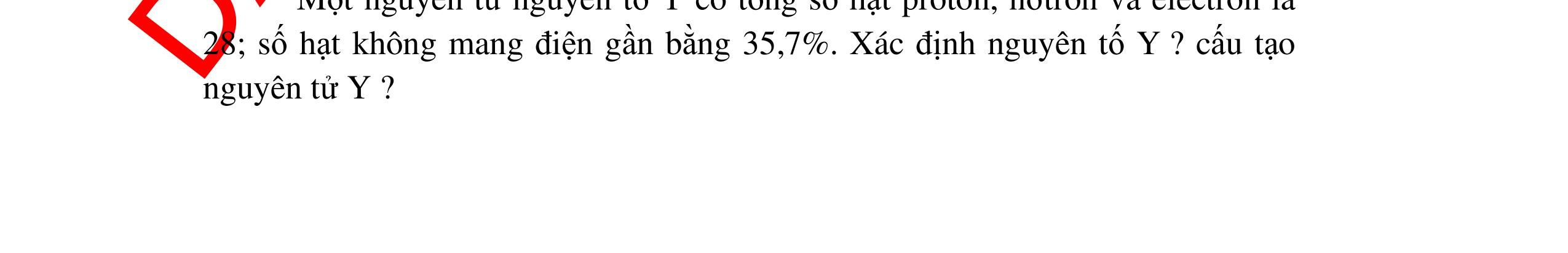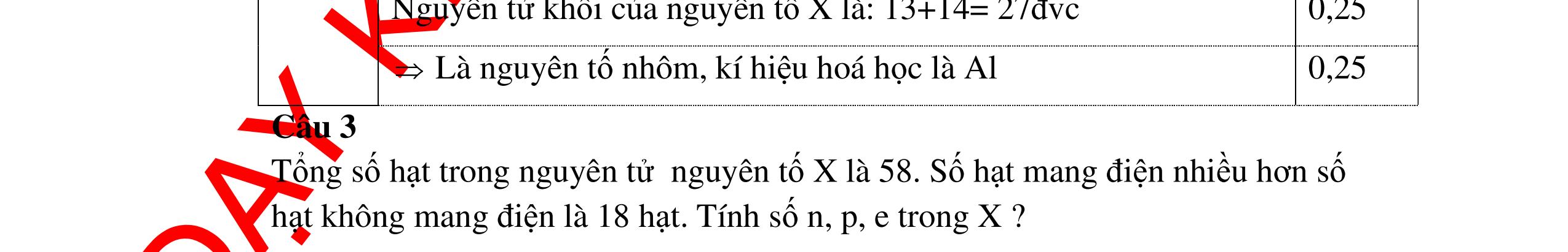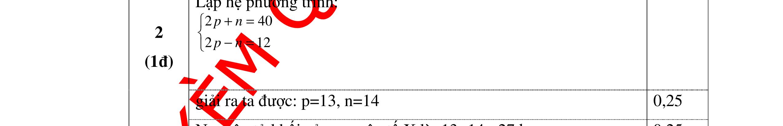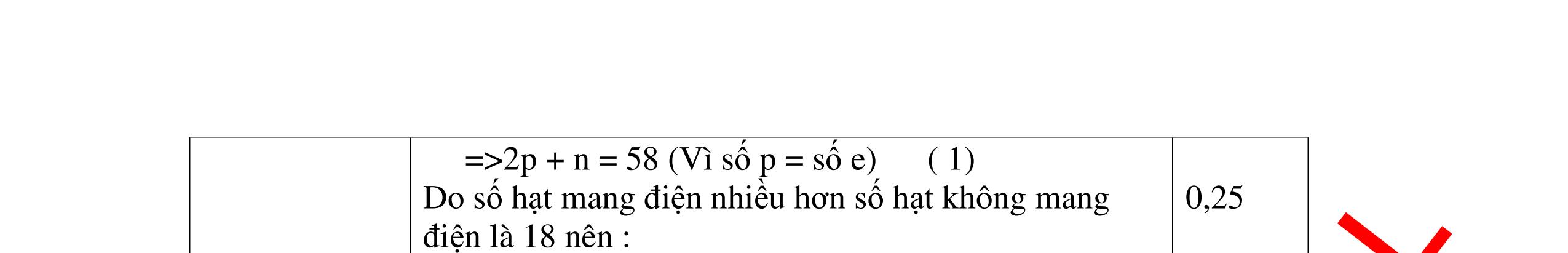 DẠYKÈMQUYNHƠNOFFICIAL Câu6. Nguyên tử X có tổng các hạt là 52 trong đó số hạt mang điện nhiều hơn số hạt không mang điện là 16 hạt. Hãy xác định số hạt p, n e trong nguyên tử X. Câu Hướngdẫnchấm Điểm 6 Ta có p + n + e = 52 P + e – n = 16 0.25 Vì p = e nên : 2p + n = 52 2p – n = 16 0.25 Suy ra 4p = 68 Suy ra p = e = 17 , n = 18 0.5 Câu7. Nguyên tử của một nguyên tố có tổng số các loại hạt là 34, trong đó số hạt mang điện nhiều hơn số hạt không mang điện là 10. Tính thành phần phần trăm về số lượng của các hạt trong nguyên tử nguyên tố đó. Câu Hướngdẫnchấm Điểm 7 Tổng số hạt bằng 34 ta có: n + p+ e = 34 (1) 0.25 Số hạt mang điện nhiều hơn hạt không mang điện là 10, ta có: p+e – n = 10 ( 2) Mà số p = số e ( 3) 0.25 ta có: p = e = 11, n = 12 0.5 Câu8. Một nguyên tử nguyên tố X có tổng số lượng các hạt là 34, trong đó số hạt không mang điện chiếm 35,3%. Một nguyên tử nguyên tố Y có tổng số lượng các hạt là 52, trong đó số hạt mang điện nhiều hơn số hạt không mang điện là 16 hạt. Xác định số lượng mỗi loại hạt trong nguyên tử X, Y? KHHH nguyên tử X, Y? Câu Hướngdẫnchấm Điểm + Nguyên tử nguyên tố X: Số hạt Nơtron là: 34. 100 35 = 12 (hạt) Số hạt Proton bằng số hạt Electron và bằng: 11 2 3412 = (hạt) Vậy KHHH nguyên tử nguyên tố X là: Na. 0,5 + Nguyên tử nguyên tố Y: Gọi số hạt Proton là Z, số hạt Nơtron là N số hạt Electron là Z. Tổng số lượng các hạt là: 2Z + N = 52 (1) 0,5