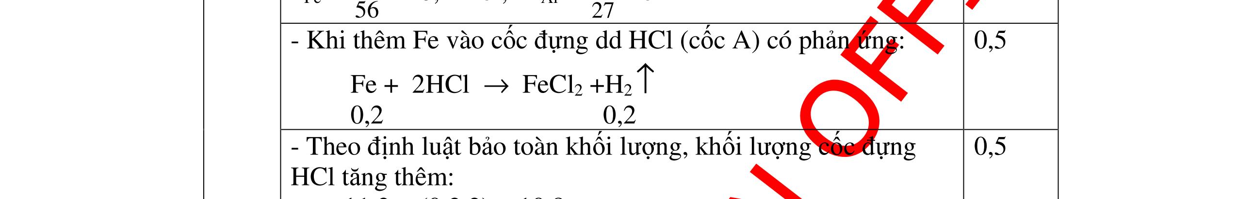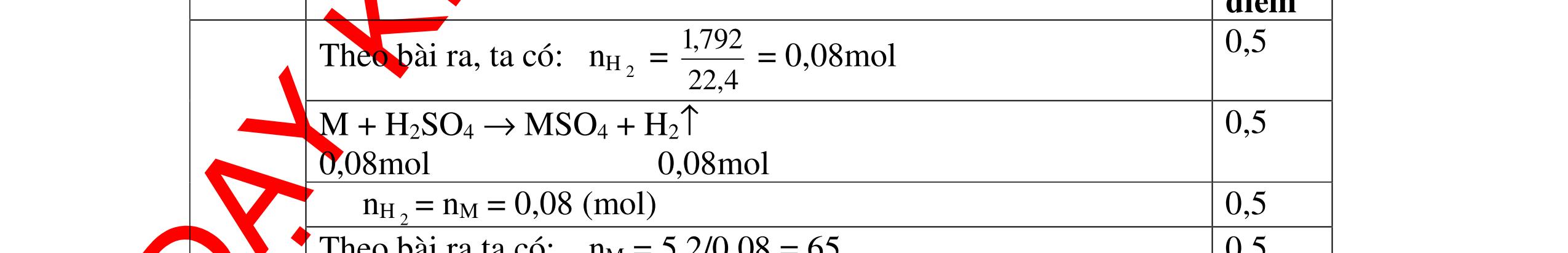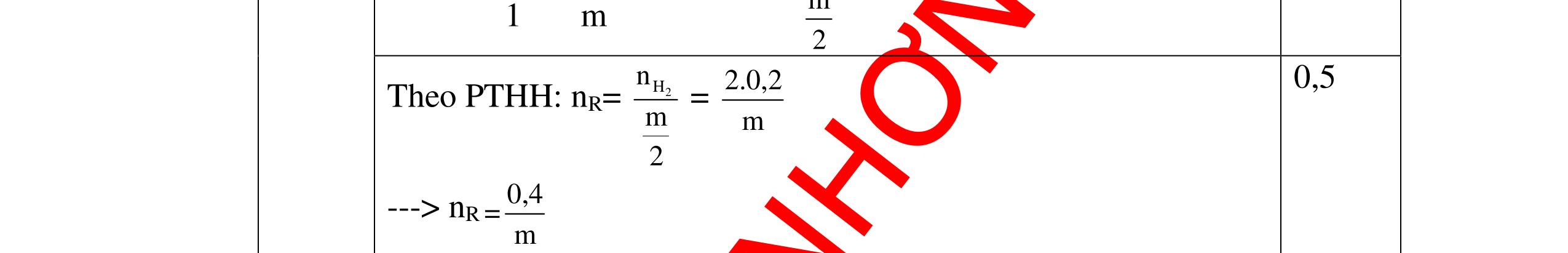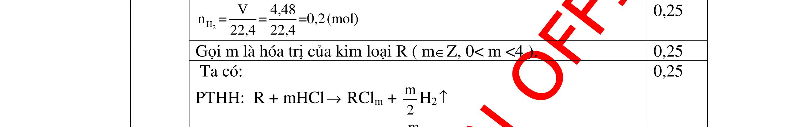 0.25 A + 2HCl →ACl2+ H2 xmol 2xmol 2Al + 6HCl →2AlCl3+ 3H2 5x mol 15xmol 0,5 Theo giả thiết đề bài ta có: Khối lượng kim loại: A.x+ 27.5.x = 4 gam (1) Số mol HCl= 2x+15x = 0,34 mol (2) 0,5 Giải Phương trình (2) ta được x=0,02 mol 0,25 Thay x = 0,02 vào phương trình (1) A.0,02+ 27.5.0,02=4 =>A=65 A là kim loại Zn (kẽm) 0,5 Vậy kim loại hóa trị II là Zn (kẽm) 0,25 Câu 17:(2,5) Cho một lượng kim loại R có khối lượng 11,2 gam vào dung dịch HCl dư thì thu được 4,48 l khí Hiđrô. Xác định kim loại R? 17 2H V4,48 n===0,2(mol) 22,422,4 0,25 Gọi m là hóa trị của kim loại R ( m∈Z, 0< m <4 ). 0,25