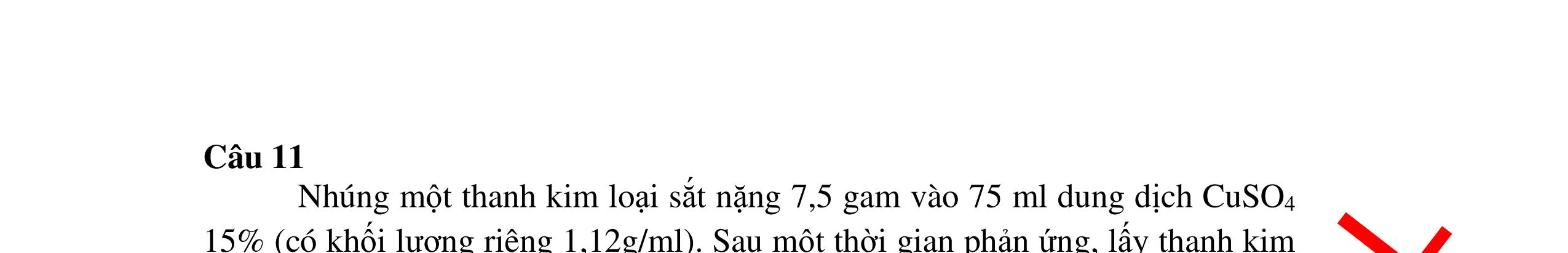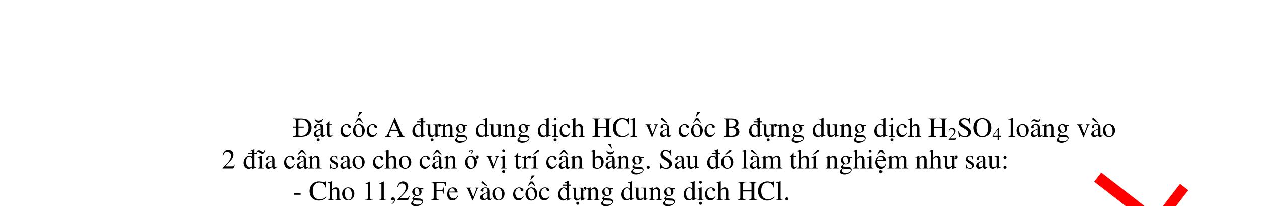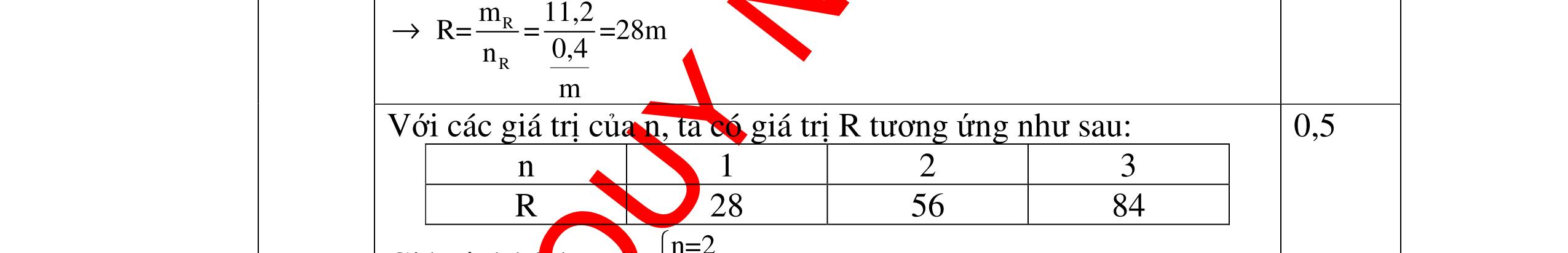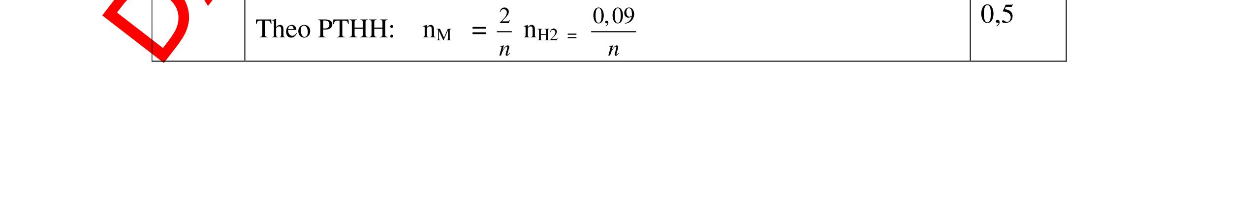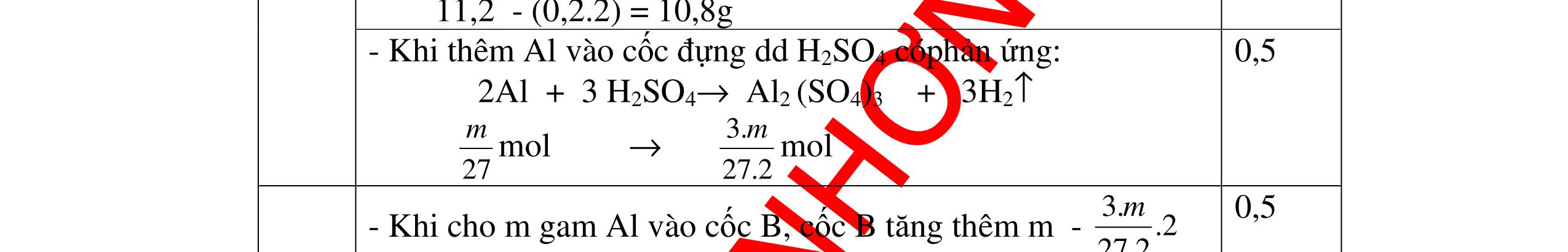 0.25 A + 2HCl →ACl2+ H2 xmol 2xmol 2Al + 6HCl →2AlCl3+ 3H2 5x mol 15xmol 0,5 Theo giả thiết đề bài ta có: Khối lượng kim loại: A.x+ 27.5.x = 4 gam (1) Số mol HCl= 2x+15x = 0,34 mol (2) 0,5 Giải Phương trình (2) ta được x=0,02 mol 0,25 Thay x = 0,02 vào phương trình (1) A.0,02+ 27.5.0,02=4 =>A=65 A là kim loại Zn (kẽm) 0,5 Vậy kim loại hóa trị II là Zn (kẽm) 0,25 Câu 17:(2,5) Cho một lượng kim loại R có khối lượng 11,2 gam vào dung dịch HCl dư thì thu được 4,48 l khí Hiđrô. Xác định kim loại R? 17 2H V4,48 n===0,2(mol) 22,422,4 0,25 Gọi m là hóa trị của kim loại R ( m∈Z, 0< m <4 ). 0,25