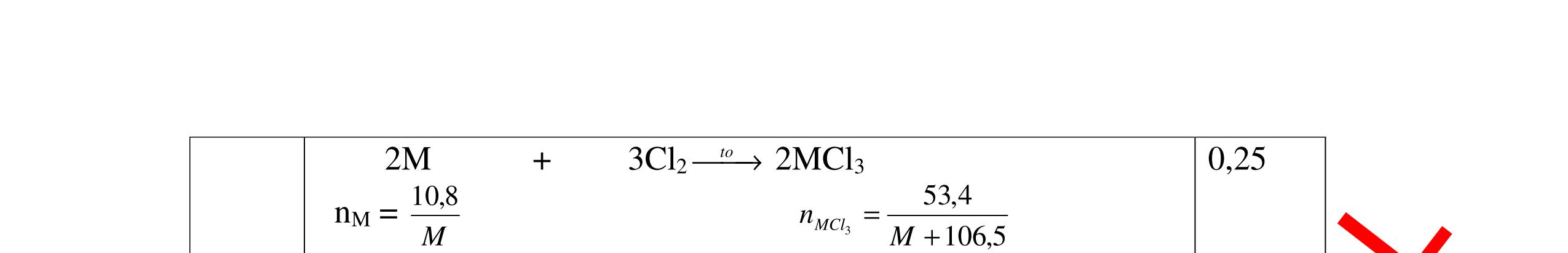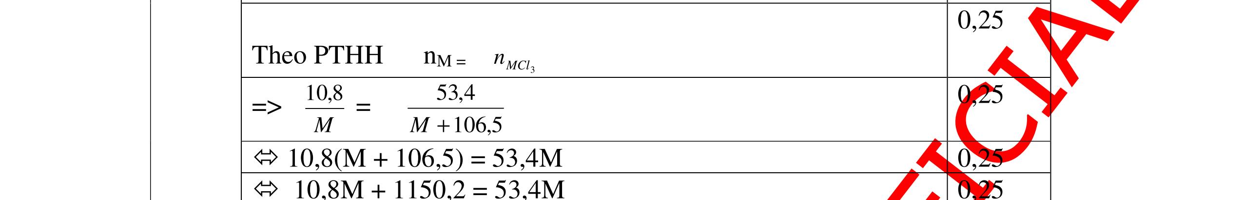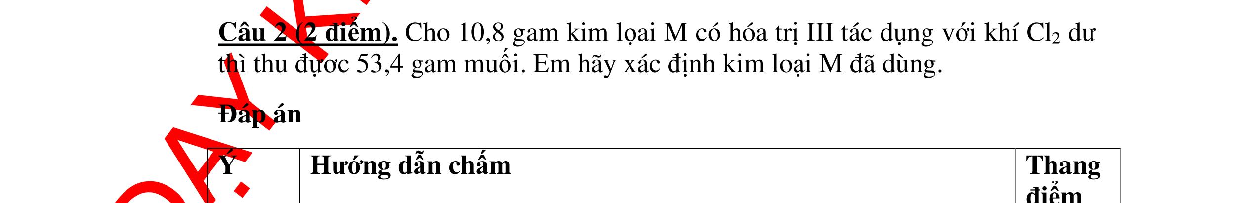 DẠYKÈMQUYNHƠNOFFICIAL n 2H = 0,3 mol → n R = 0,6 n = 5,4 M → M = 9n Với n = 1,2,3,… Ta tìm ra KL mol của kim loại R: n 1 2 3 M 9 (loại) 18 (loại) 27 (Al: Nhôm) Vậy kim loại R cần tìm là Nhôm (Al) 0,75 0,5 Câu 10: Một hợp chất khí có thành phần % theo khối lượng là 82,35%N và 17,65% H. Xác định công thức hóa học của chất đó. Biết tỉ khối của hợp chất khí với hidro bằng 8,5. Bài làm: 10. 2,5 điểm Khối lượng mol của hợp chất khí bằng: M = d 2 M H .2= 8,5.2 = 17 (g/mol) 17.82,3517.17,5614;3 100100N H mgammgam ==== Số mol nguyên tử của mỗi nguyên tố trong 1 mol hợp chất: 143 1;3 141 N H NH NH mm nmolnmol MM ====== Trong 1 phân tử hợp chất khí trên có: 1mol nguyên tử N và 3 mol nguyên tử H Công thức hóa học của hợp chất trên là NH3 0,5 0,5 0,5 0,5 0,5 Câu 11: Cho một luồng khí clo dư tác dụng với 9,2g kim loại sinh ra 23,4g muối kim loại hoá trị I. Hãy xác định kim loại hoá trị I và muối kim loại đó. Bài làm: 11. Đặt M là Kí hiệu hóa học của kim loại hoá trị I. 0,25