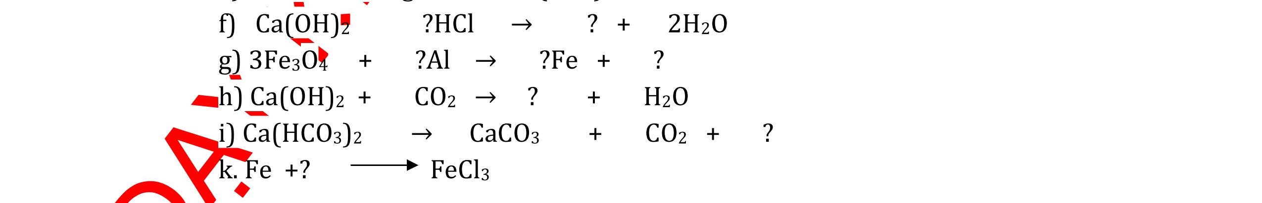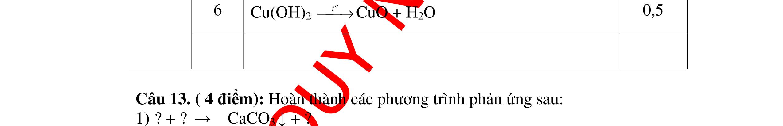 DẠYKÈMQUYNHƠNOFFICIAL Câu12:(5điểm) Hoàn thành các phương trình phản ứng sau và ghi rõ điều kiện xảy ra phản ứng (nếu có): 1. Fe3O4 + ...... - - -> ..... + H2O 2. KMnO4 - - -> ..... + ..... + O2 3. HCl + CaCO3 - - -> CaCl2 + H2O + ... 4. Na2CO3 + CaCl2 - - -> CaCO3 + ..... 5. CaO + HNO3 -----> Ca(NO3)2 + ....... 6. Fe + O2 ----> ...... 7. P2O5 + H2O - - -> ........ 8. Al + HCl - - -> ....... + ....... 9. P2O5 + .......... → H3PO4 10. Fe + ....... ot → Fe3O4 12 (5 điểm) 1 Fe3O4 + 4H2 0t → 3Fe + 4H2O 0.5 2 2KMnO4 0t → K2MnO4 + MnO2 + O2 ↑ 0.5 3 2HCl + CaCO3 → CaCl2 + H2O + CO2 ↑ 0.5 4 Na2CO3 + CaCl2 → CaCO3 + 2NaCl 0.5 5 CaO + 2HNO3 → Ca(NO3)2 + H2O 0.5 6 3Fe + 2O2 0t → Fe3O4 0.5 7 P2O5 + 3H2O → 2H3PO4 0.5 8 2Al + 6HCl → 2AlCl3 + 3H2 ↑ 0.5 8). 2Na + 2H2O → 2NaOH + H2 0,5 9). P2O5 + 3H2O → 2H3PO4 0,5 10) 3 Fe + 2 O2 ot → Fe3O4 0,5