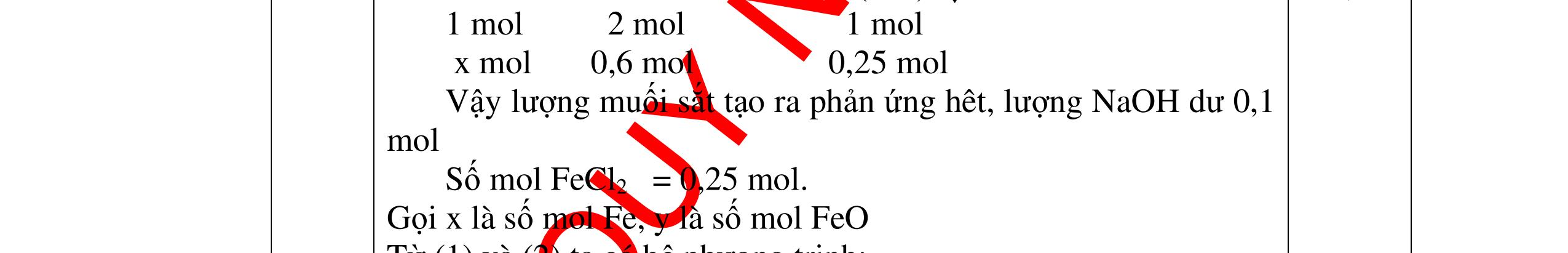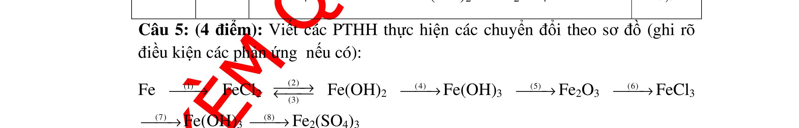 DẠYKÈMQUYNHƠNOFFICIAL 1. P + KClO3 → P2O5 + KCl 2. Fe3O4 + HNO3 → Fe(NO3)3 + NO2 + H2O 3. S + NaOH → Na2S + Na2SO4 + H2O 4. FeClx + Cl2 → FeCl3 5. FexOy + H2 ------> ….. + ……. 6. FexOy + HCl ------> FeCl2y/x + ……. 7. Fe3O4 + HCl - - -> …….. + ……+ …… 8. FeS2 + O2 → …… + ……. 9. Fe2O3 + 3H2 to 2Fe + 3H2O 10. S + NaOH → Na2S + ………… + H2O 8 (5,0đ) 1 6P + 5KClO3 → 3P2O5 + 5KCl 0,5 2 Fe3O4 + 10HNO3 → 3Fe(NO3)3 + NO2↑ + 5H2O 0,5 3 4S + 8NaOH → 3Na2S + Na2SO4 + 4H2O 0,5 4 2FeClx + 62x () 2 Cl2 → 2FeCl3 0,5 5 FexOy +2yHCl → xFeCl2y/x +yH2O 0,5 6 FexOy +yH2 0t → xFe +yH2O 0,5 7 Fe3O4 + 8HCl → FeCl2 + 2FeCl3 + 4H2O 0,5 8 4FeS2 + 11O2 → 2 Fe2O3 + 8SO2↑ 0,5 9 Fe2O3 + 3H2 to 2Fe + 3H2O 0,5 10 S + NaOH → Na2S + Na2SO4 + H2O 0,5 Câu9:(5 điểm) a.Viết các phương trình phản ứng cho dãy chuyển đổi sau: b. Viết 2 phương trình phương pháp khác nhau điều chế khí H2 Câu2 (1) Fe + 2HCl → FeCl2 + H2 (2) FeCl2 + 2NaOH → Fe(OH)2↓ + 2NaCl Mỗi PTHH () () () () () () 2 2 32 56 3 323 FeClFeOH FeClFeOHFeO → ← →→ Fe (1) (4) (7) (9) (8)