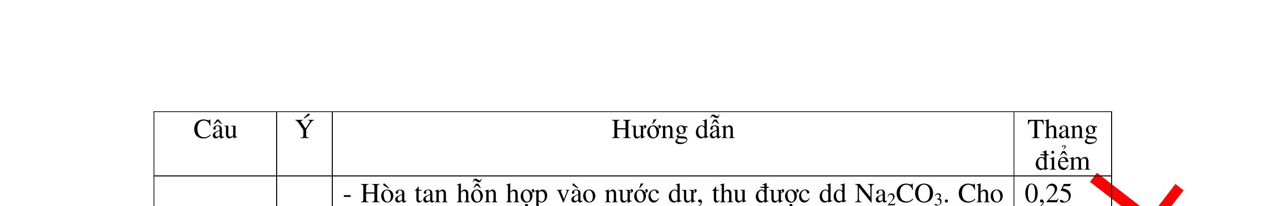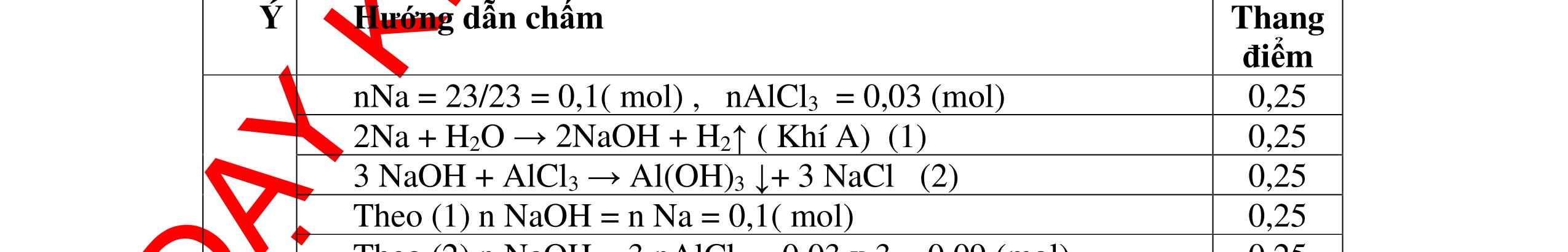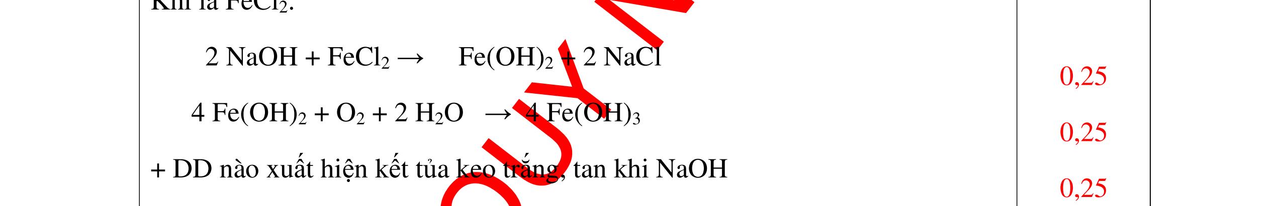 DẠYKÈMQUYNHƠNOFFICIAL Nước sinh ra ở trên tác dụng với Na2O H2O + Na2O → 2NaOH 0,5 Nước sinh ra ở trên tác dụng với P2O5 3H2O + P2O5 → 2H3PO4 Câu4. Cho 4 mẩu Na vào 4 dung dịch sau: ZnCl2, FeCl2, KCl, MgSO4. Viết phương trình phản ứng xảy ra? Câu Hướng dẫn chấm Điểm 4 Trước hết Na tác dung với nước 2Na + 2H2O 2NaOH + H2 0.5 Sau đó 2NaOH + ZnCl2 Zn(OH)2 + 2NaCl 2NaOH + Zn(OH)2 Na2ZnO2 + 2H2O 2NaOH + FeCl2 Fe(OH)2 + 2NaCl 0.25 0.25 0.25 Nếu để trong không khí : 4Fe(OH)2 + 2H2O + O2 4Fe(OH)3 KCl + NaOH Không xảy ra 2NaOH + MgCl 2 Mg(OH) 2 + 2NaCl 0.25 0.25 0.25 Câu5.