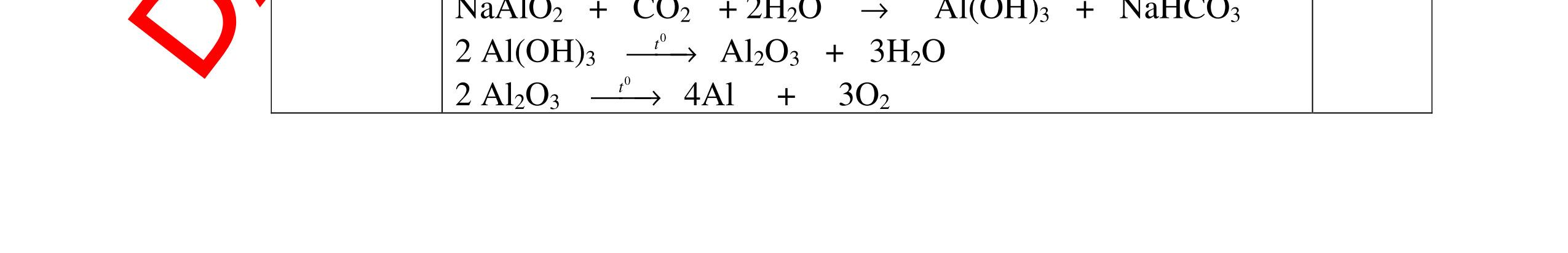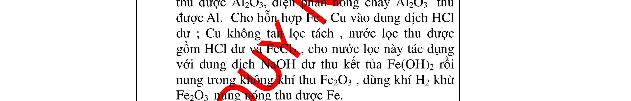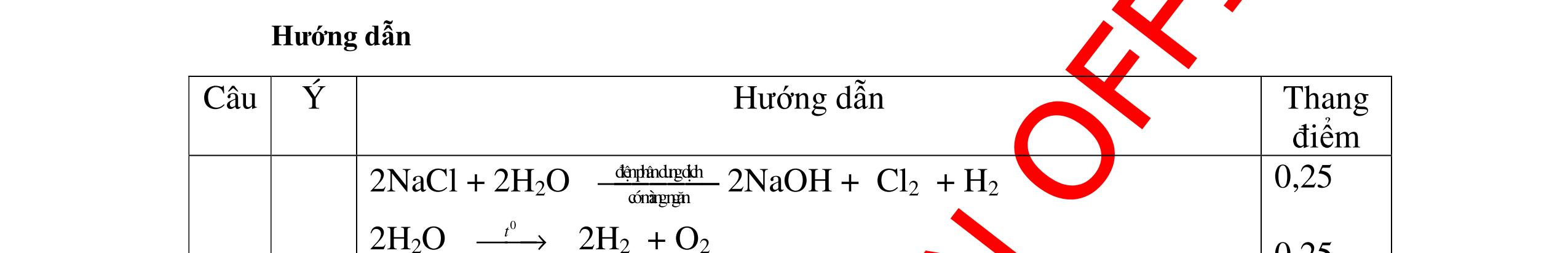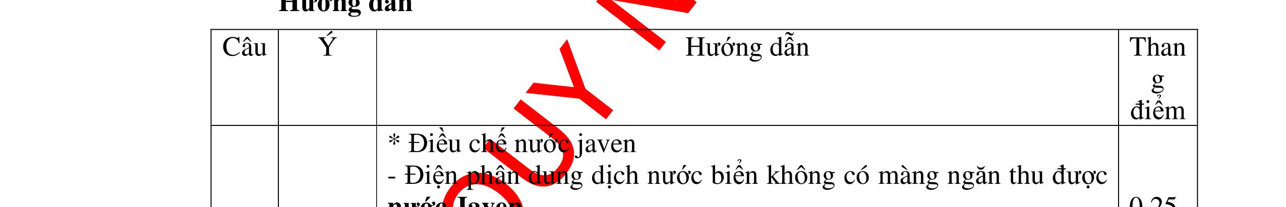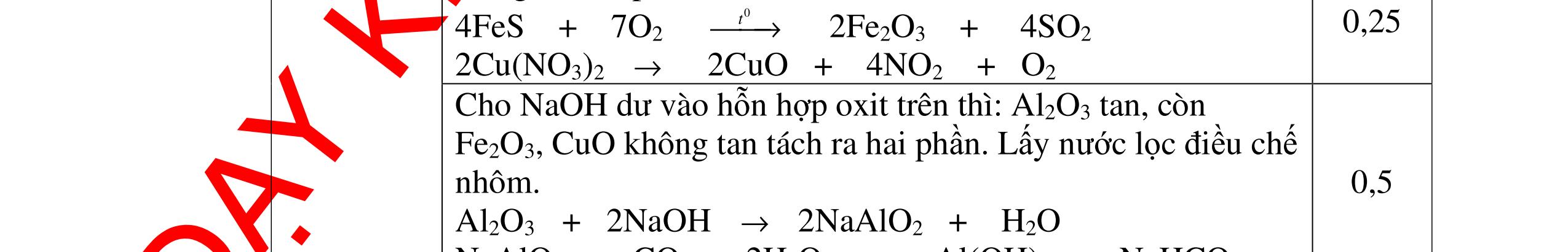 DẠYKÈMQUYNHƠNOFFICIAL H2 + Cl2 -> 2HCl 4FeS2 + 11O2 t0 8SO2↑ + 2Fe2O3 Fe2O3 + 6HCl -> 2FeCl3 + 3H2O 0,25 0,5 0,25 FeCl3 + 3NaOH -> Fe(OH)3 + 3NaCl 0,25 SO2 + 2NaOH -> Na2SO3 + H2O 0,25 Câu7. Từ hỗn hợp FeS, Cu(NO3)2, Al2O3 và các chất phụ có đủ. Viết các phương trình phản ứng điều chế từng kim loại riêng biệt. Câu Hướng dẫn chấm Điểm 7 Nung hỗn hợp thu được các oxit Fe2O3, CuO, Al2O3 4FeS + 7O2 → 2Fe2O3 + 4SO2 2Cu(NO3)2 → 2CuO + 4NO2 + O2 0.5 Cho NaOH dư vào hỗn hợp oxit trên thì: Al2O3 tan, còn Fe2O3, CuO không tan tách ra hai phần. Lấy nước lọc điều chế nhôm. Al2O3 + 2NaOH → 2NaAlO2 + H2O NaAlO2 + CO2 + 2H2O → Al(OH)3 + NaHCO3 2Al(OH)3 0t → Al2O3 + 3H2O 2Al2O3 → 4Al + 3O2 0.5 - Cho dòng khí CO qua hỗn hợp Fe2O3, CuO thu được hỗn hợp 2 kim loại CuO + CO → Cu + CO2 Fe2O3 + CO → Fe + CO2 0.25 - Cho hỗn hợp Cu, Fe vào dung dịch HCl thì chỉ có Fe tan được, tách ra Cu Fe + HCl → FeCl2 + H2 0.25 Từ FeCl2 điều chế ra Fe: FeCl2 + 2NaOH → Fe(OH)2 + 2NaCl Fe(OH)2 0t → FeO + H2O FeO 0t → Fe + CO2 0.5 Câu8. Từ pirit sắt, nước biển, không khí và các thiết bị cần thiết khác. Hãy viết các phương trình hóa học điều chế các chất: nước Javen, FeSO4, FeCl3. Câu Hướng dẫn chấm Điểm 8 Điện phân dung dịch NaCl Có màng ngăn: 2NaCl + 2H2O ®iÖn ph©n dung dÞch cã mµng ng¨n → 2NaOH + Cl2 ↑ + H2 ↑ 0,25
