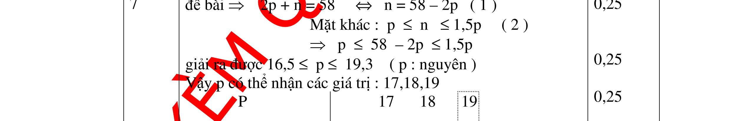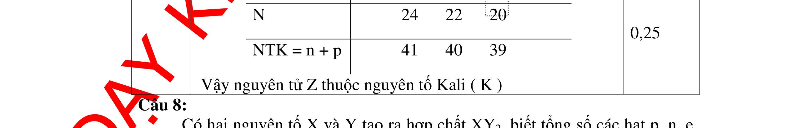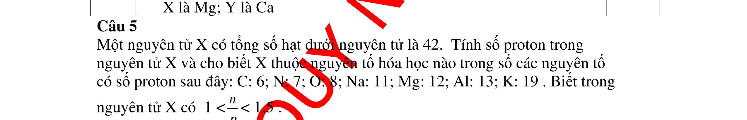 DẠYKÈMQUYNHƠNOFFICIAL Câu Hướngdẫnchấm Điểm 3 - Gọi số hạt trong X: P, N, E; trong Y là : P/. N/, E/ 0.25 Theo giả thiết có hệ PT: // // / 2PN2PN96 2PN2PN32 2P2P16 +++= −+−= −= -> / / 4P4P128 2P2P16 += −+= -> P= 12; P/ = 20 0.5 X là Mg; Y là Ca 0.25 Câu4. Một nguyên tử X có tổng số hạt dưới nguyên tử là 42. Tính số proton trong nguyên tử X và cho biết X thuộc nguyên tố hóa học nào trong số các nguyên tố có số proton sau đây: C: 6; N: 7; O: 8; Na: 11; Mg: 12; Al: 13; K: 19 . Biết trong nguyên tử X có 1 < p n < 1,5 . Câu Hướngdẫnchấm Điểm 4 Nguyên tử nguyên tố X có p + e + n = 42 mà p = e 2p + n = 42 n = 42- 2p. 0.5 Lại có 1< n p < 1,5 => 1< 422 p p < 1,5 1p < 42 – 2p < 1,5p 12 < p < 14 mà p là số nguyên nên p = 13 0.25 Vậy X là nguyên tố nhôm (Al) 0.25 Câu5. Nguyên tố X có tổng các hạt cơ bản là 82. Hạt mang điện nhiều hơn hạt không mang điện là 22. Xác định nguyên tố X. Câu Hướngdẫnchấm Điểm 5 X có : p + e + n = 82 mà p + e - n = 22 0.25 Mặt khác p = e → p = e = 26 → n = 30 0.5 → X là Fe : sắt 0.25